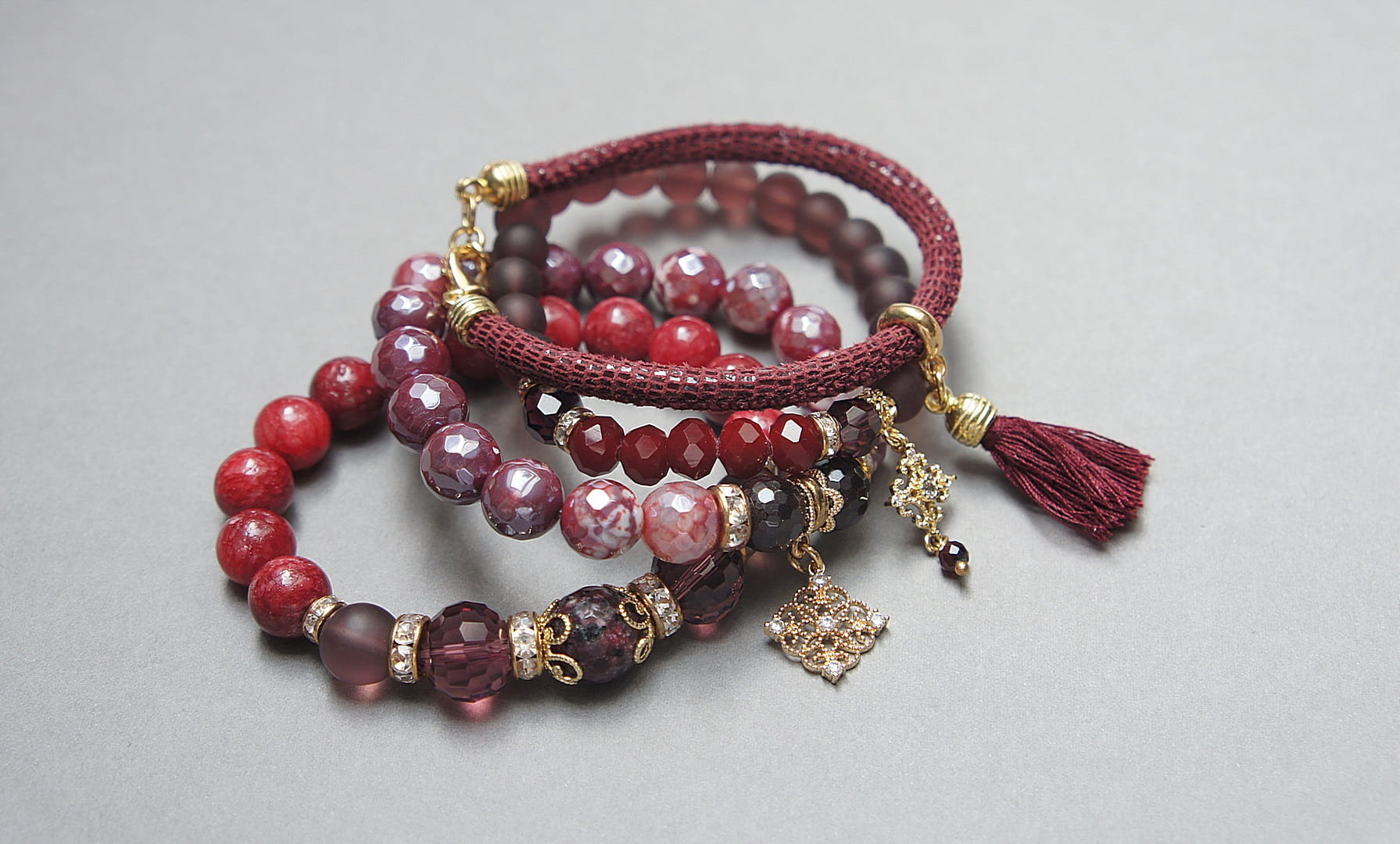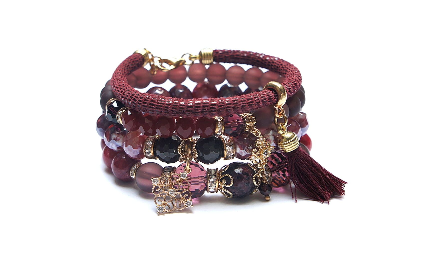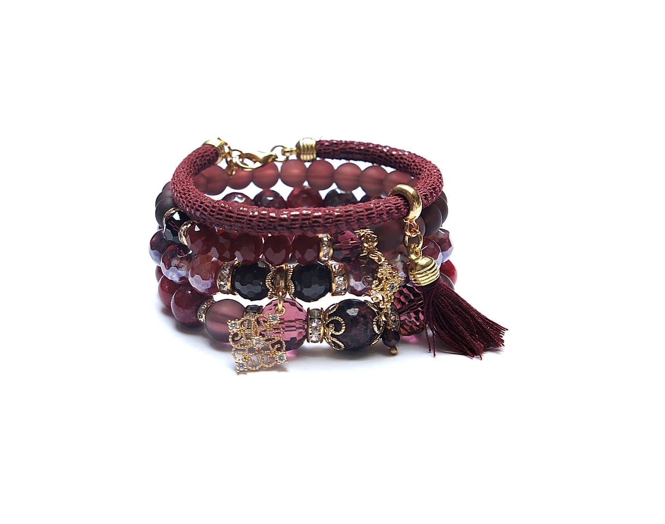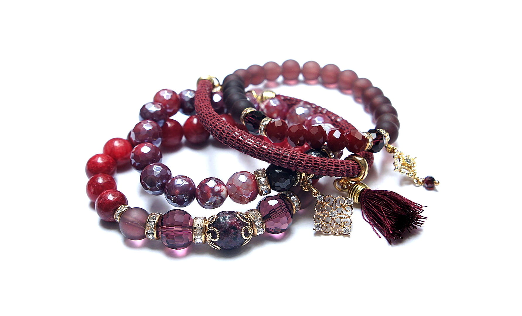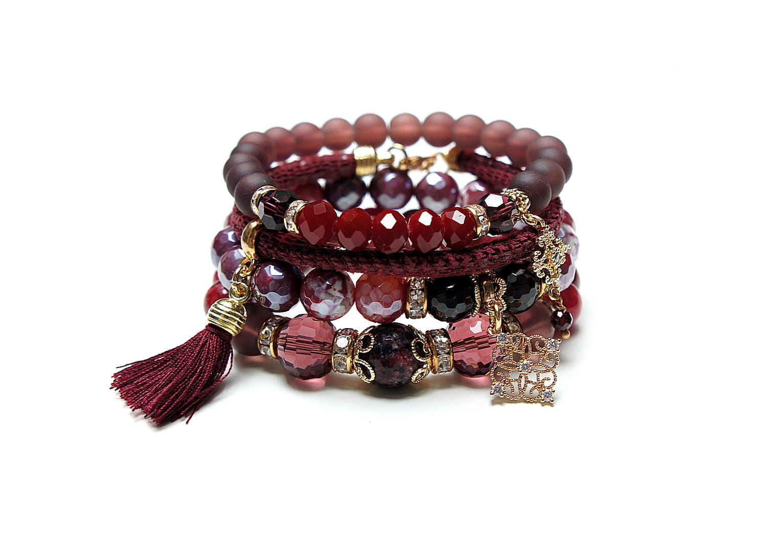 Komplet czterech bransoletek wykonanych z naturalnych kamieni: jadeity [10mm], agat fasetowany platerowany [10mm], granaty [4mm i 10mm], marmur fasetowany [12mm], kryształków fasetowanych [8mm i 12mm], szkła matowego [8mm i 10mm], rzemienia z naturalnej skóry, zawieszek wysadzanych cyrkoniami, chwostu oraz elementów metalowych w kolorze złota. Bransoletki pasują na nadgarstek 16 - 17cm. Biżuteria ozdobnie zapakowana