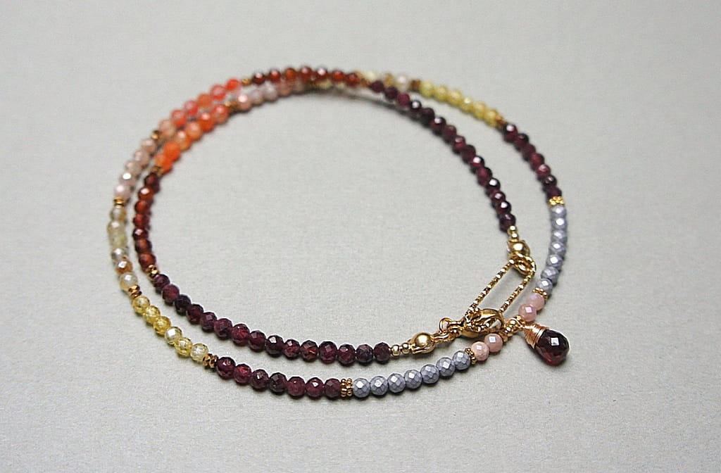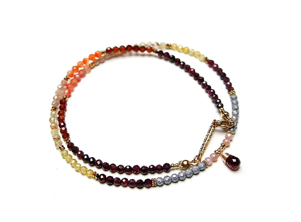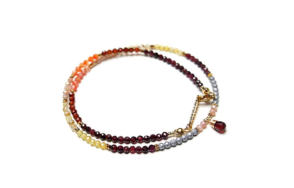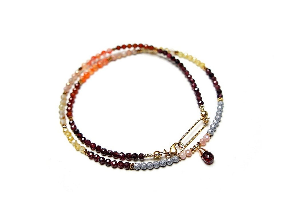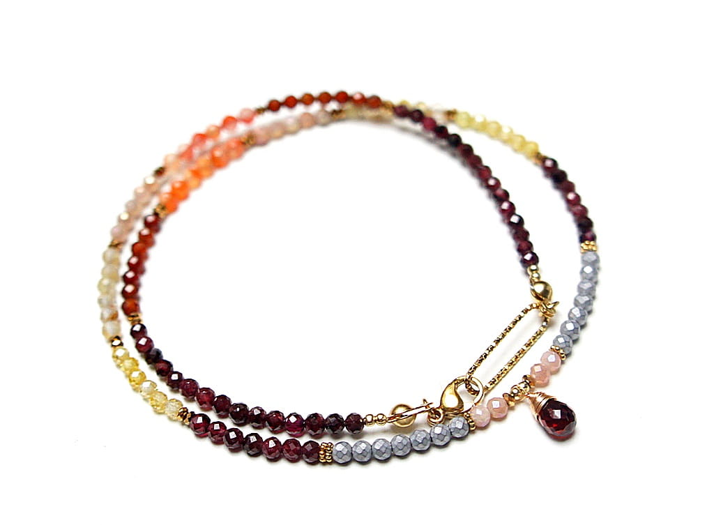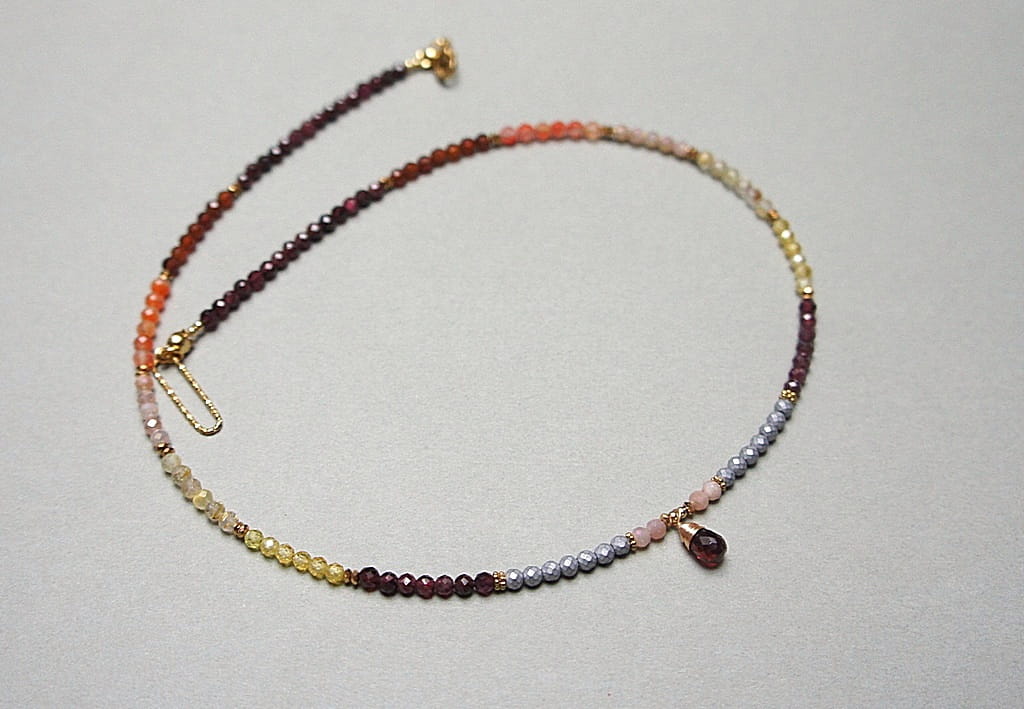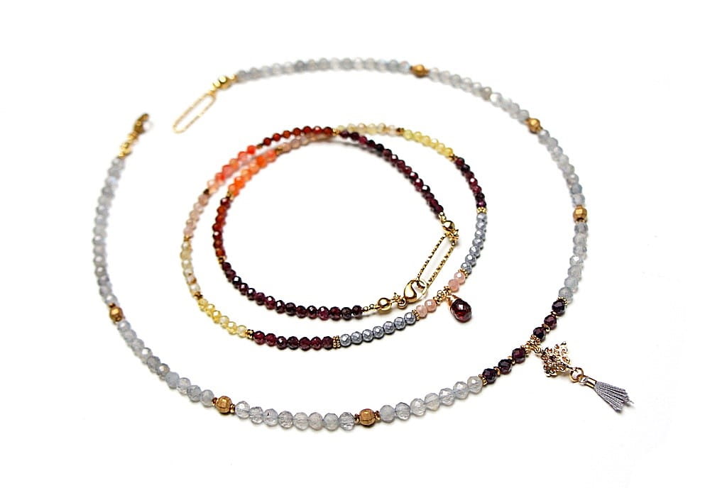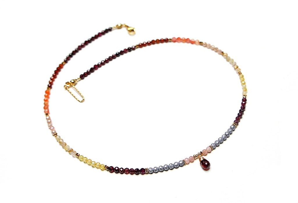 Krótki, delikatny naszyjnik wykonany w całości ze stali szlachetnej pozłacanej oraz naturalnych, szlachetnych kamieni - fasetowane granaty [3mm], cytryn fasetowany [3mm], kamień słoneczny fasetowany [3mm], granat hessonit fasetowany [3mm], hematyt fasetowany [3mm], przekładek z hematytu [1mm], cyrkonii fasetowanych [2,5mm] oraz zawieszki z naturalnym granatem [9mm - brioleta]. Naszyjnik o długości ok. 47cm. Biżuteria ozdobnie zapakowana.