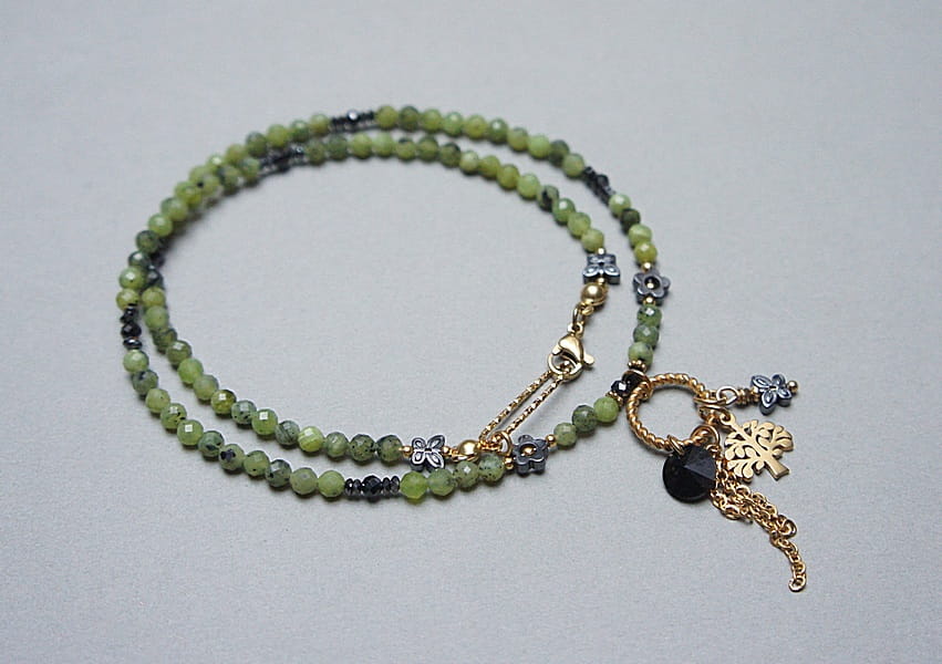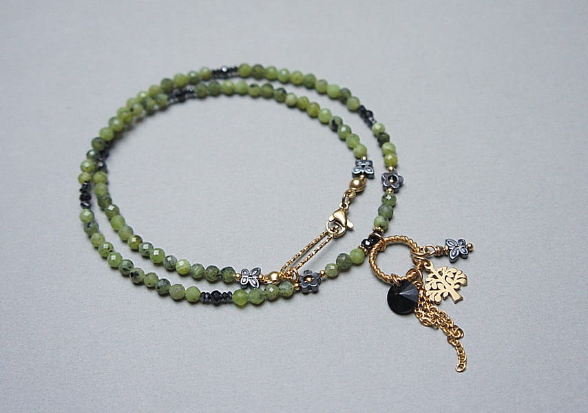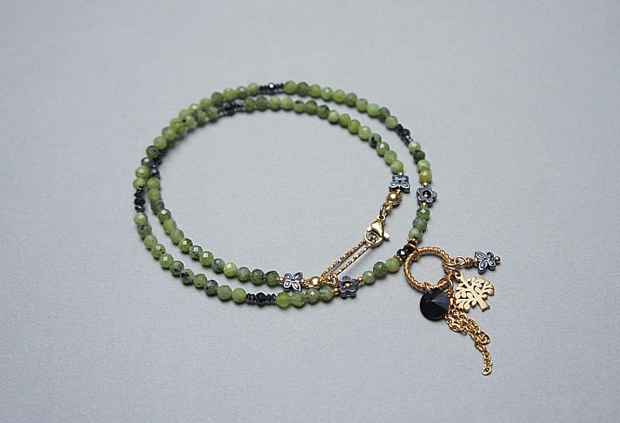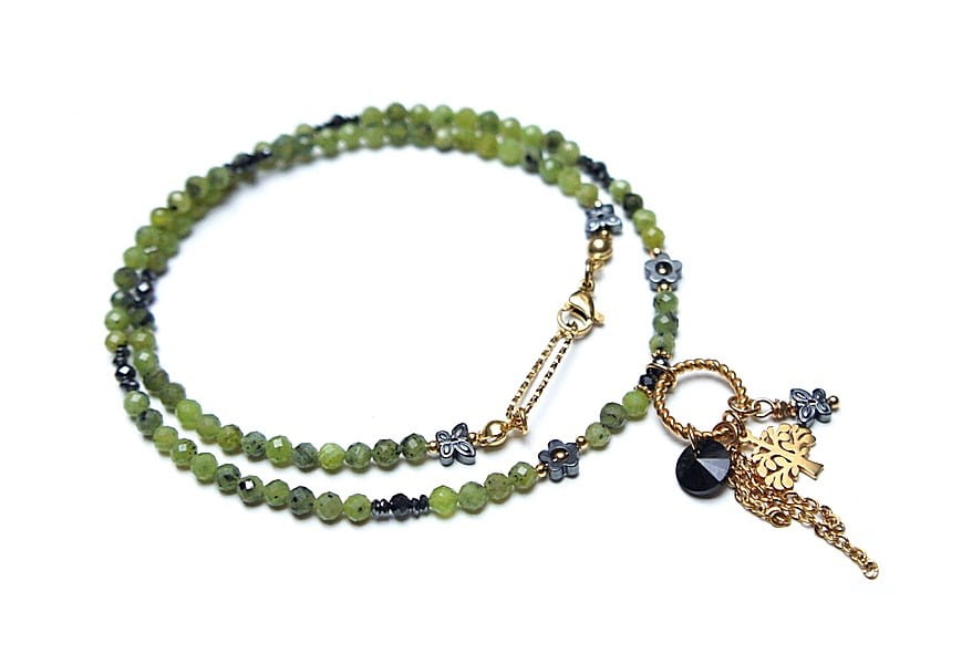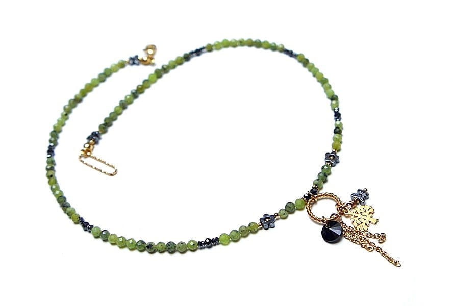 Krótki, delikatny naszyjnik wykonany w całości ze stali szlachetnej pozłacanej oraz naturalnych, szlachetnych kamieni - fasetowany nefrty [3,5mm], cyrkonie fasetowane [3mm], przekładek z hematytu [1mm oraz 6mm - kwiatki i motyle] oraz zawieszki z kryształkiem Swarovski. Naszyjnik o długości ok. 43cm. Biżuteria ozdobnie zapakowana.
