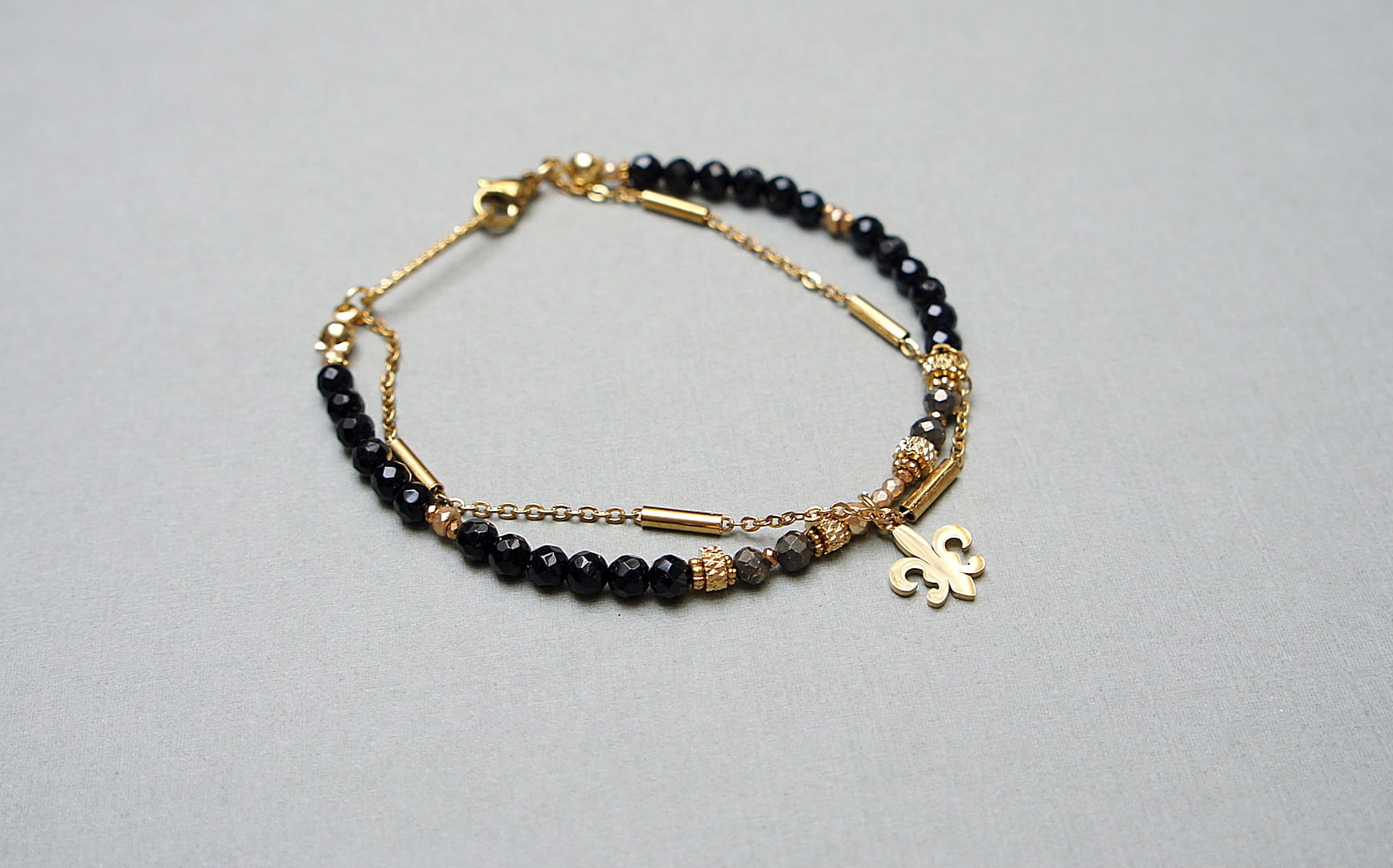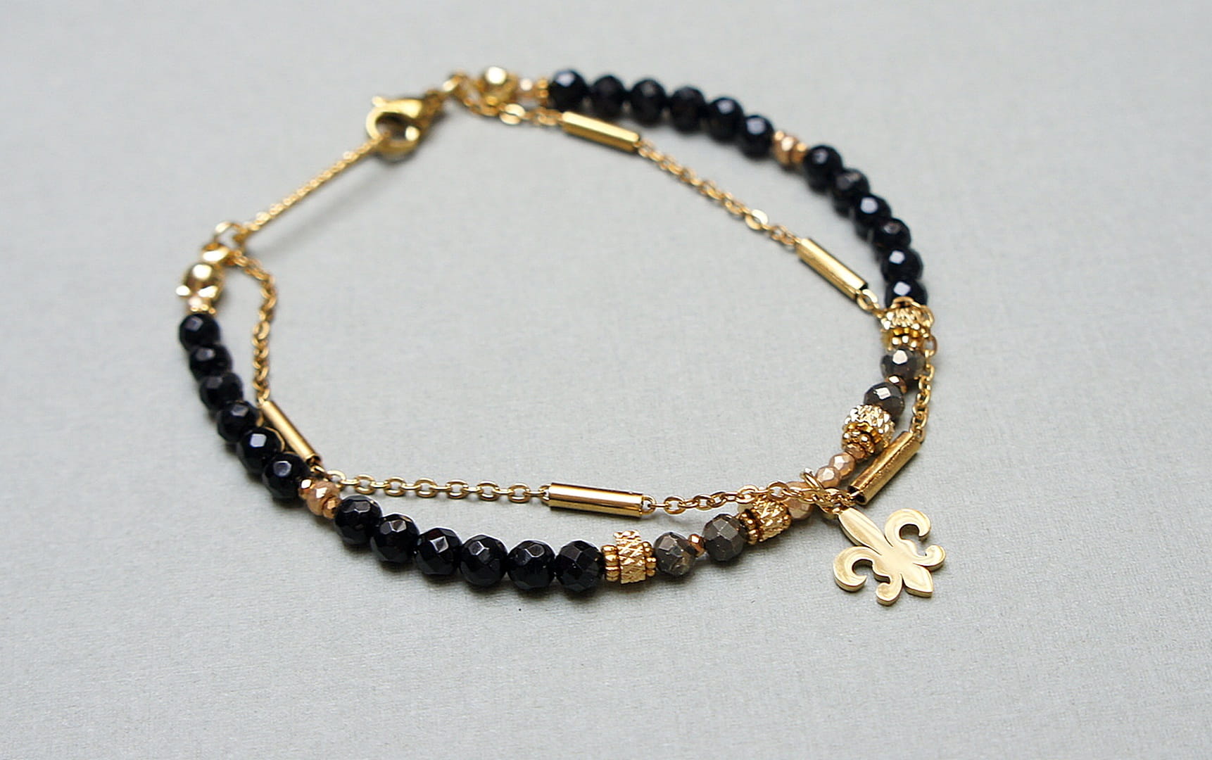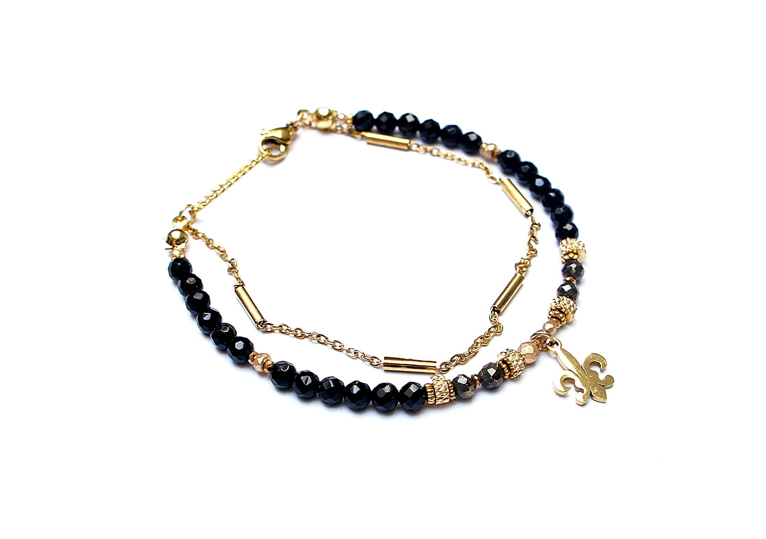 Delikatna bransoletka wykonana w całości ze stali szlachetnej pozłacanej oraz naturalnych, szlachetnych kamieni - fasetowany onyks [śr. 4mm], fasetowane kuleczki hematytu [3mm i 2mm], fasetowany piryt o surowym wyglądzie [3mm] oraz przekładek z hematytu [1mm]. Całkowita długość bransoletki: ok. 19,7cm. Na życzenie możemy pomniejszyć lub powiększyć bransoletkę - wcześniej prosimy o kontakt.