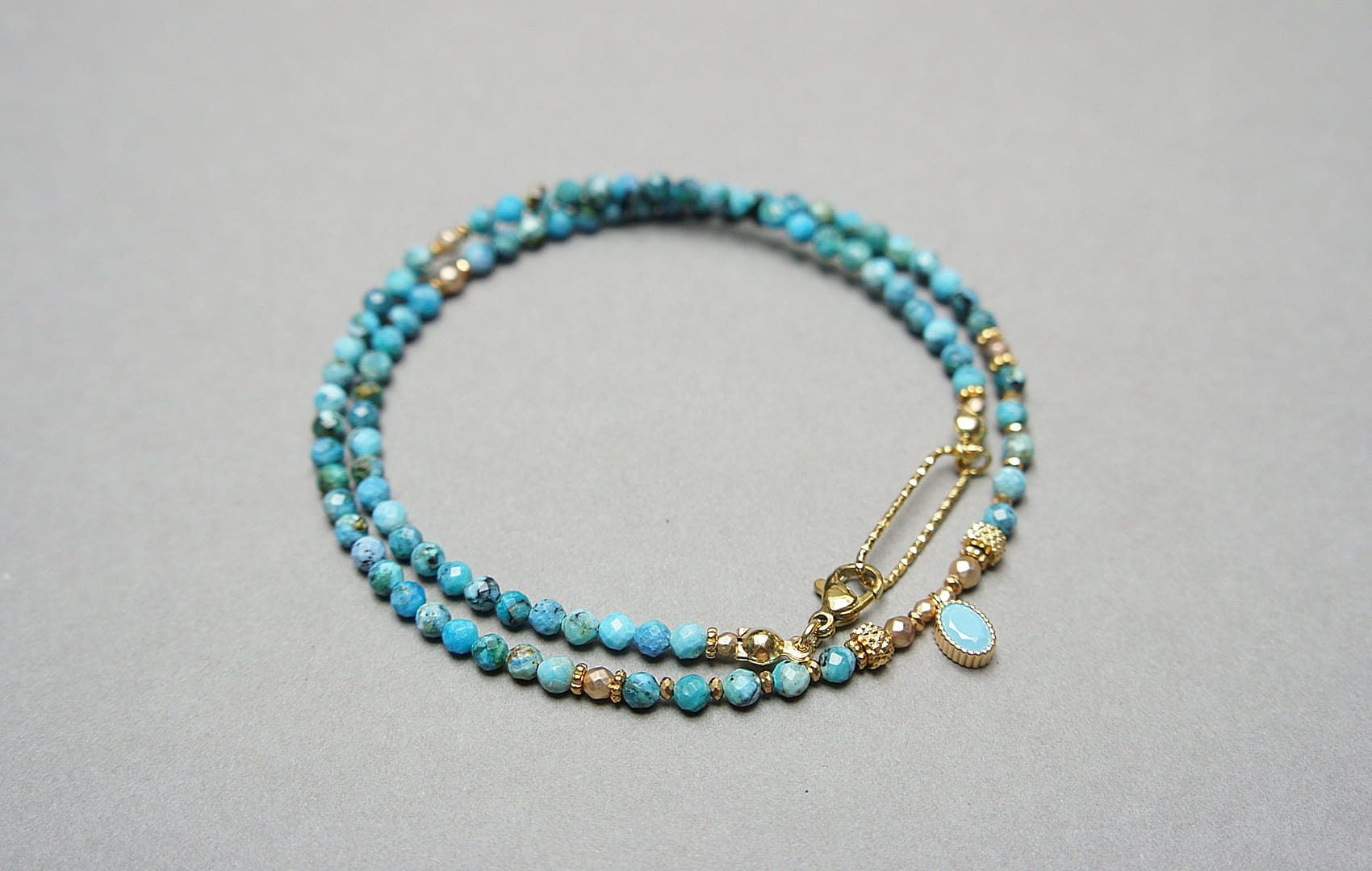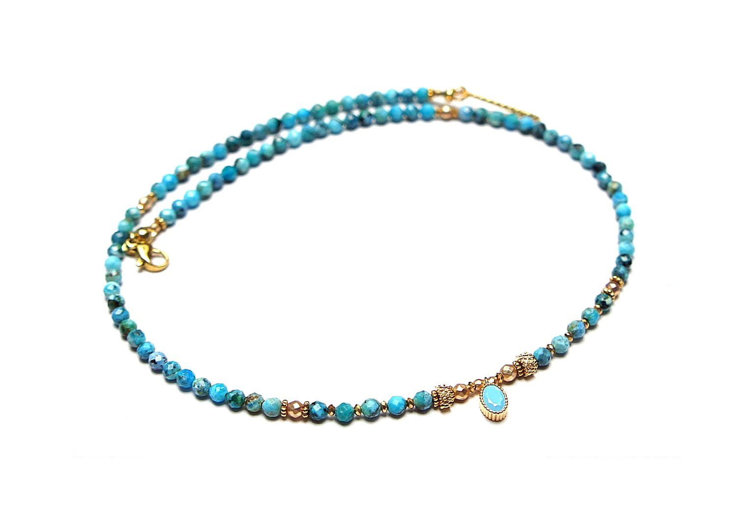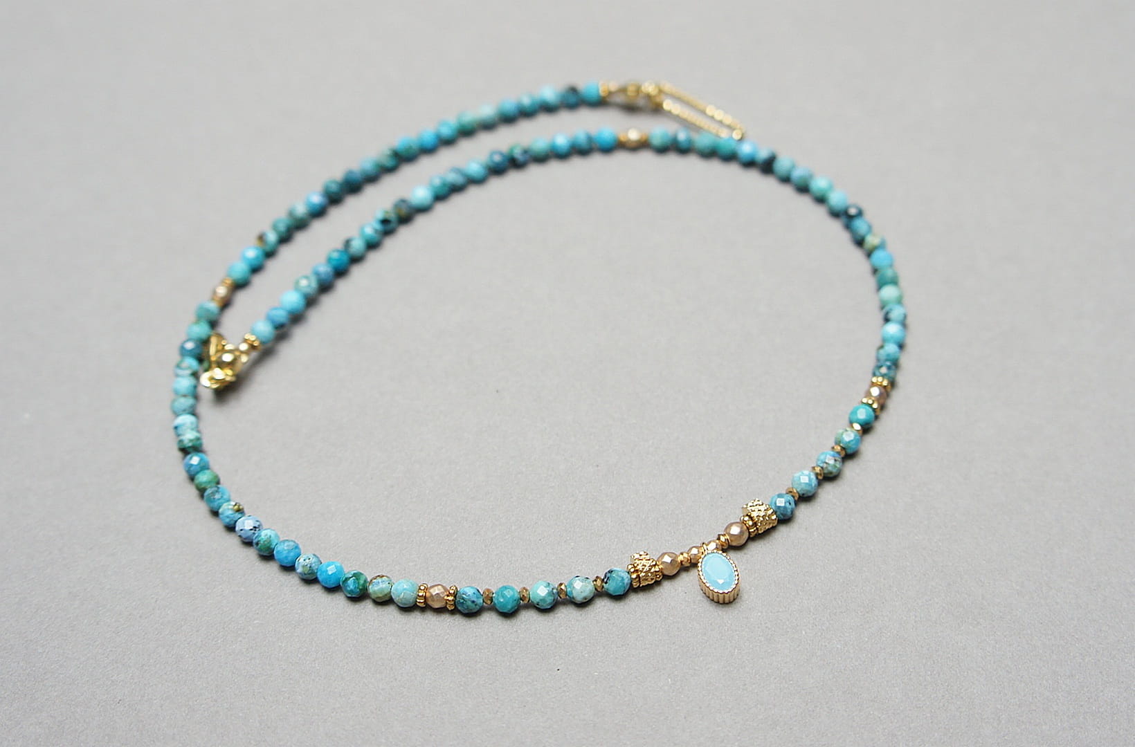 Krótki, delikatny naszyjnik wykonany w całości z pozłacanej stali szlachetnej oraz naturalnych, szlachetnych kamieni - fasetowanych, niebieskich opali [3mm], hematytu fasetowanego, platerowanego [2mm i 3mm], przekładek z hematytu [1mm] oraz zawieszki z cyrkonią w okuciu. Naszyjnik o długości ok. 42,1cm.