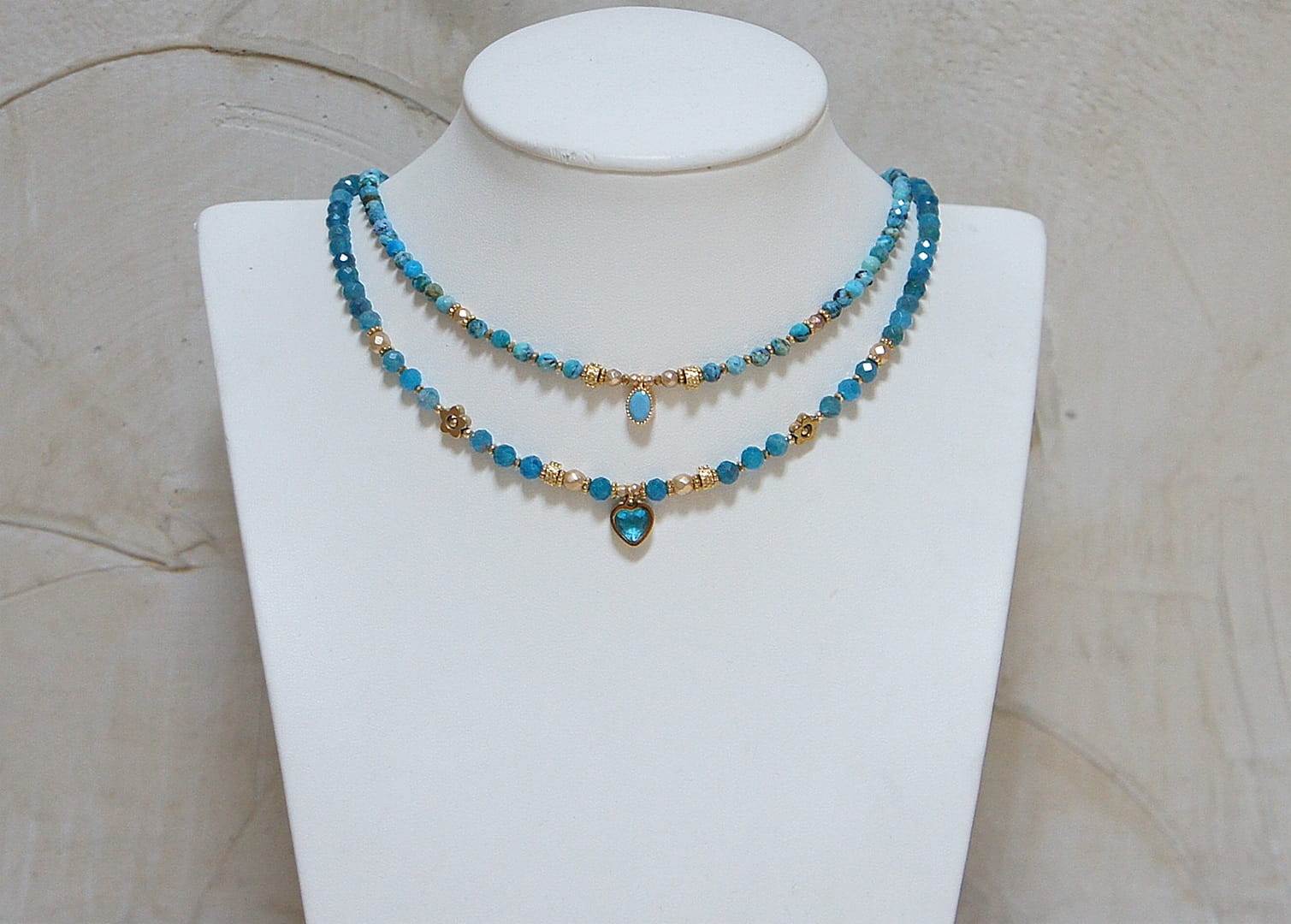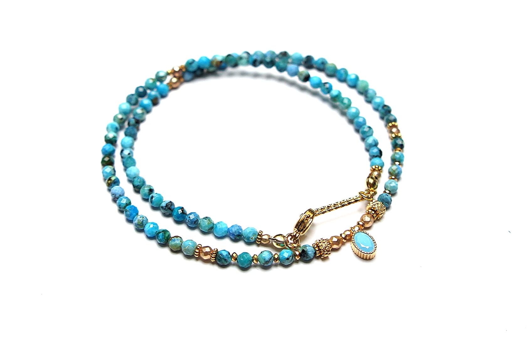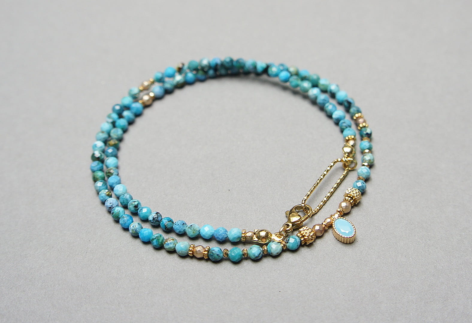 Krótki, delikatny naszyjnik wykonany w całości z pozłacanej stali szlachetnej oraz naturalnych, szlachetnych kamieni - fasetowanych, niebieskich opali [3mm], hematytu fasetowanego, platerowanego [2mm i 3mm], przekładek z hematytu [1mm] oraz zawieszki z cyrkonią w okuciu. Naszyjnik o długości ok. 42,1cm.