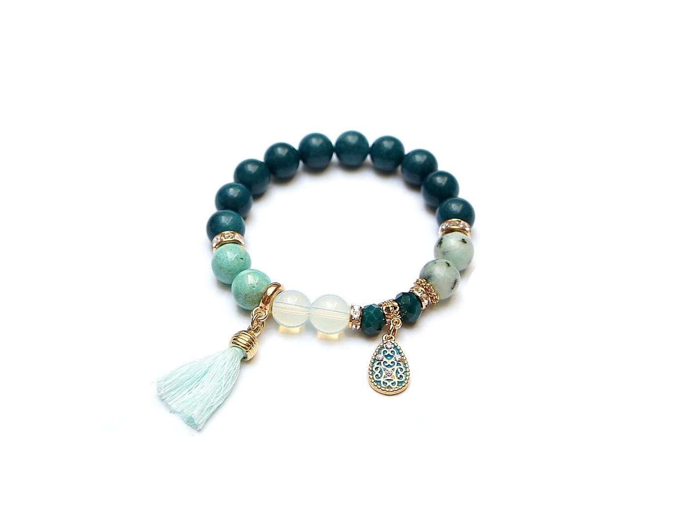 Bransoletka wykonana z naturalnych minerałów - jaspis [10mm], marmur [10mm], kryształki fasetowane [8mm], transparentne szklane kuleczki [10mm], zawieszki emaliowanej, wysadzanej cyrkoniami, chwostu oraz elementów metalowych w kolorze złotym. Bransoletka na gumce silikonowej. Pasuje na nadgarstek 16-17cm. Biżuteria ozdobnie zapakowana.
