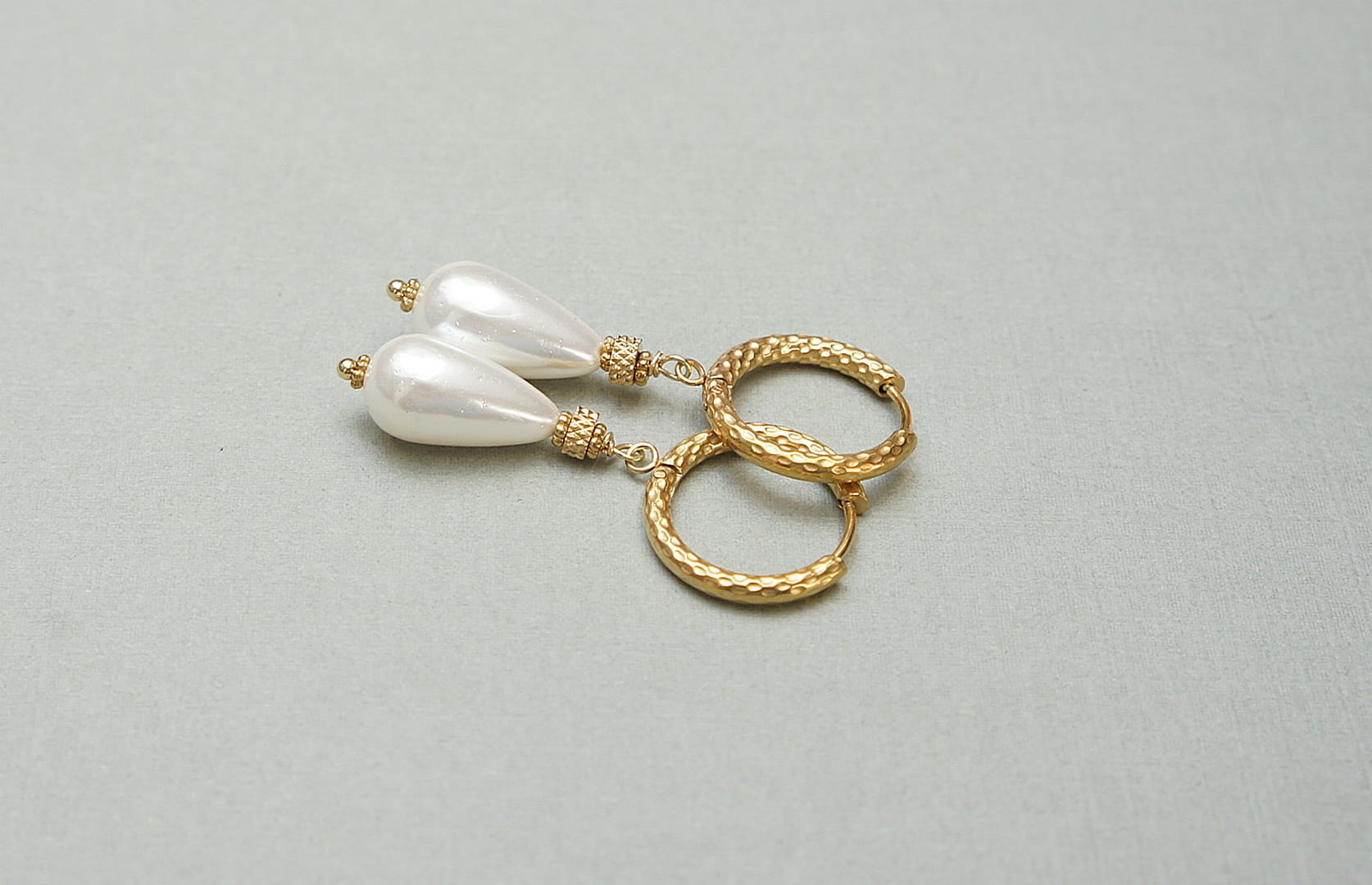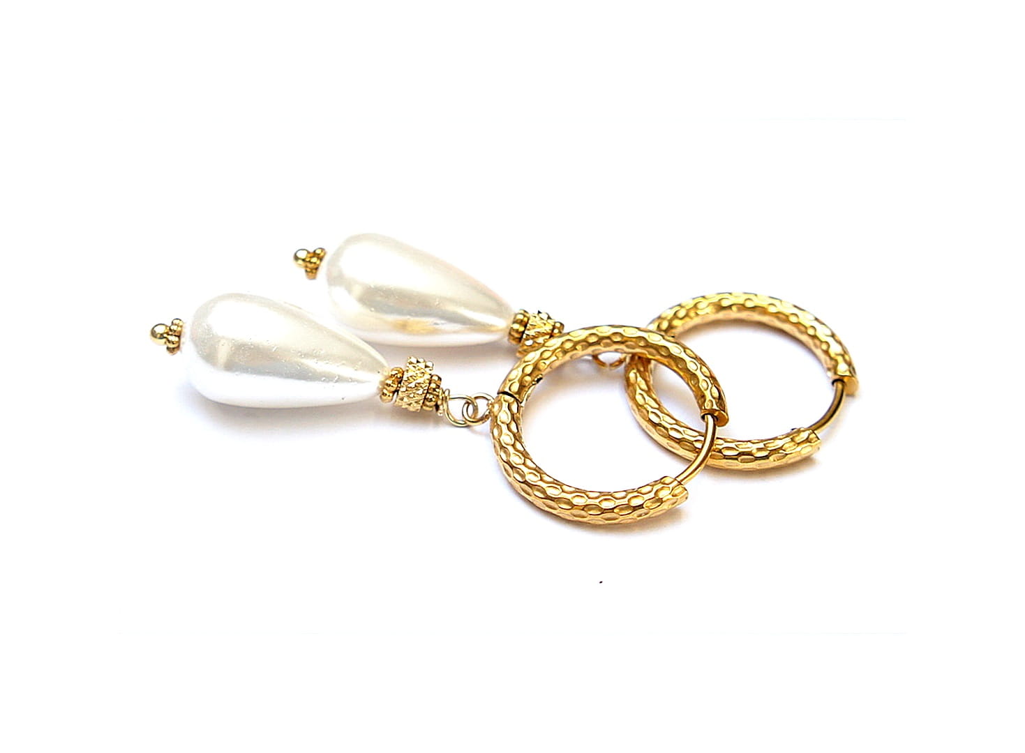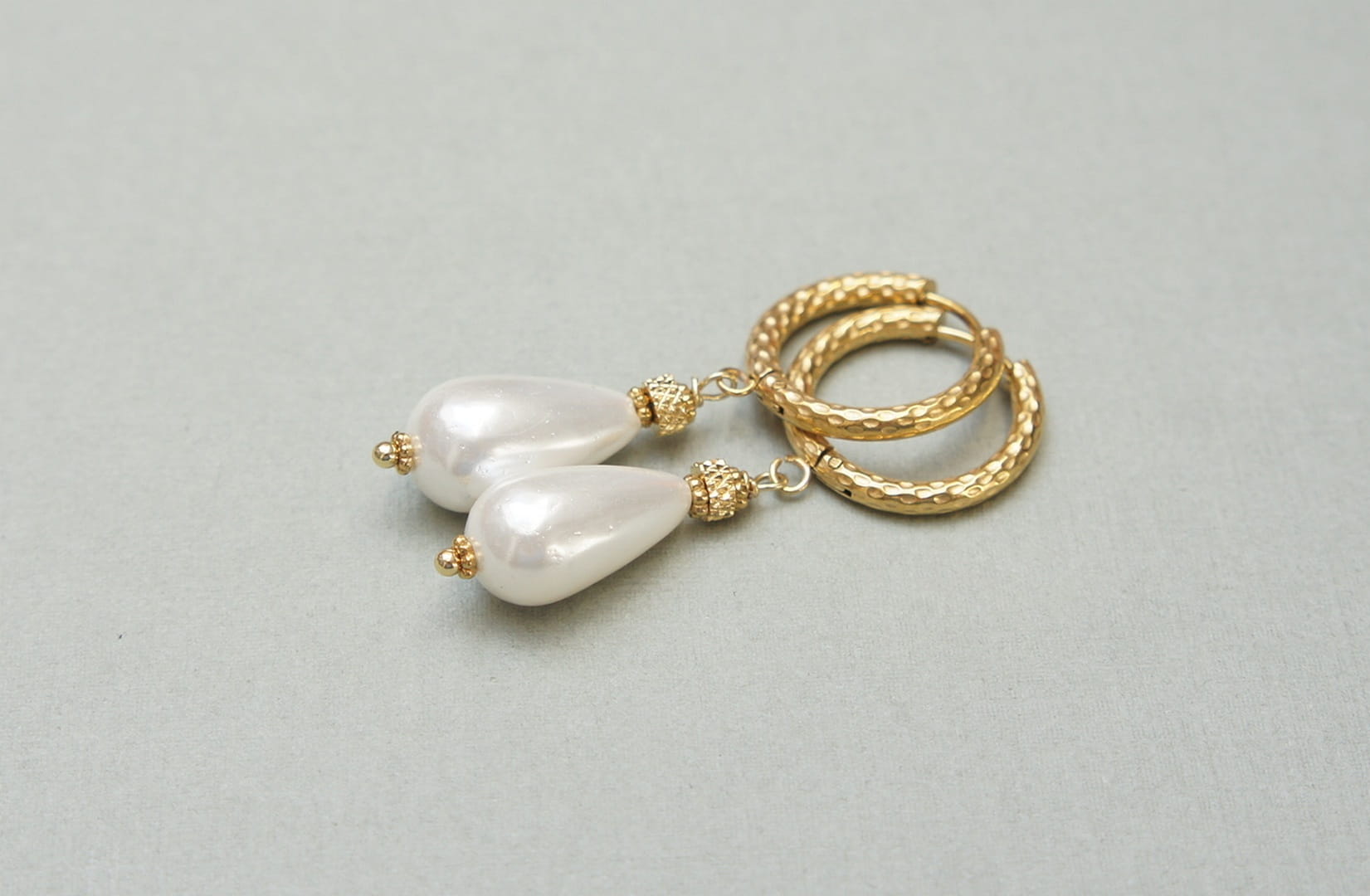 Kolczyki wykonane z pereł seashell [ok. 18 x 10mm], fasetowanych hematytów platerowanych [3mm] oraz z pozłacanej stali szlachetnej. Długość kolczyków: 4,8cm. Średnica kół: 19mm. Biżuteria ozdobnie zapakowana.