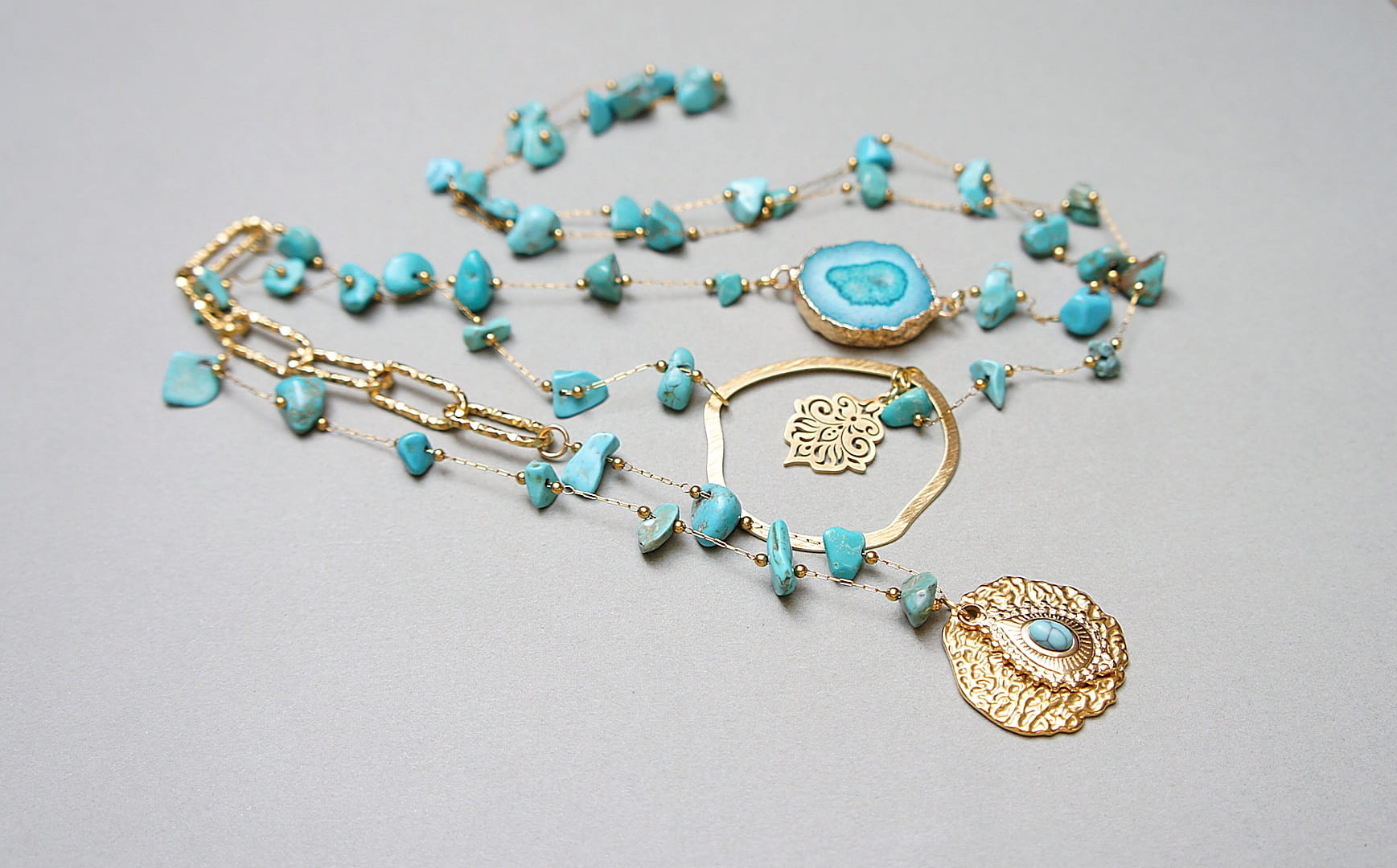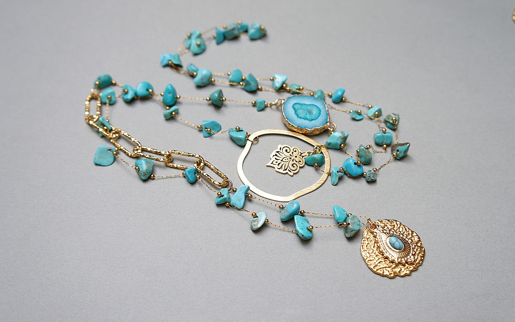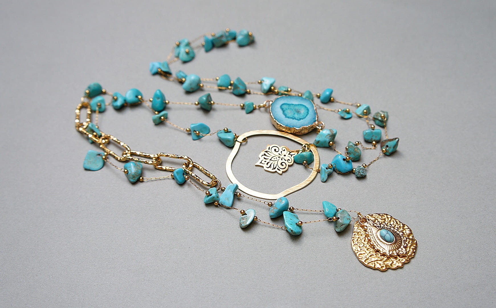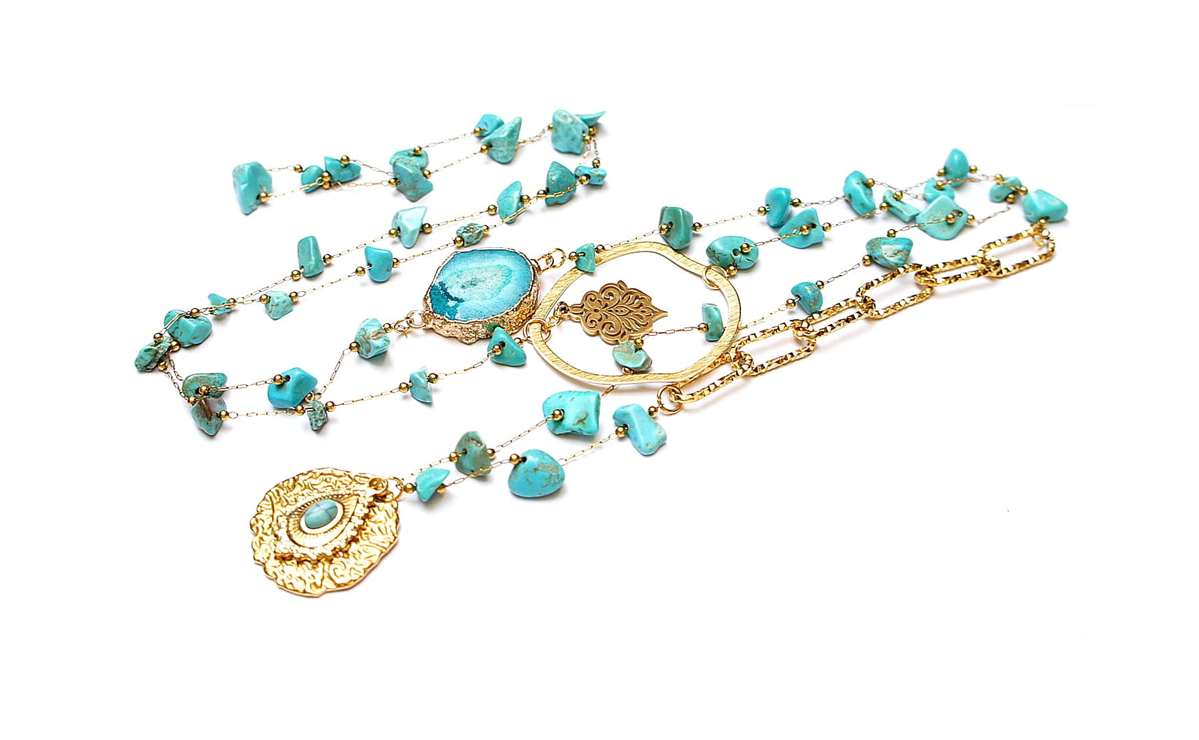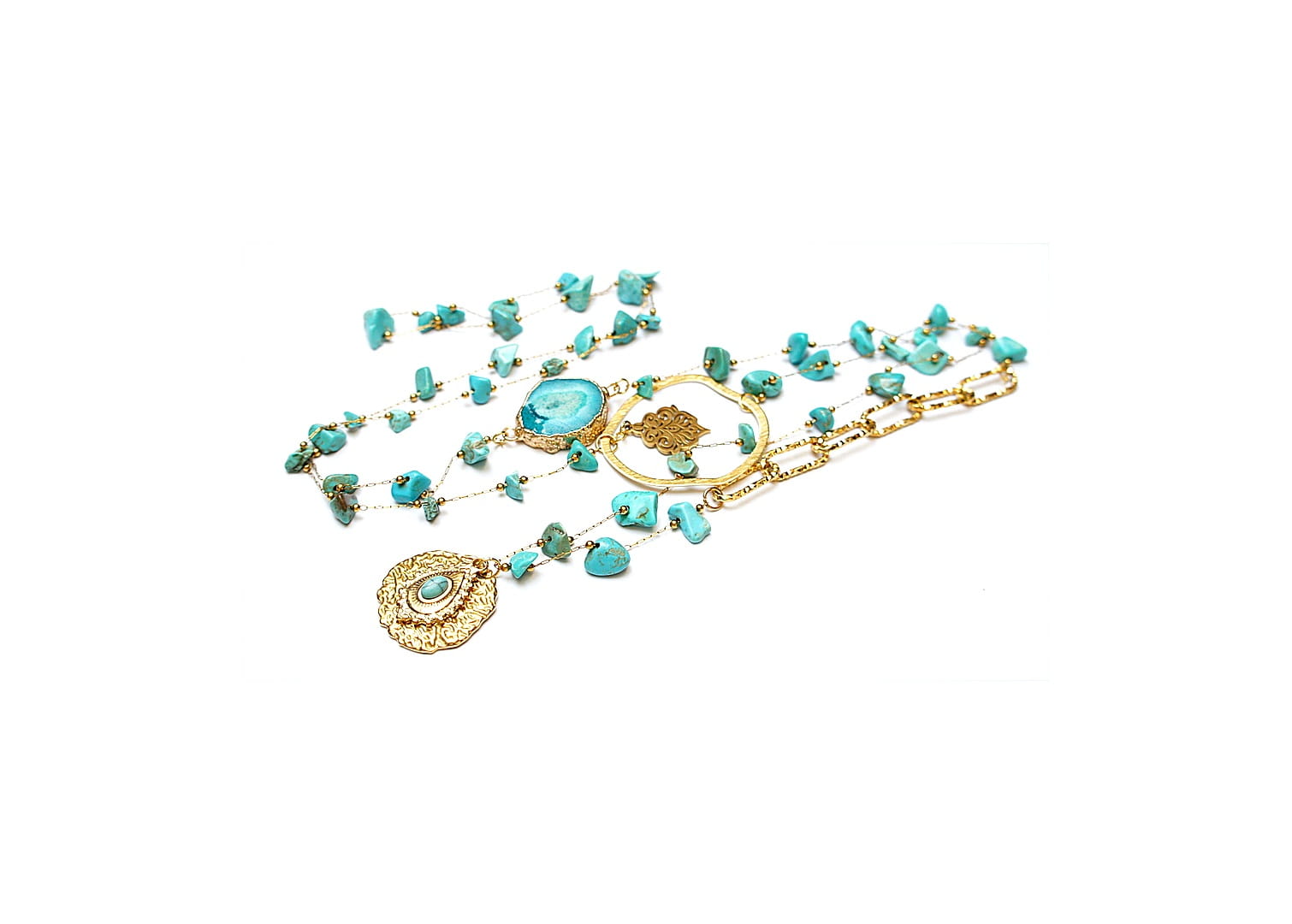 Bardzo długi naszyjnik wykonany ze stali szlachetnej pozłacanej w połączeniu z naturalnymi turkusami - [od ok 6mm do 11mm], łącznika z agatu, zawieszki z naturalnym kamieniem, nieregularnej obręczy z mosiądzu. Całkowita długość naszyjnika ok. 110 cm. Biżuteria ozdobnie zapakowana.