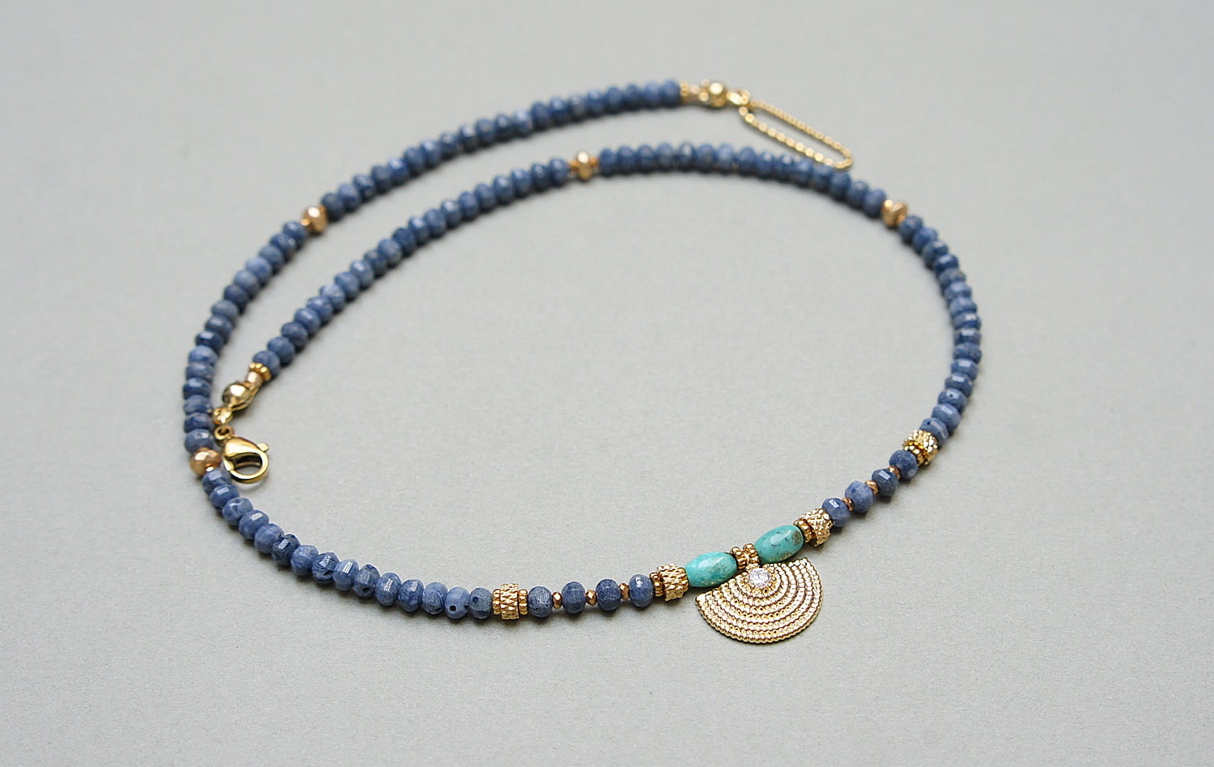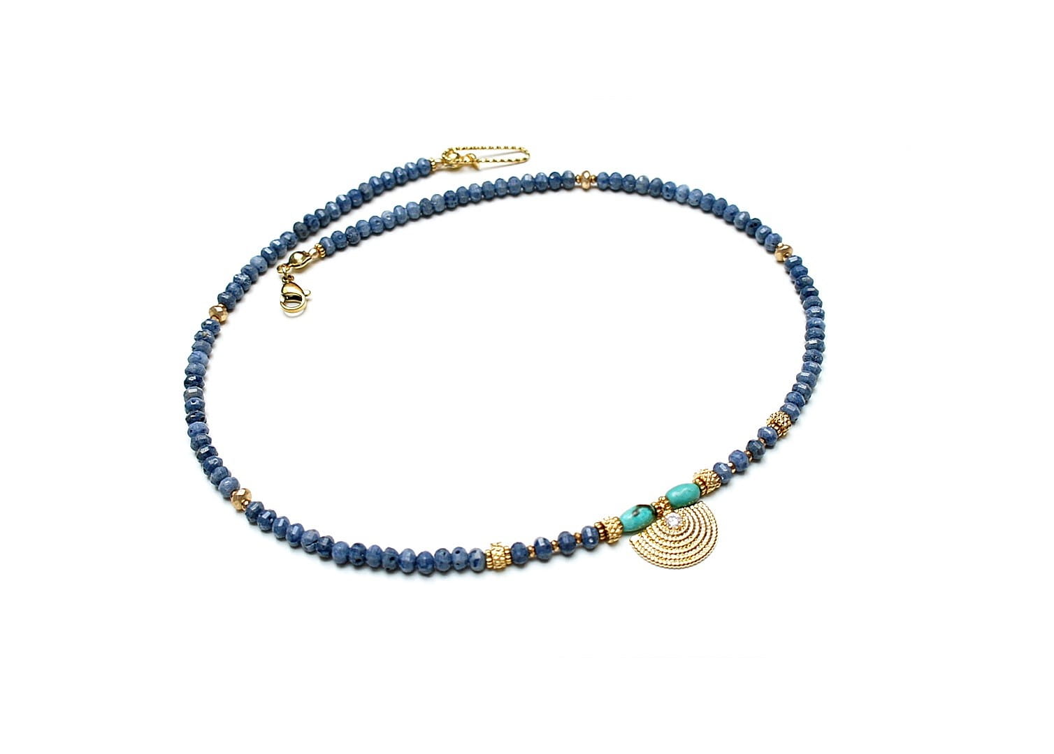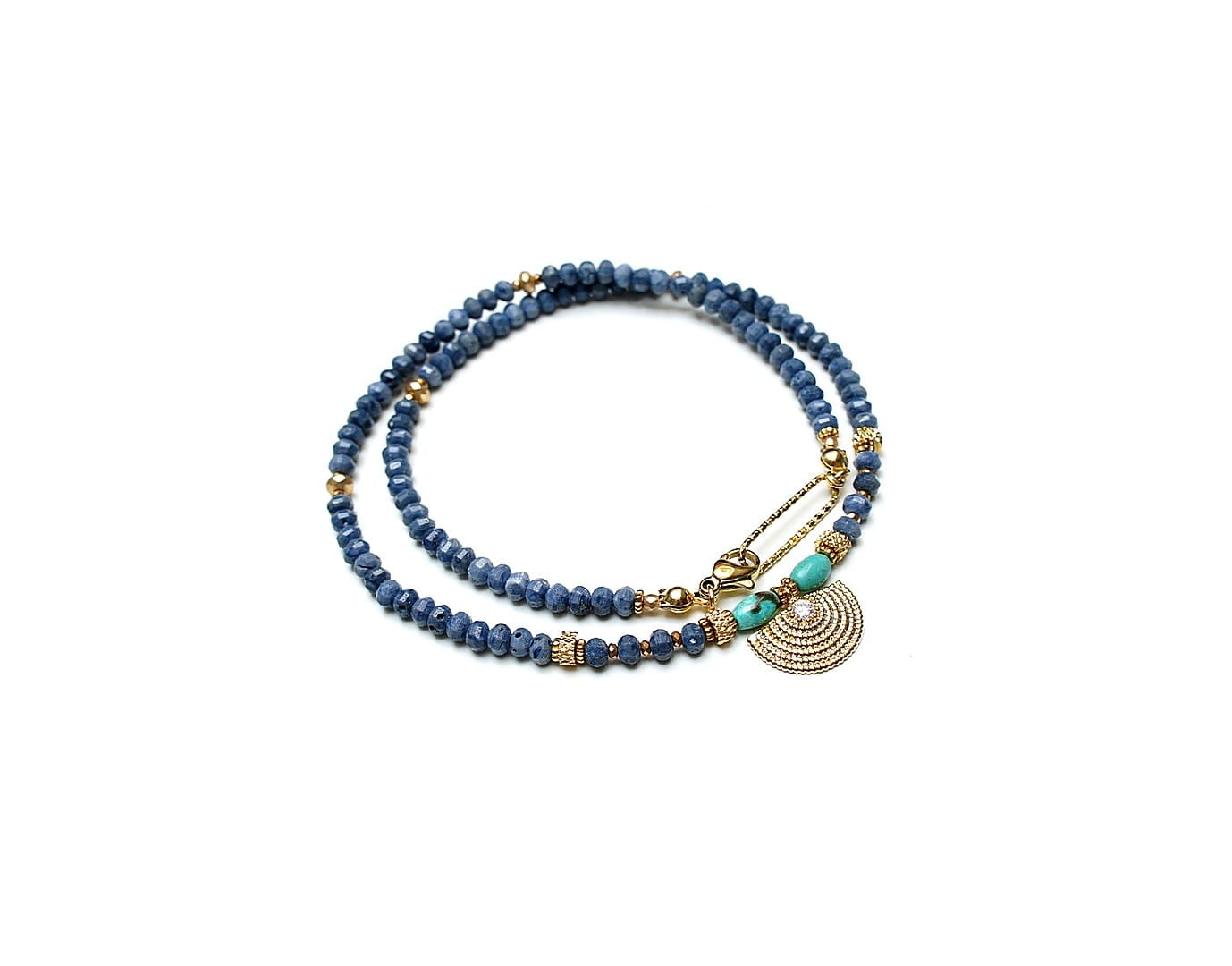 Krótki, delikatny naszyjnik wykonany w całości z pozłacanej stali szlachetnej, naturalnego niebieskiego korala fasetowanego [3 x 2mm], oliwek turkusu [6mm], hematytu fasetowany, platerowanego o matowej powłoce [3 x 2mm], przekładek z hematytu [1mm], zawieszki z miedzi rodowanej z osadzoną cyrkonią. Naszyjnik o długości 42cm. Do kompletu można dokupić bransoletkę i kolczyki przedstawione na zdjęciach. Biżuteria ozdobnie zapakowana.