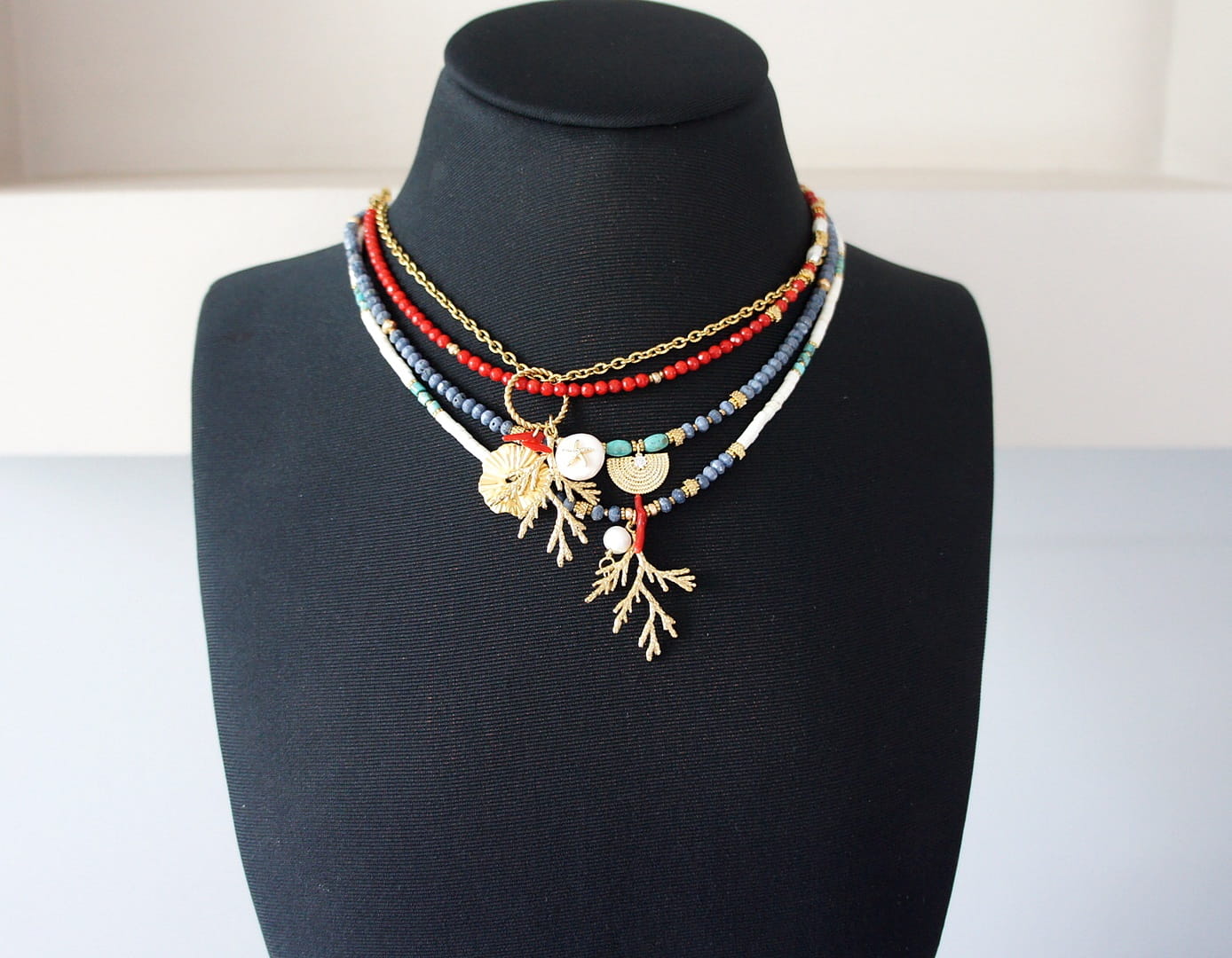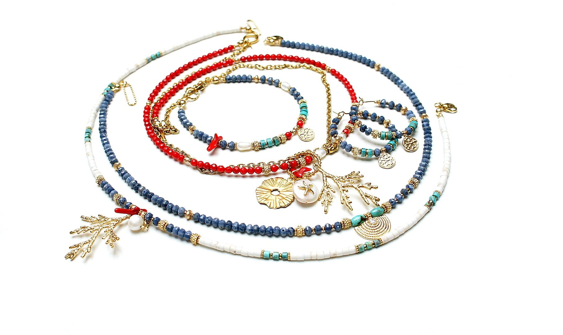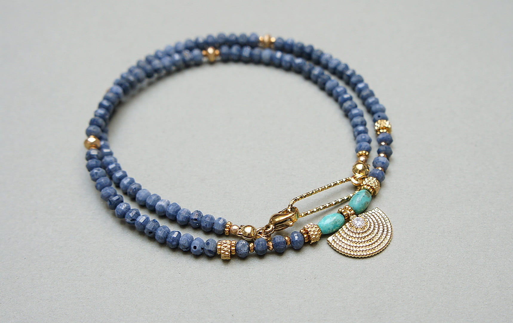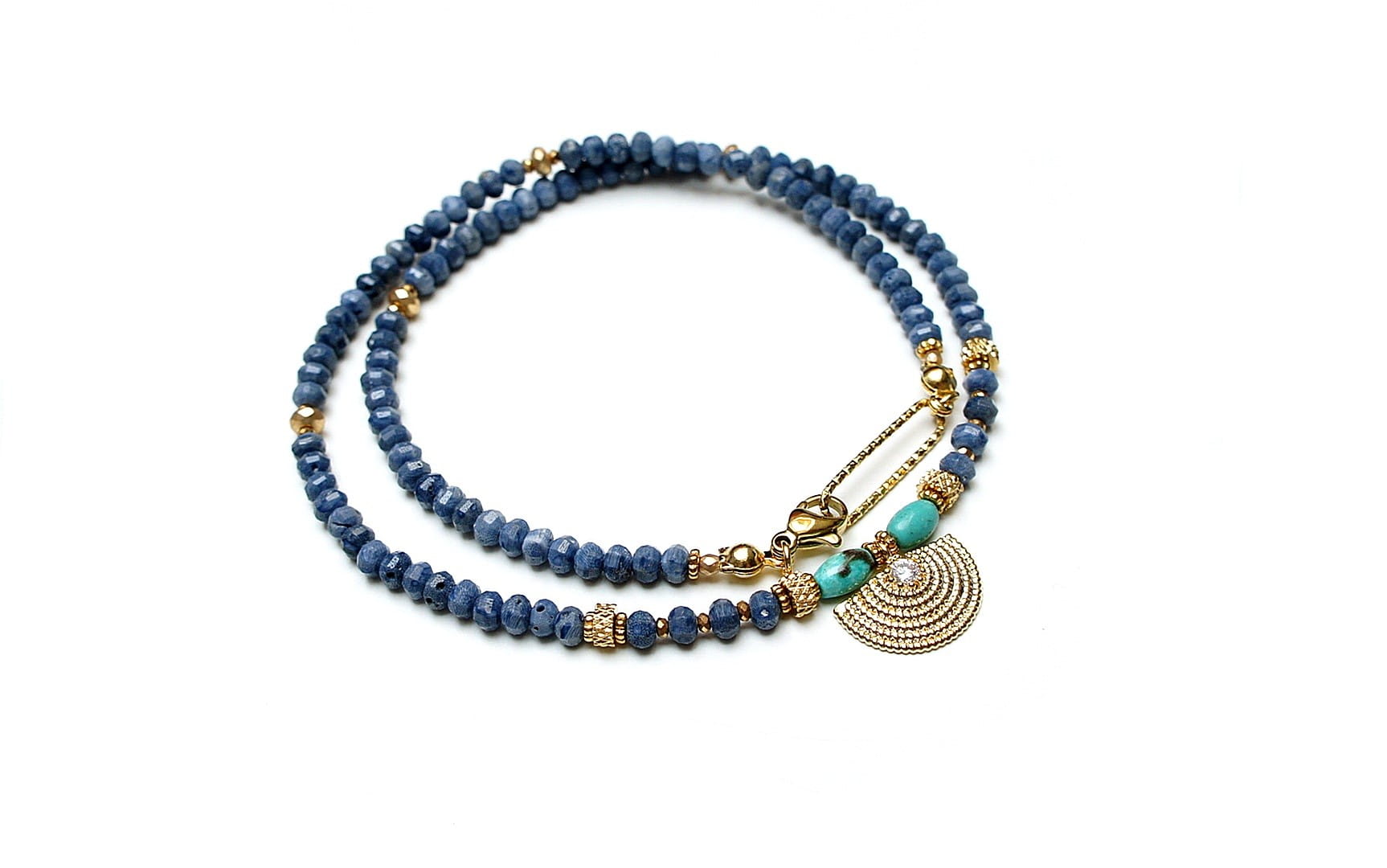 Krótki, delikatny naszyjnik wykonany w całości z pozłacanej stali szlachetnej, naturalnego niebieskiego korala fasetowanego [3 x 2mm], oliwek turkusu [6mm], hematytu fasetowany, platerowanego o matowej powłoce [3 x 2mm], przekładek z hematytu [1mm], zawieszki z miedzi rodowanej z osadzoną cyrkonią. Naszyjnik o długości 42cm. Do kompletu można dokupić bransoletkę i kolczyki przedstawione na zdjęciach. Biżuteria ozdobnie zapakowana.
