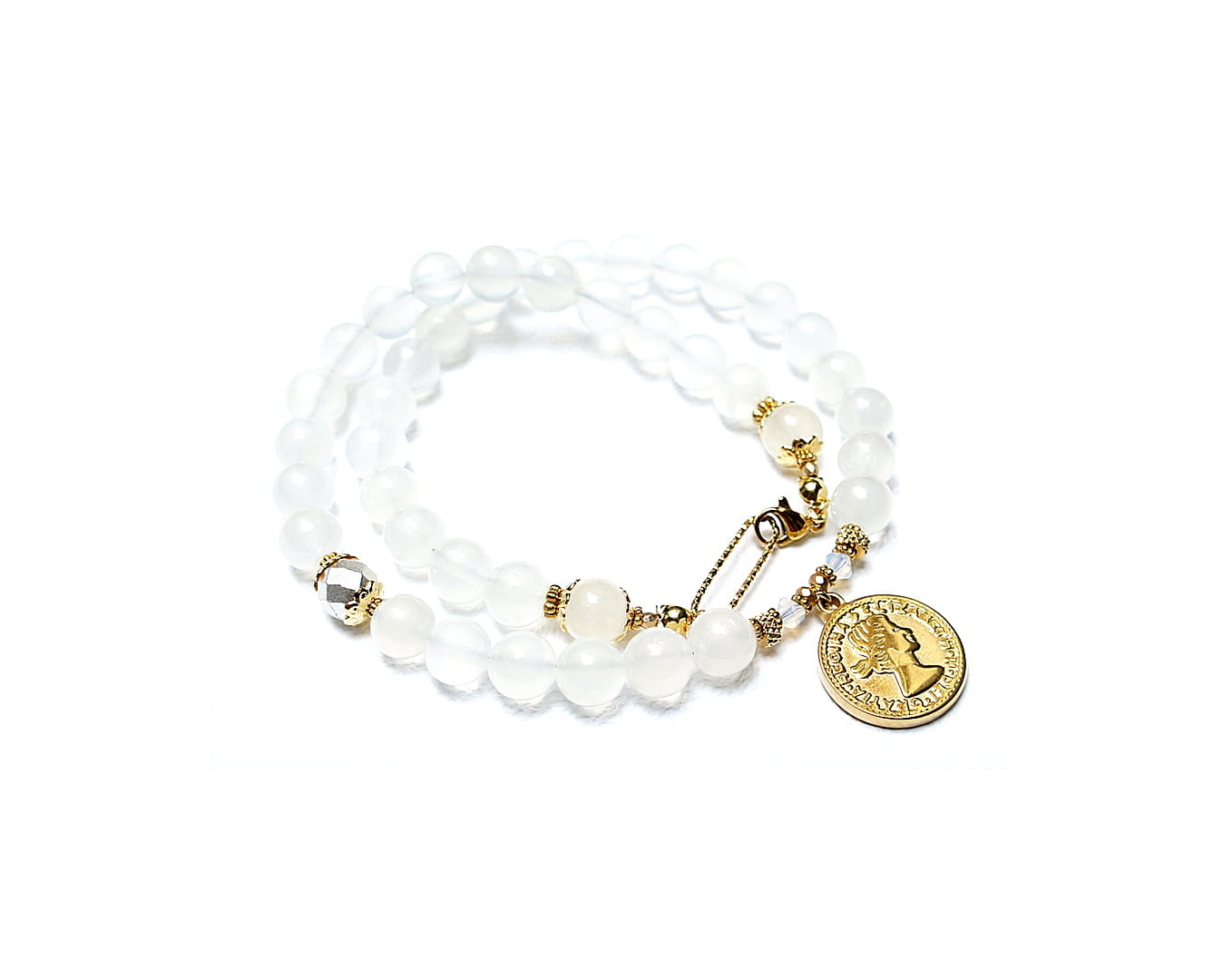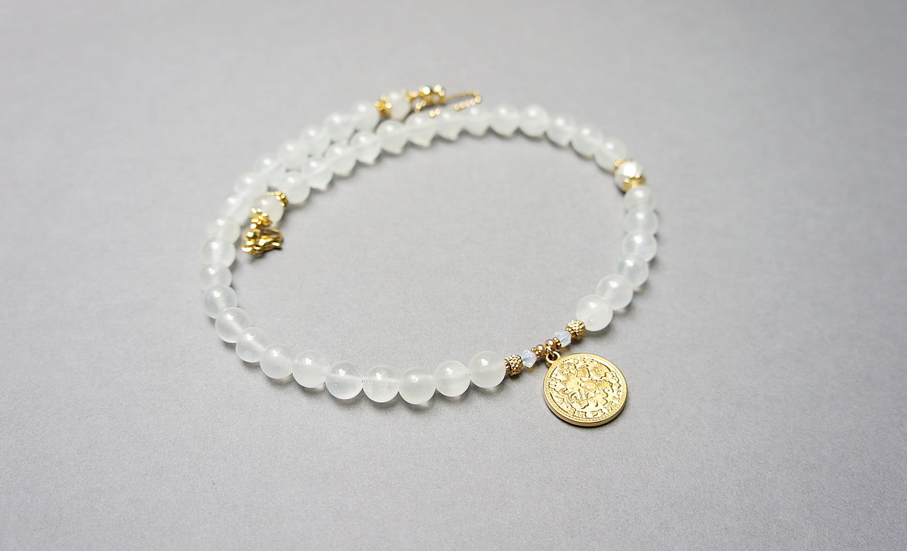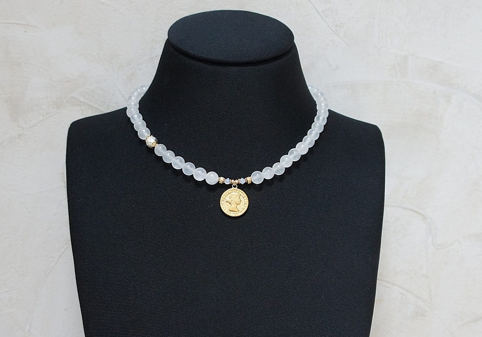 Krótki naszyjnik wykonany w całości z pozłacanej stali szlachetnej oraz naturalnych kamieni - jadeit transparentny [8mm], hematyt platerowany, matowy [8mm], hematyt fasetowany, platerowany o matowej powłoce [3 x 2mm], kryształków fasetowanych [4mm] oraz dużej zawieszki w kształcie antycznej monety [śr. 12mm]. Naszyjnik o długości ok. 42,5cm. Biżuteria ozdobnie zapakowana.