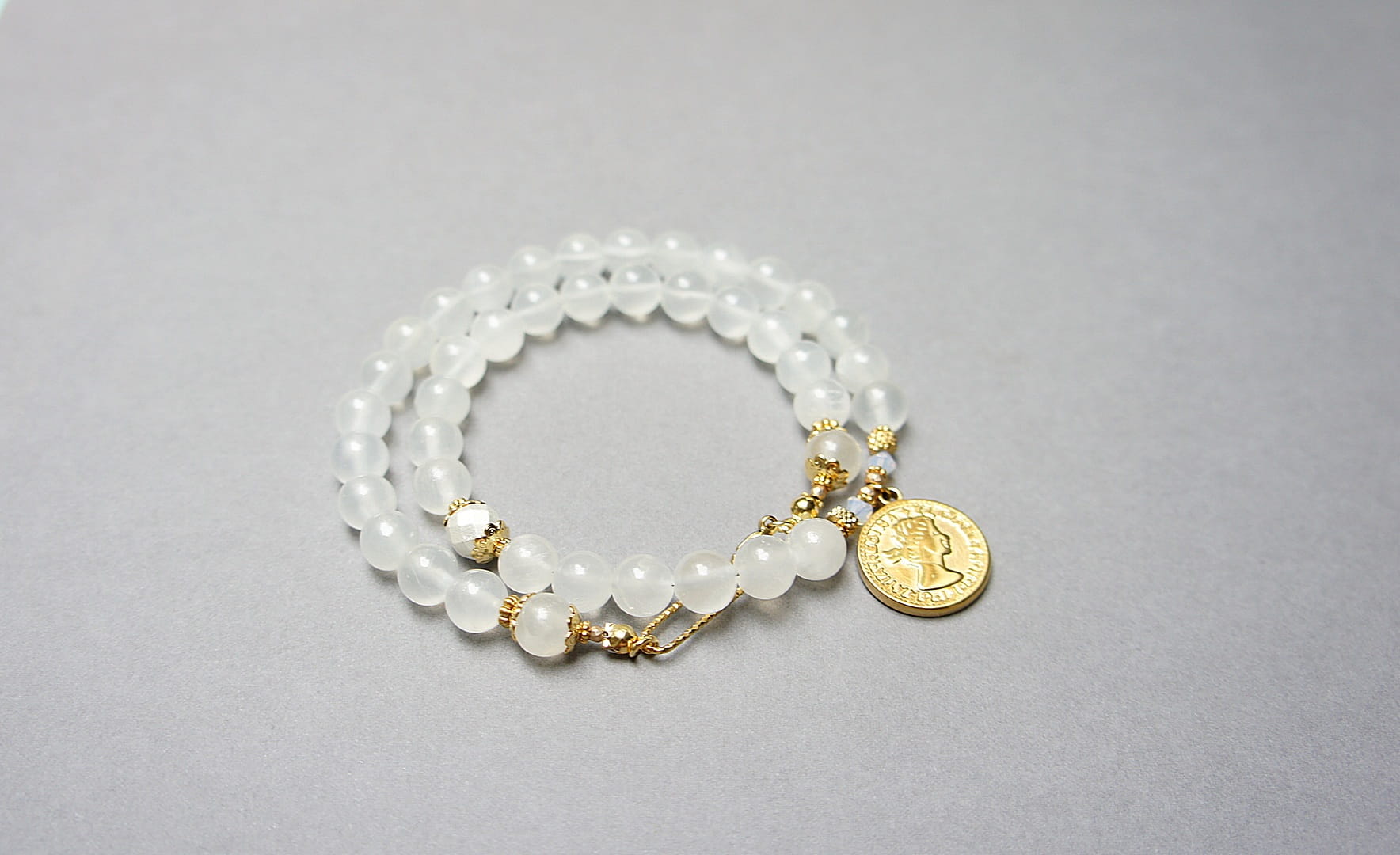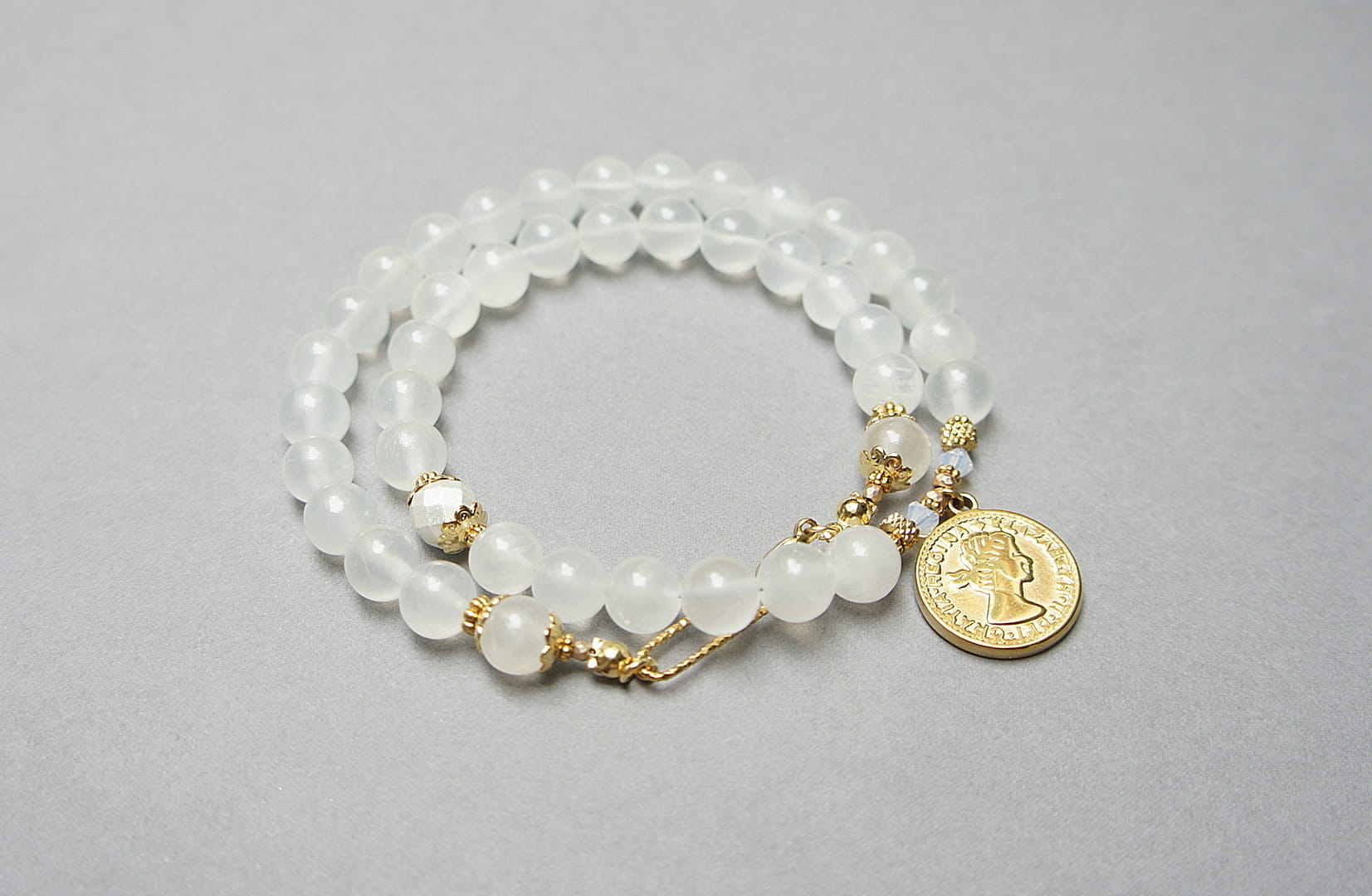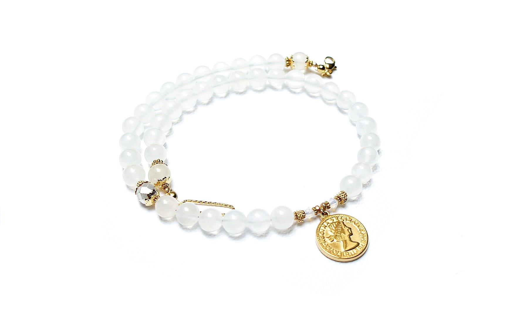 Krótki naszyjnik wykonany w całości z pozłacanej stali szlachetnej oraz naturalnych kamieni - jadeit transparentny [8mm], hematyt platerowany, matowy [8mm], hematyt fasetowany, platerowany o matowej powłoce [3 x 2mm], kryształków fasetowanych [4mm] oraz dużej zawieszki w kształcie antycznej monety [śr. 12mm]. Naszyjnik o długości ok. 42,5cm. Biżuteria ozdobnie zapakowana.