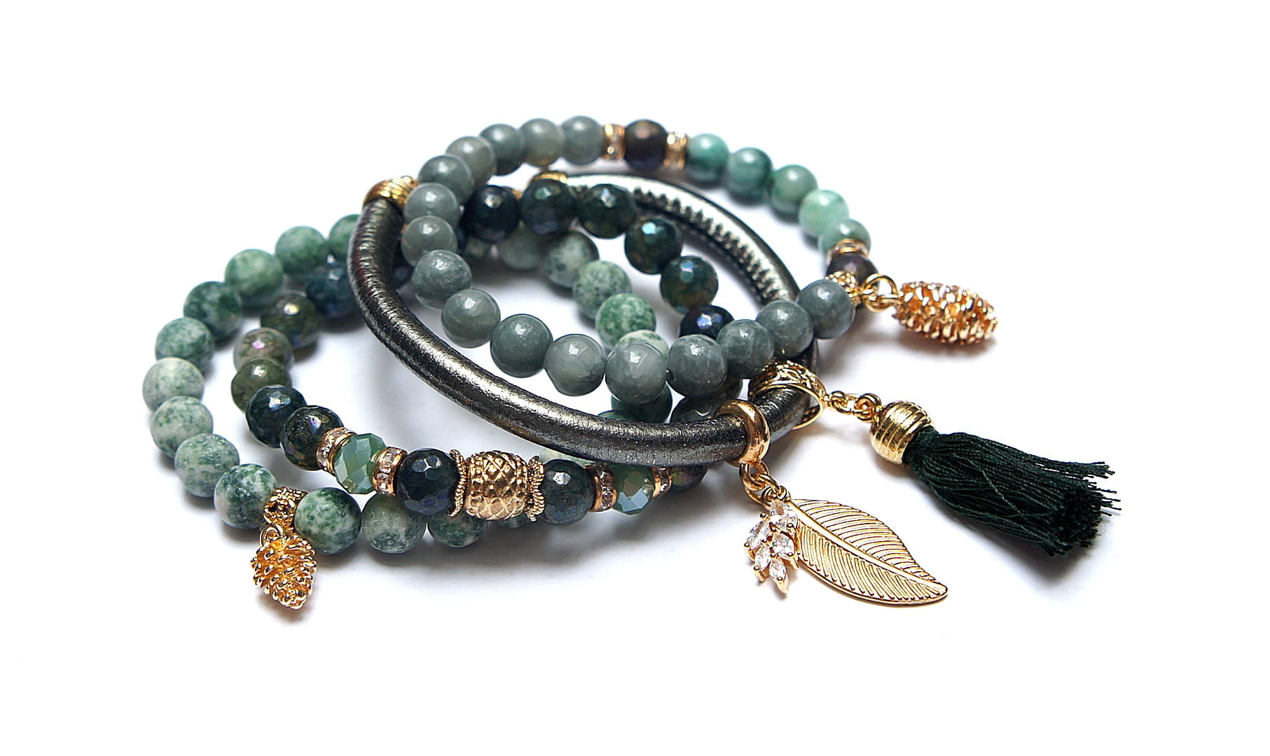 Komplet czterech bransoletek wykonanych z naturalnych kamieni: szmaragdy [8mm], agat fasetowany, platerowany [8mm], jaspis matowy [8mm], marmur [8mm], hematyt fasetowany, platerowany [8mm], kryształki fasetowane [8mm], zawieszki wysadzanej cyrkoniami, chwostu, rzemienia z ekologicznej skórki [6mm] oraz elementów metalowych w kolorze złota. Bransoletki pasują na nadgarstek 15 - 16cm. Biżuteria ozdobnie zapakowana