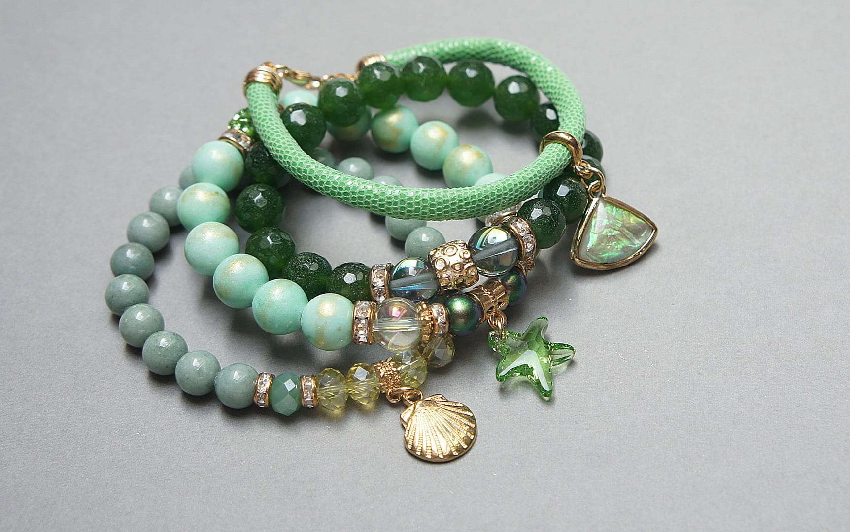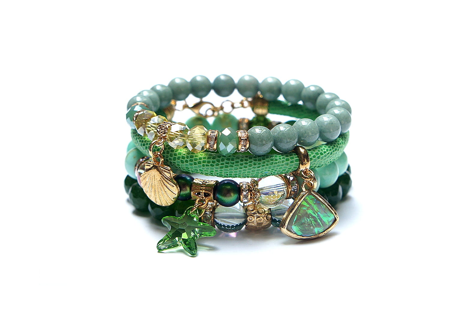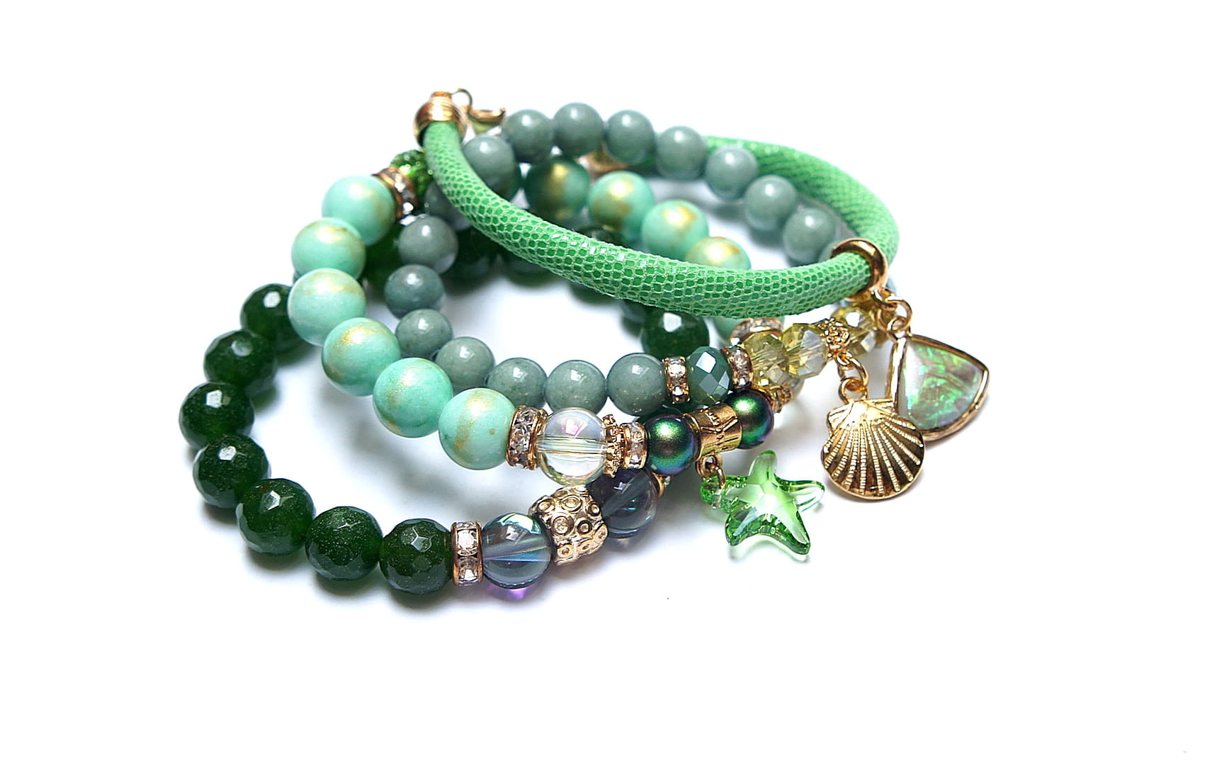 Komplet czterech bransoletek wykonanych z naturalnych kamieni: jadeit fasetowany [10mm], jadeit platerowany [10mm], jadeity [8mm], perły Swarovski [8mm], szklane kuleczki [10mm], kwarc [10mm], kryształki [8mm], kuleczki shamballa wysadzanej cyrkoniami [10mm], zawieszki z kryształka Swarovski, rzemienia z naturalnej skórki [6mm] oraz elementów metalowych w kolorze złota. Bransoletki pasują na nadgarstek 16 - 17cm. Biżuteria ozdobnie zapakowana