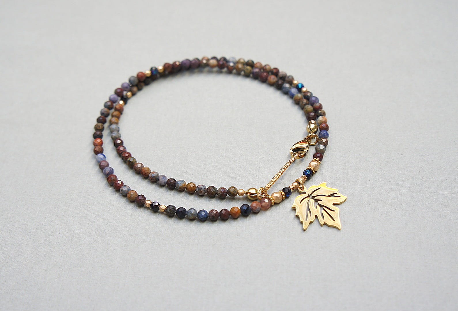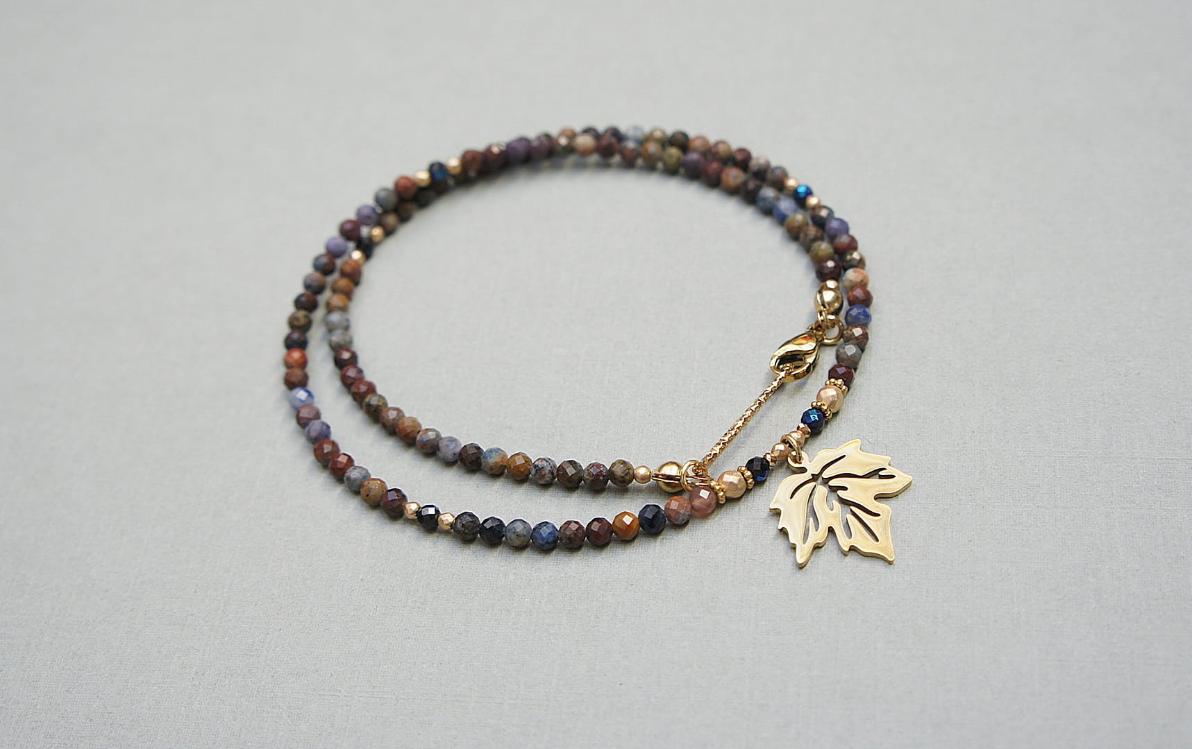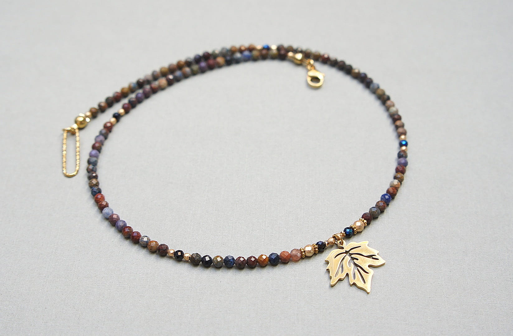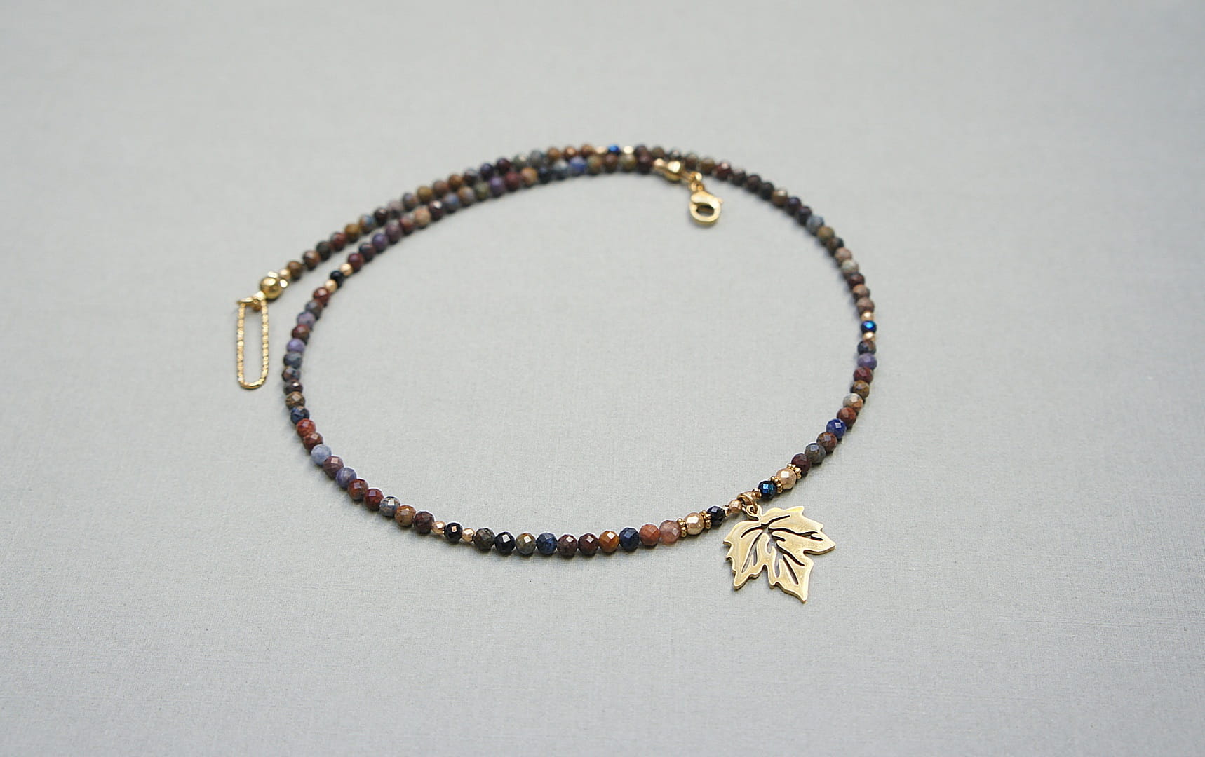 Krótki naszyjnik wykonany w całości z pozłacanej stali szlachetnej oraz naturalnych, szlachetnych kamieni - fasetowane szafiry w unikatowej kolorystyce [3mm], spinel fasetowany [2mm], fasetowany hematyt, platerowany [3mm i 2mm] oraz zawieszki z platerowanego mosiądzu z osadzoną cyrkonią. Naszyjnik o długości ok. 42cm. Biżuteria ozdobnie zapakowana.