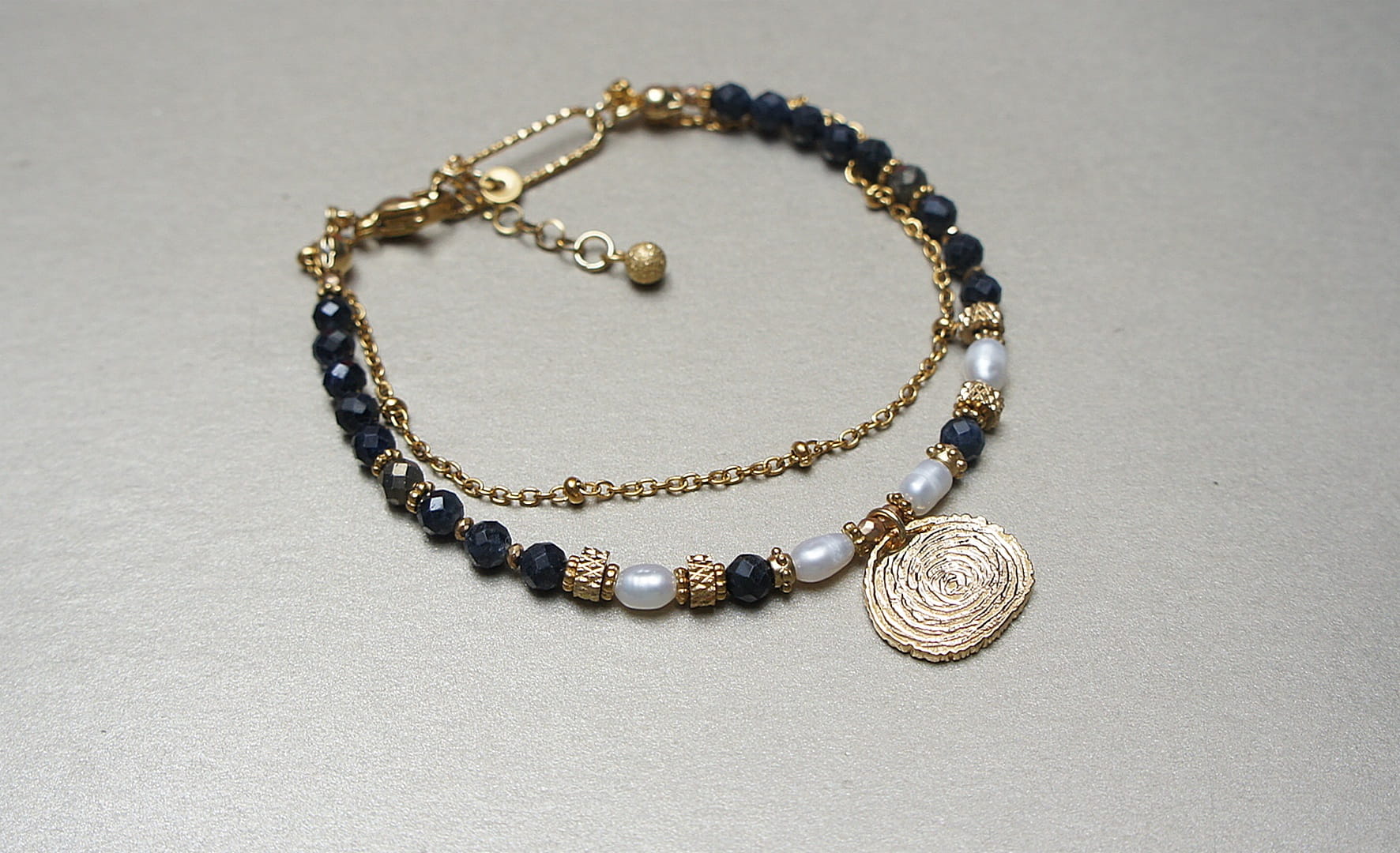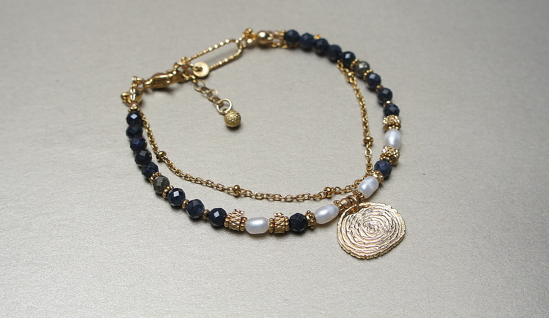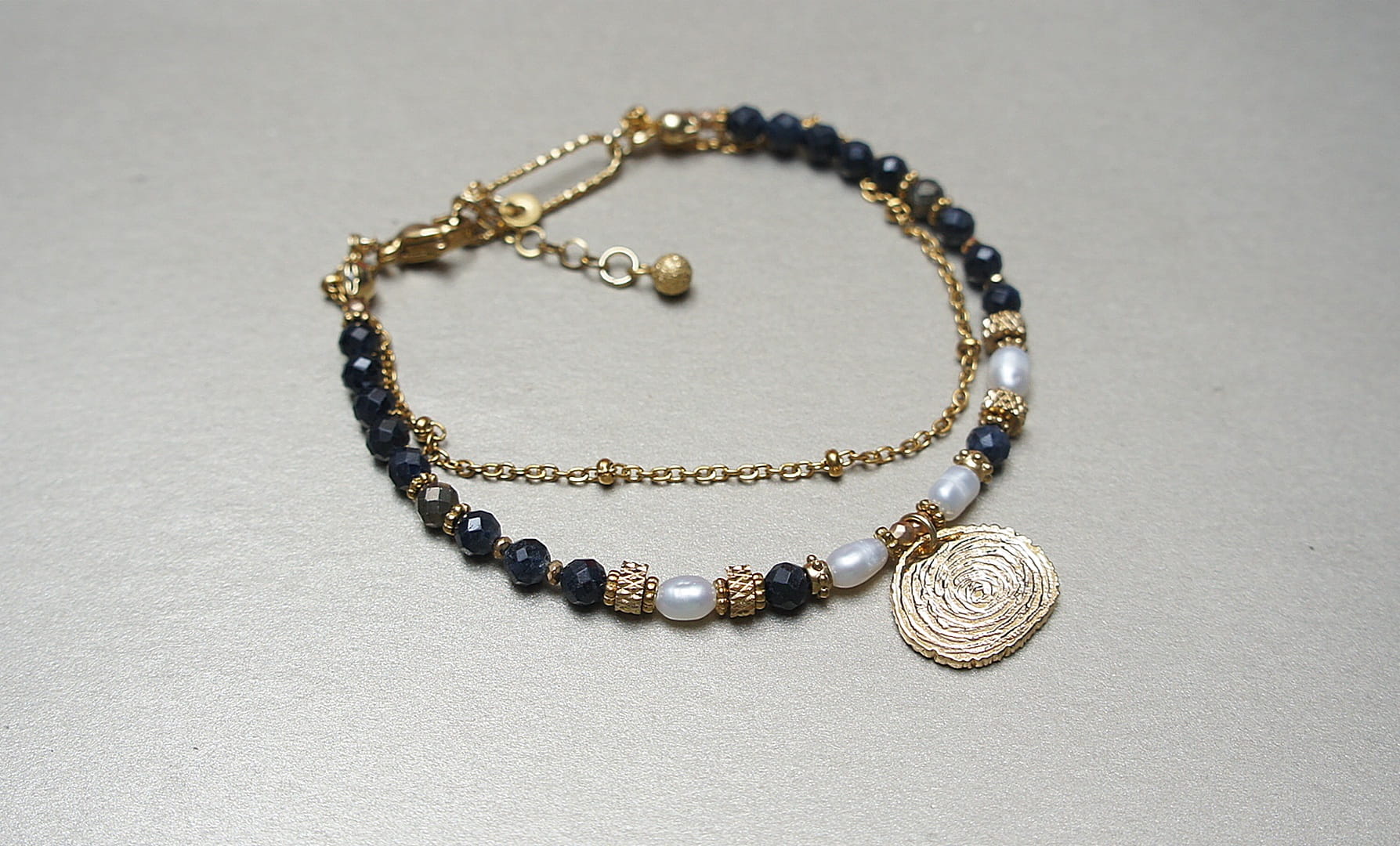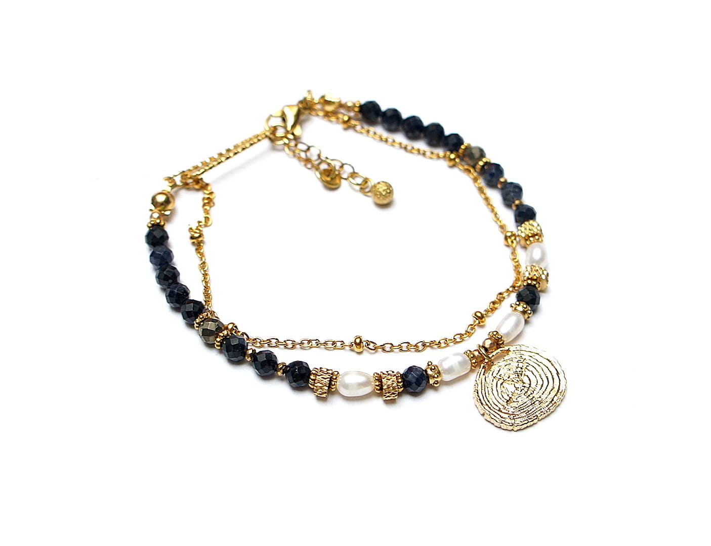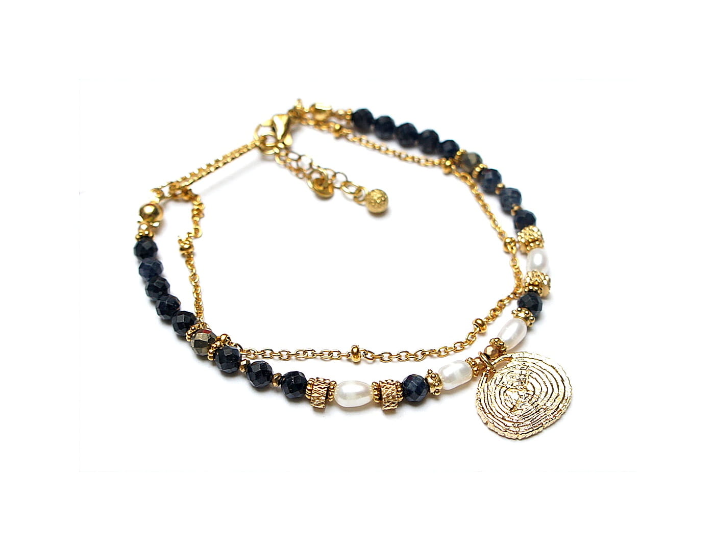 Delikatna bransoletka wykonana w całości z pozłacanej stali szlachetnej oraz naturalnych, szlachetnych kamieni - szafirów fasetowanych [4mm],pirytów fasetowanych [4mm], pereł słodkowodnych [ok. 6mm], fasetowanych, platerowanych hematytów [2mm], przekładek z hematytów [1mm]. Całkowita długość bransoletki: 19mm. Biżuteria ozdobnie zapakowana.