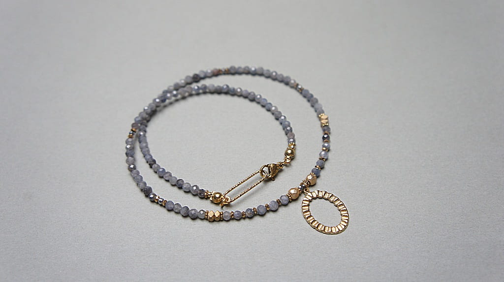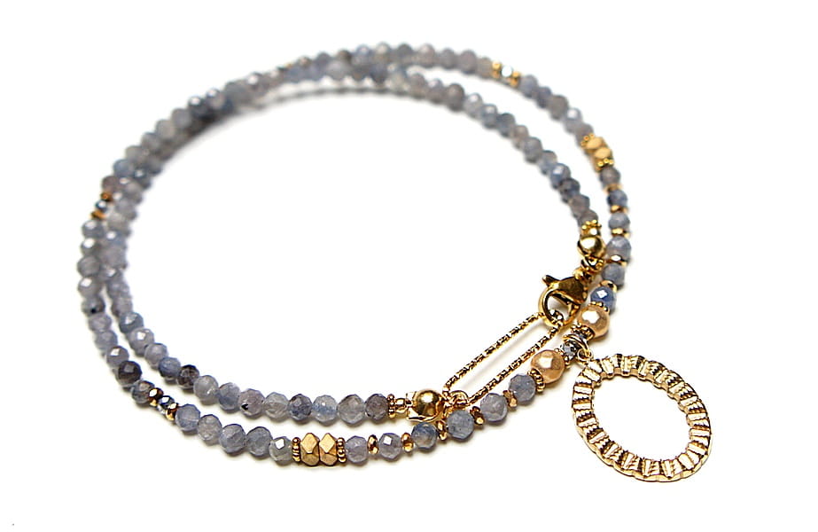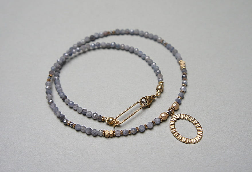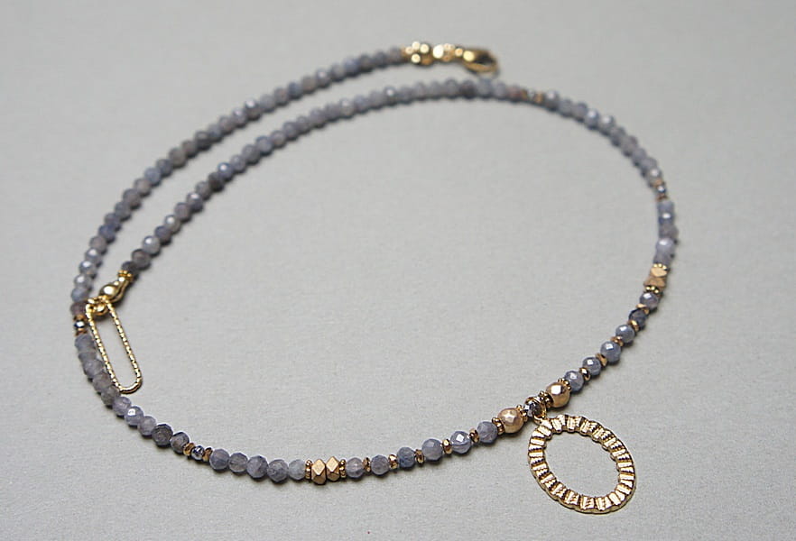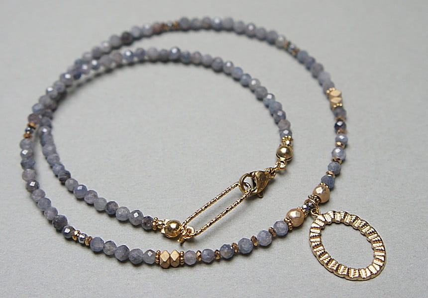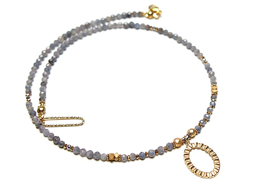 Krótki, delikatny naszyjnik wykonany w całości z pozłacanej stali szlachetnej oraz naturalnych, szlachetnych kamieni - szafiry fasetowane w kolorze gołębim [3mm], przekładek z hematytu [1mm, 3 x 2mm, 4mm]. Naszyjnik o długości 42,2cm.