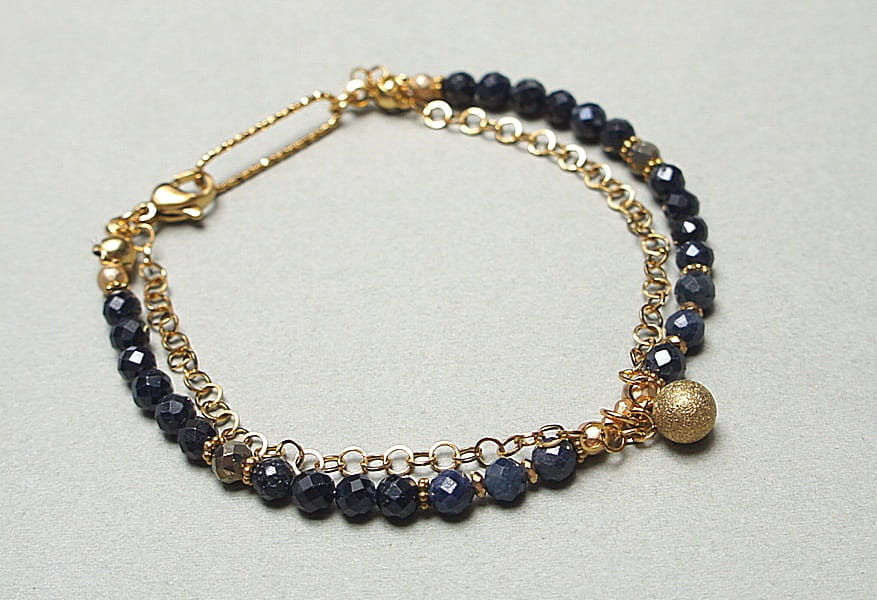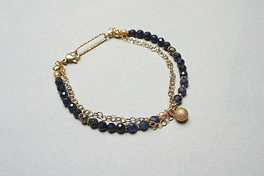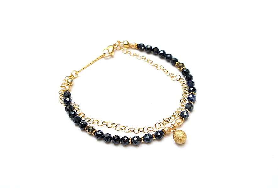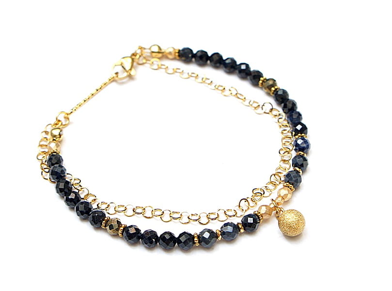 Delikatna bransoletka wykonana w całości z pozłacanej stali szlachetnej oraz naturalnych, szlachetnych kamieni - fasetowanych szafirów [4mm], fasetowanych pirytów [4mm], fasetowanych, platerowanych hematytów [3mm], przekładek z hematytów [1mm]. Bransoletka pasuje na nadgarstek 15 - 16cm. Biżuteria ozdobnie zapakowana.