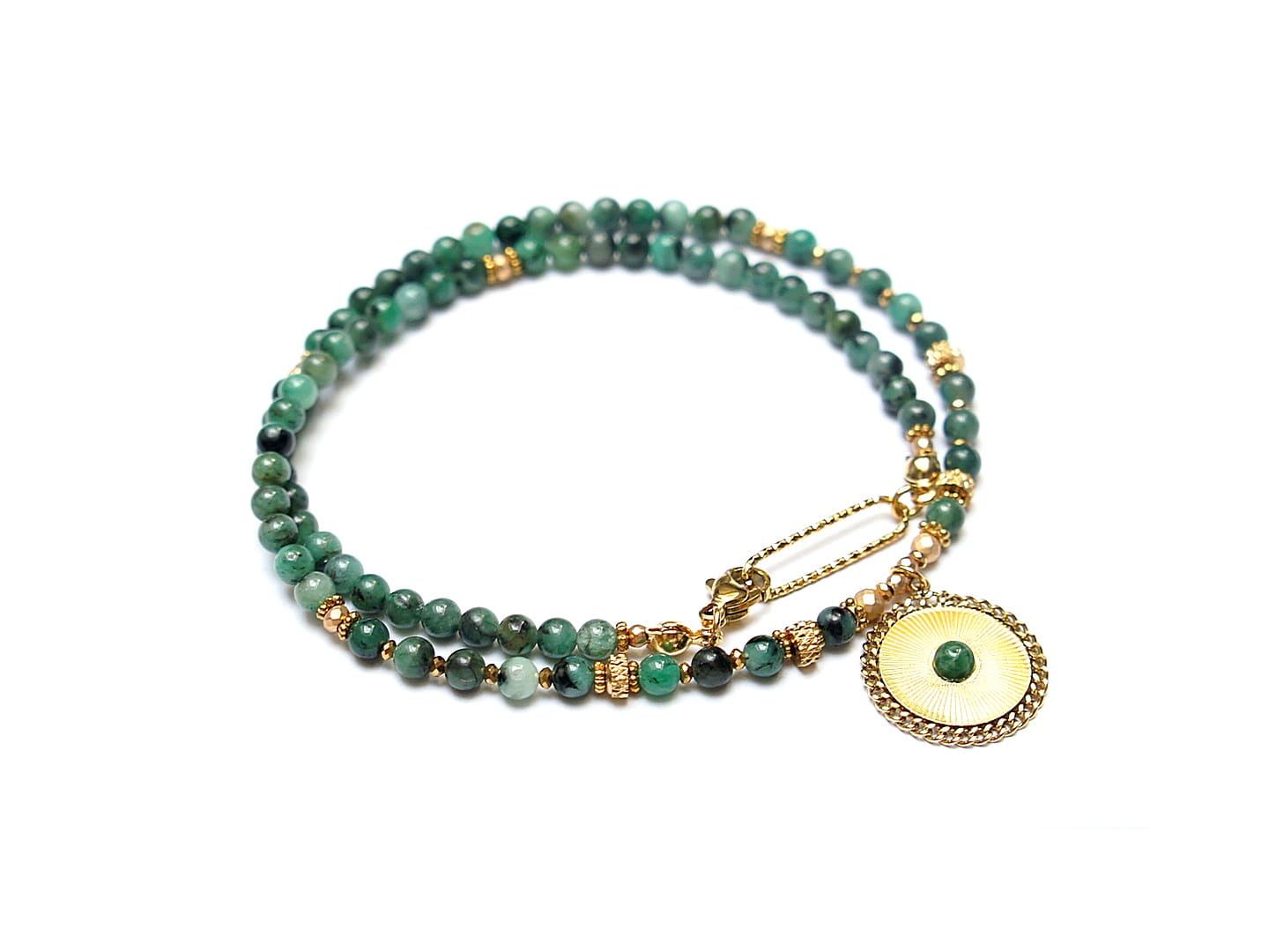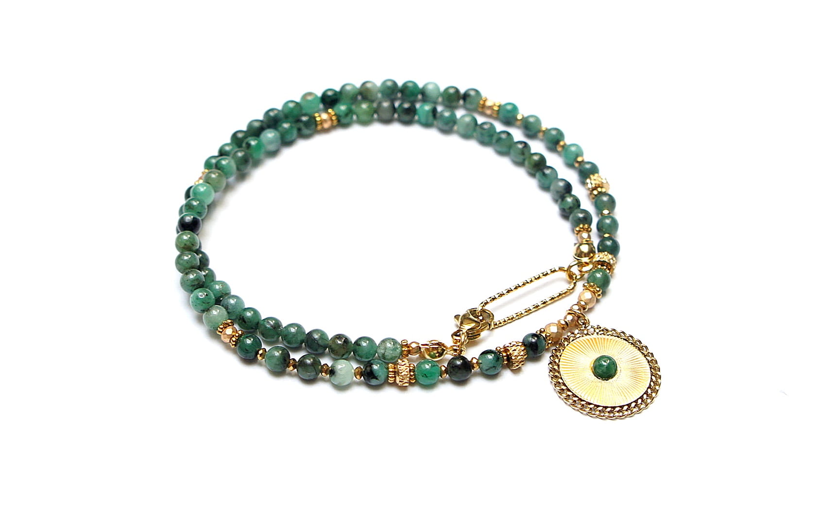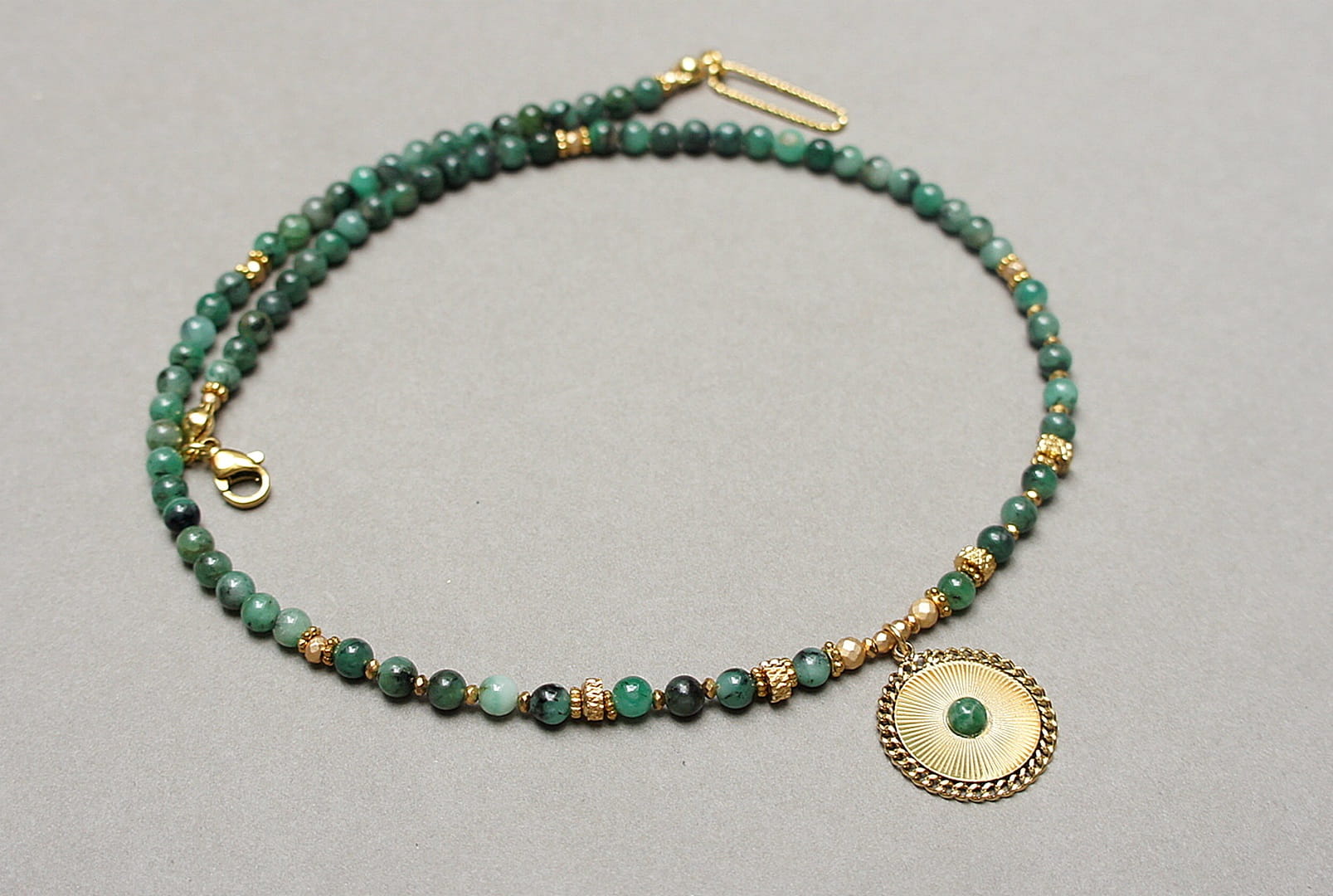 Krótki naszyjnik wykonany w całości z pozłacanej stali szlachetnej oraz naturalnych, szlachetnych kamieni - szmaragdy [4mm], hematyt fasetowany [3mm, 2mm], przekładek z hematytu [1mm] oraz zawieszki z naturalnym kamieniem. . Naszyjnik o długości ok. 42cm. Biżuteria ozdobnie zapakowana.