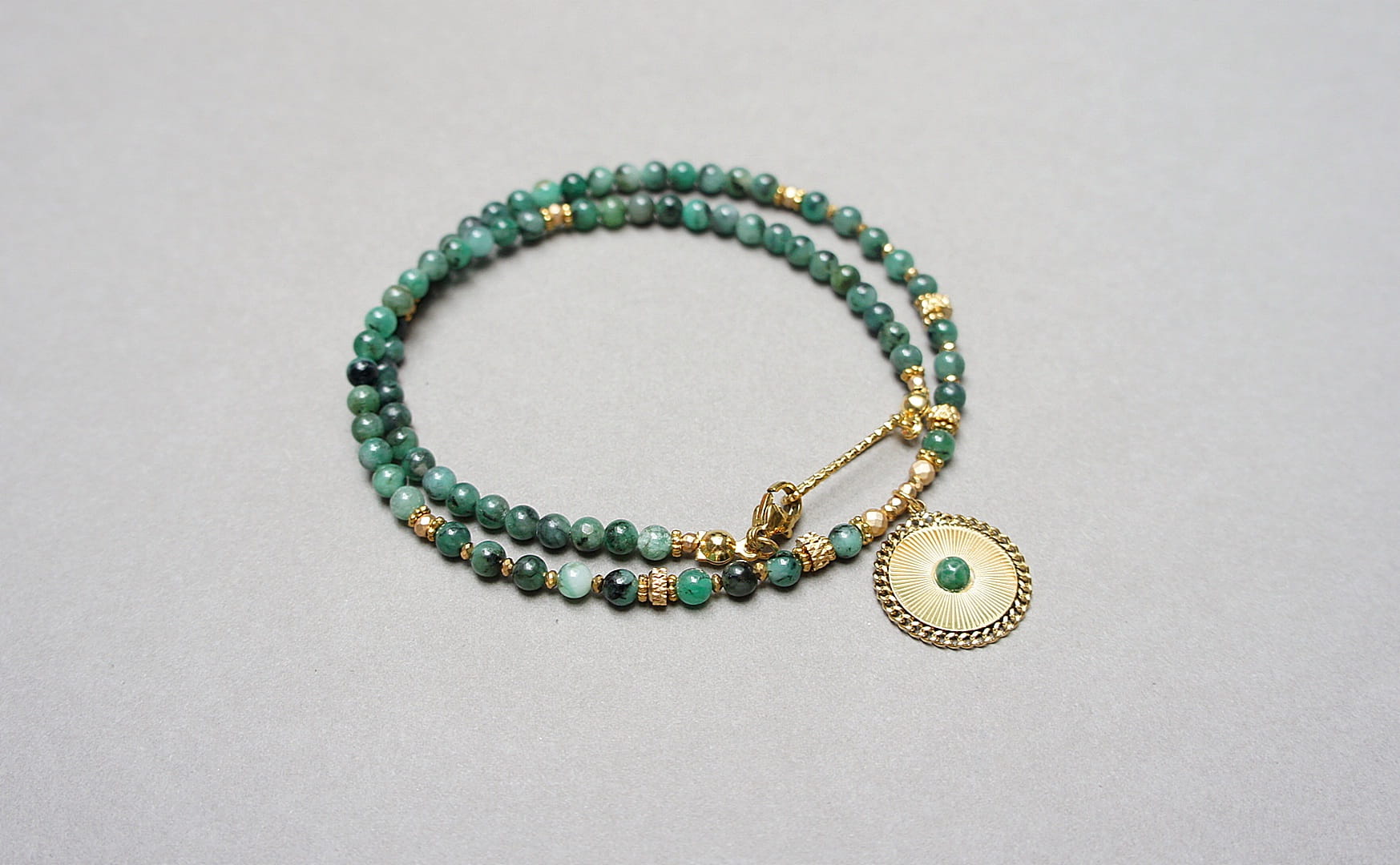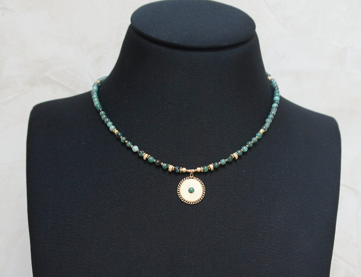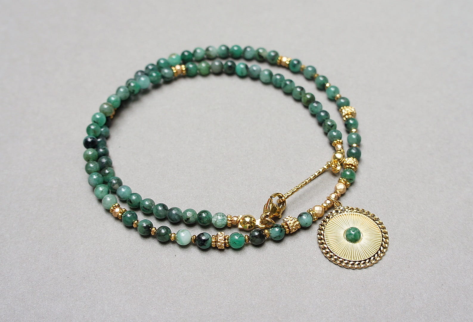Krótki naszyjnik wykonany w całości z pozłacanej stali szlachetnej oraz naturalnych, szlachetnych kamieni - szmaragdy [4mm], hematyt fasetowany [3mm, 2mm], przekładek z hematytu [1mm] oraz zawieszki z naturalnym kamieniem. . Naszyjnik o długości ok. 42cm. Biżuteria ozdobnie zapakowana.