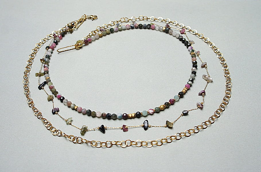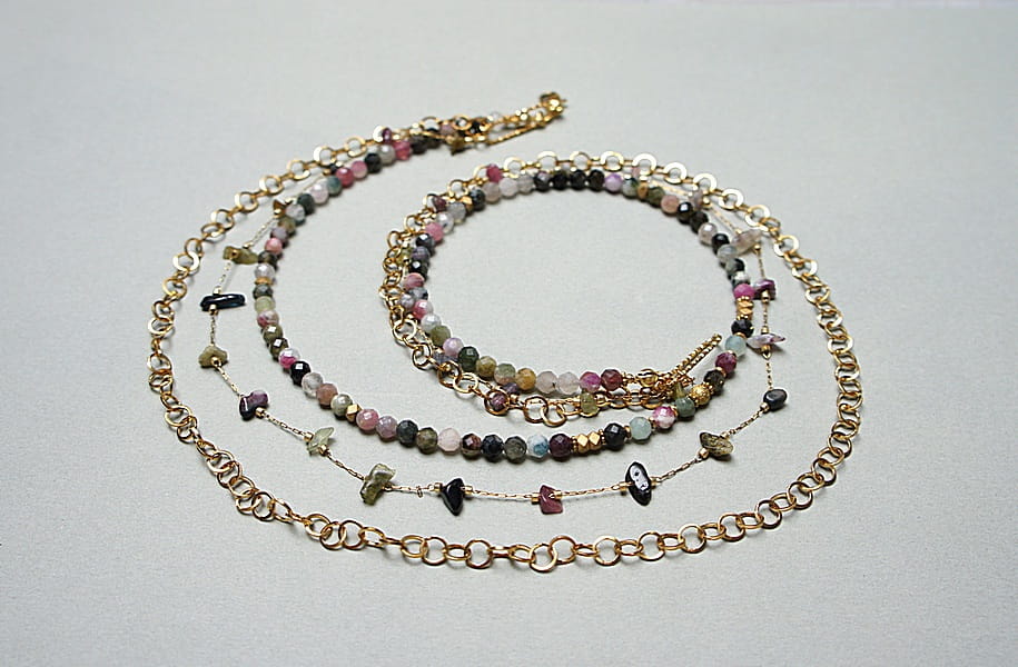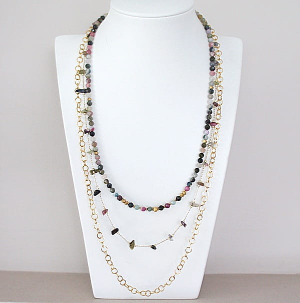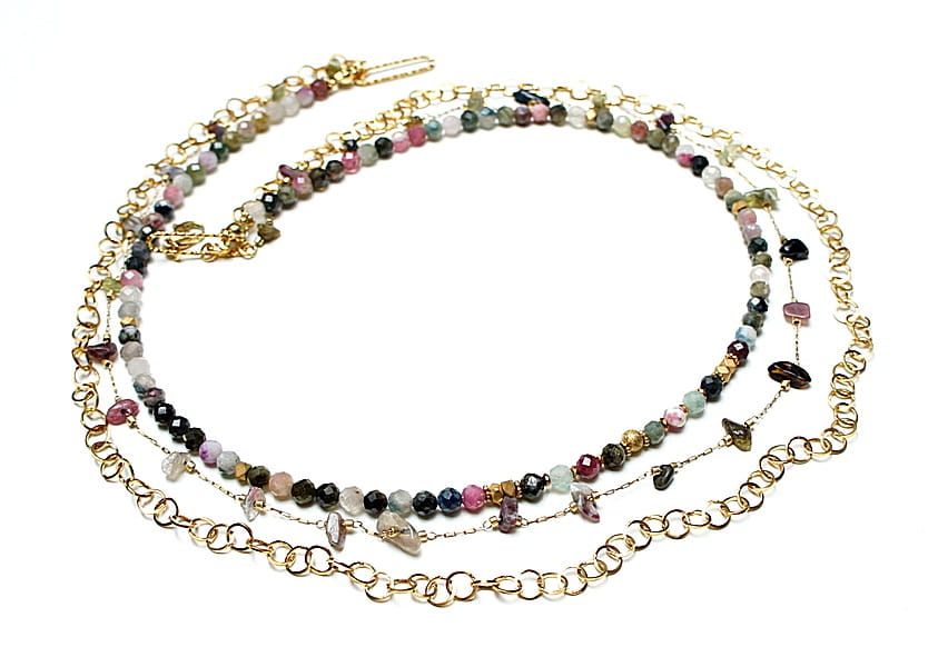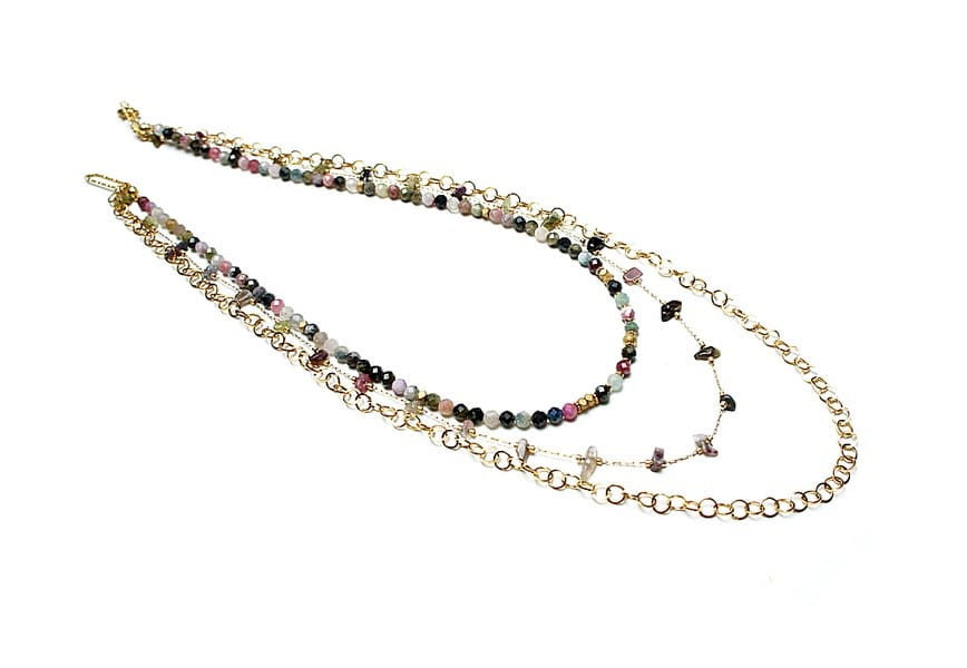 Potrójny naszyjnik wykonany w całości z pozłacanej stali szlachetnej oraz naturalnych, szlachetnych kamieni - fasetowane kuleczki turmalinu [3,5mm], bryłki turmalinu [ok. 9mm] oraz przekładek z hematytu [3 x 2mm]. Naszyjniki o długości ok. 44,5cm, 51,5cm i 58cm.