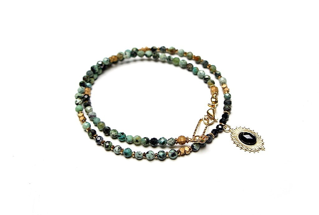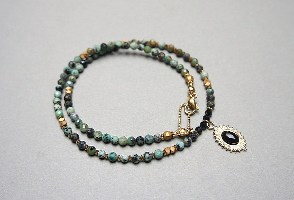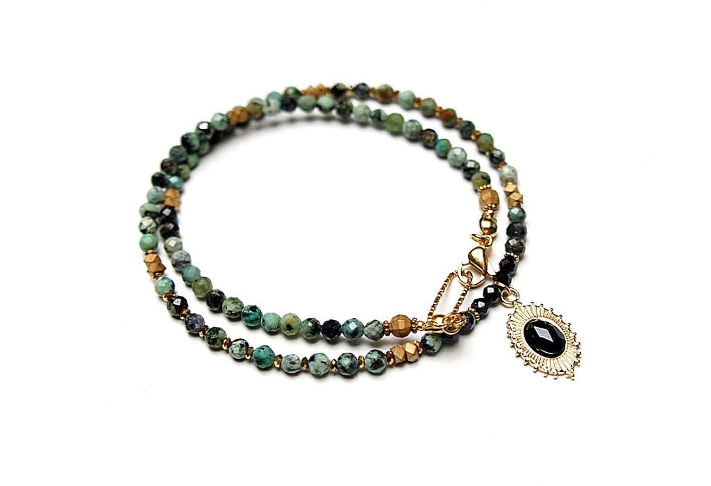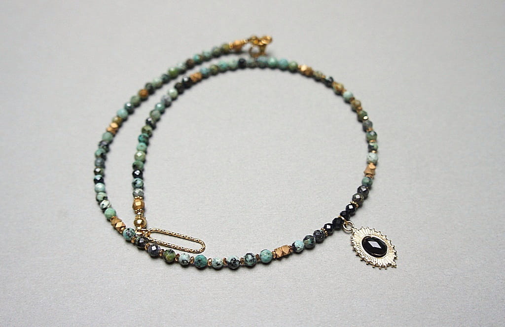 Krótki, delikatny naszyjnik wykonany w całości z pozłacanej stali szlachetnej oraz szlachetnych kamieni - fasetowanych, naturalnych turkusów [3mm], przekładek z hematytu [1mm; 3 x 2mm, 5mm], kryształków fasetowanych [3mm], zawieszki z onyksem. Naszyjnik o długości ok. 42,5cm. Biżuteria ozdobnie zapakowana.