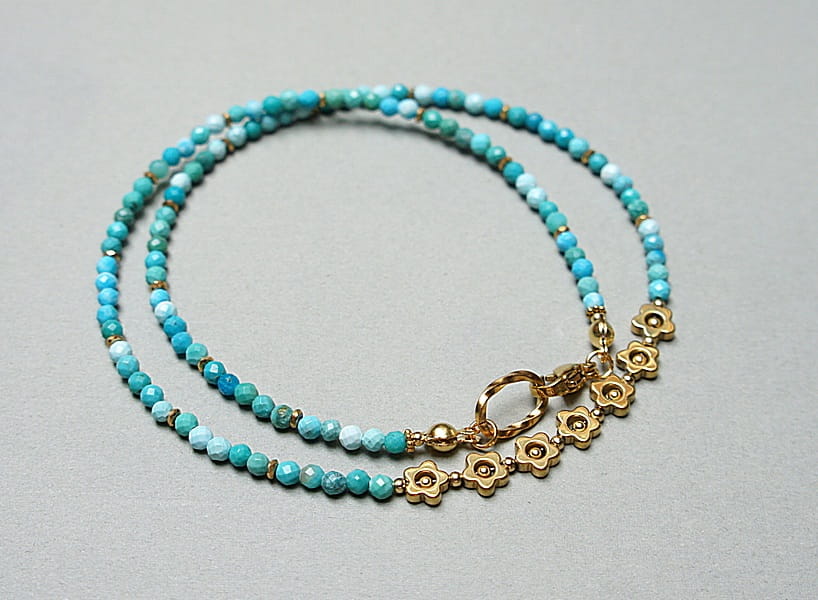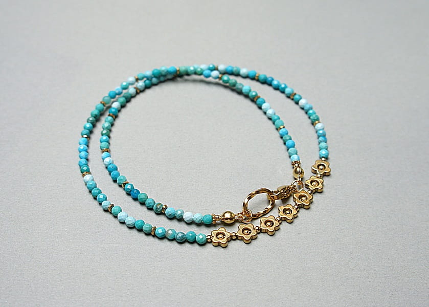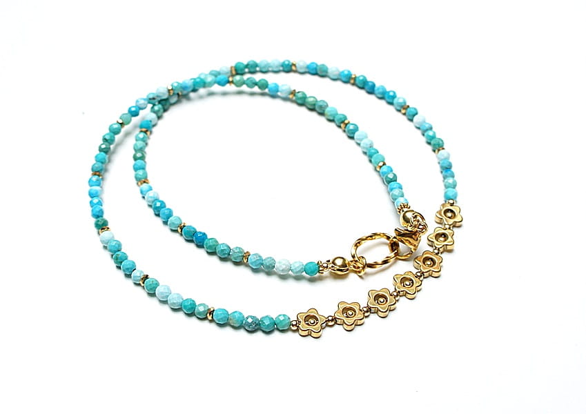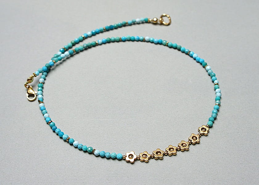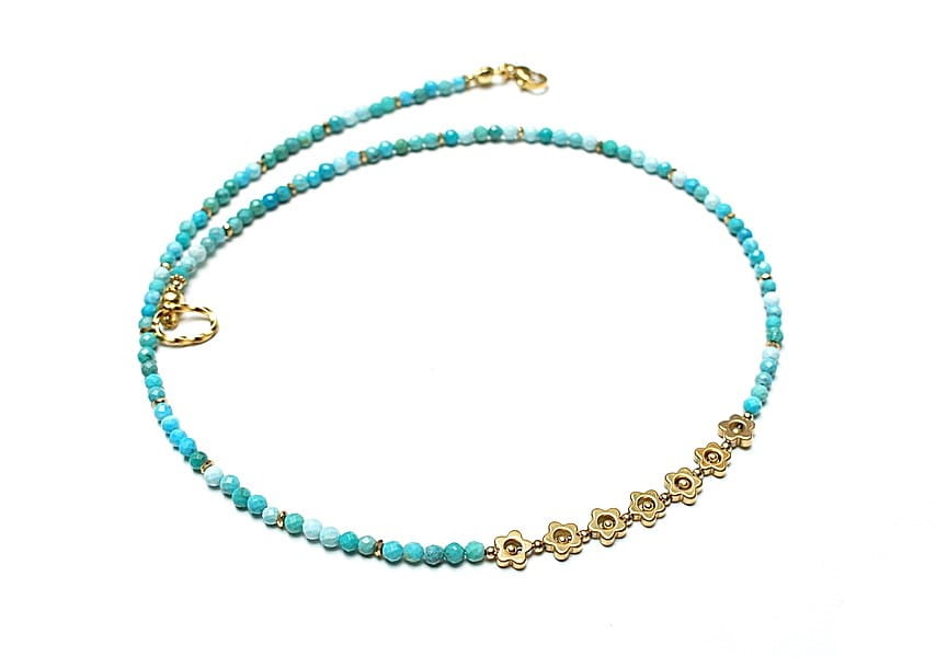 Krótki, delikatny naszyjnik wykonany w całości z pozłacanej stali szlachetnej oraz szlachetnych kamieni - fasetowanych, naturalnych turkusów w intensywnym turkusowym kolorze [3mm], kwiatków z hematytu [6mm], przekładek z hematytu [1mm]. Naszyjnik o długości ok. 42cm. Biżuteria ozdobnie zapakowana.