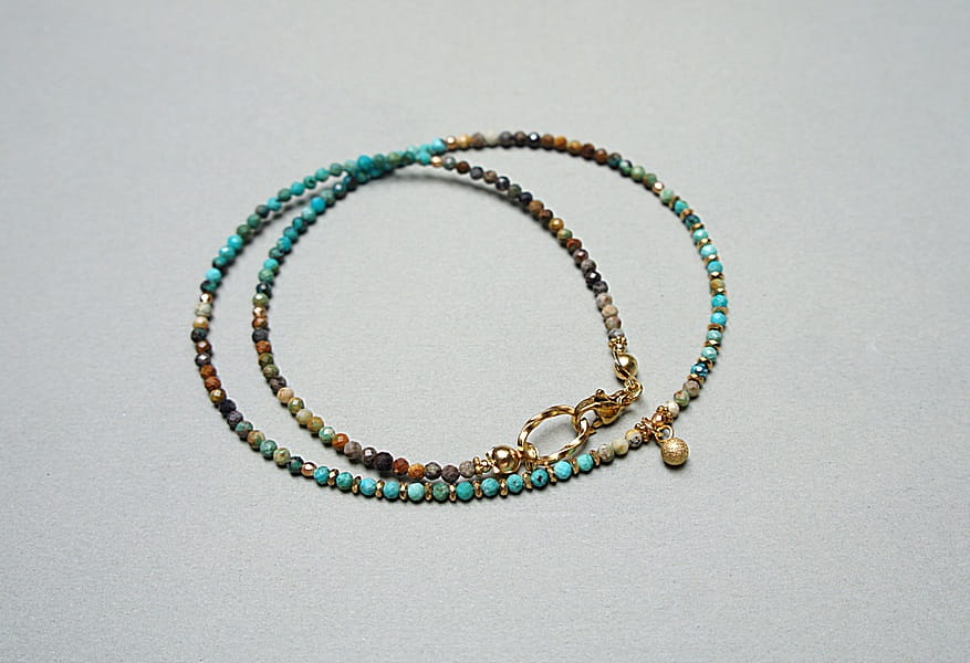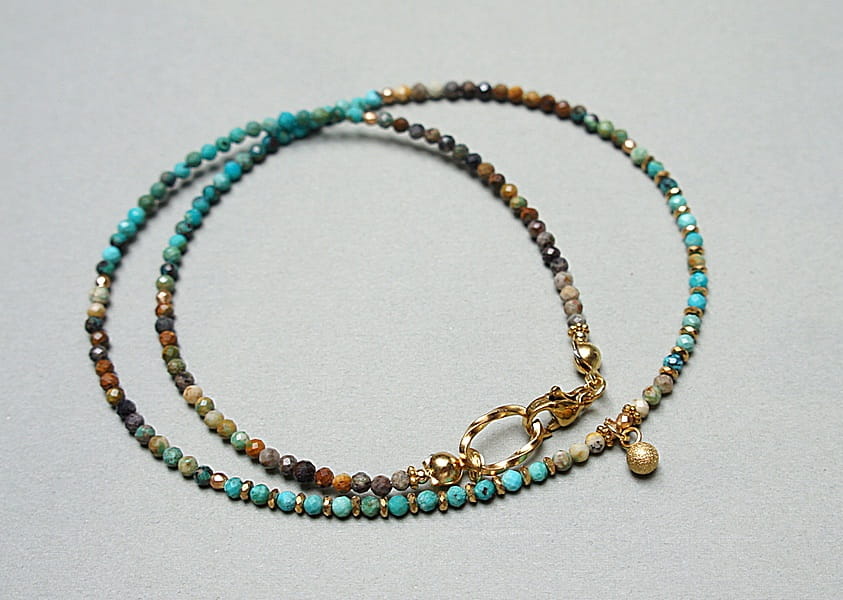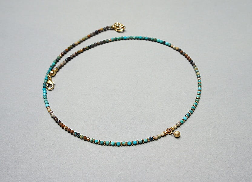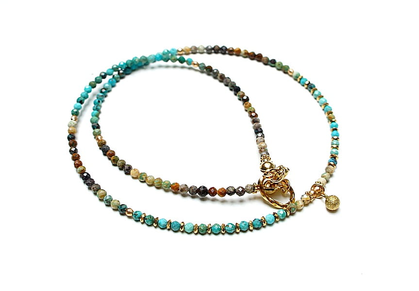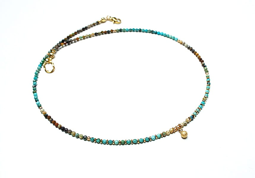 Krótki, delikatny naszyjnik wykonany w całości z pozłacanej stali szlachetnej oraz szlachetnych kamieni - fasetowanych, naturalnych turkusów [2mm], fasetowanego hematytu [2mm], przekładek z hematytu [1mm]. Naszyjnik o długości ok. 42cm. Biżuteria ozdobnie zapakowana.