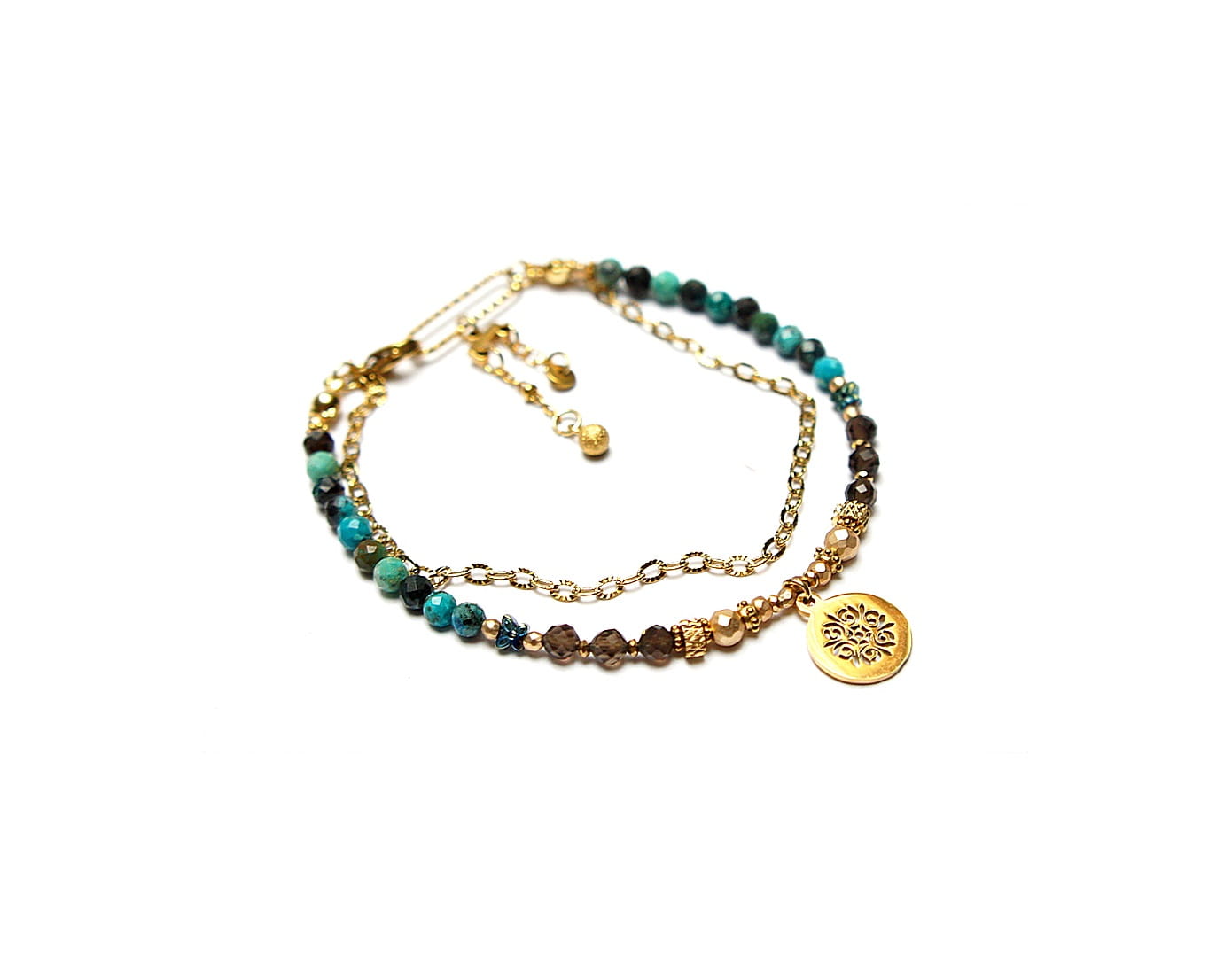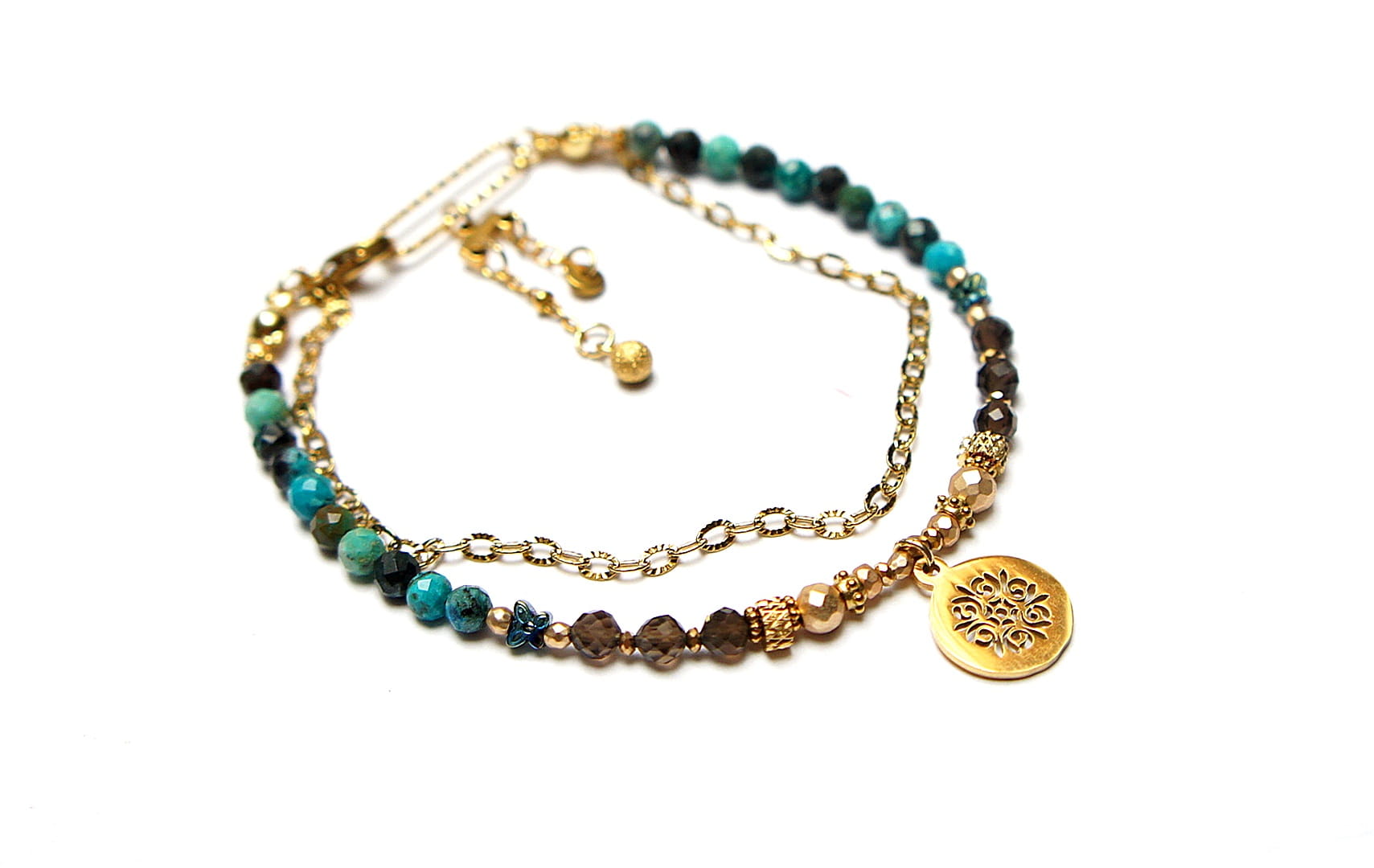Delikatna bransoletka wykonana w całości ze stali szlachetnej pozłacanej, szlachetnych kamieni - naturalnych turkusów [4mm], fasetowanego kwarcu dymnego [4mm], hematytów platerowanych, fasetowanych [2mm, 3mm i 4mm], przekładek z hematytu [4mm - motyle i 1mm]. Całkowita długość bransoletk1 ok. 18cm.
