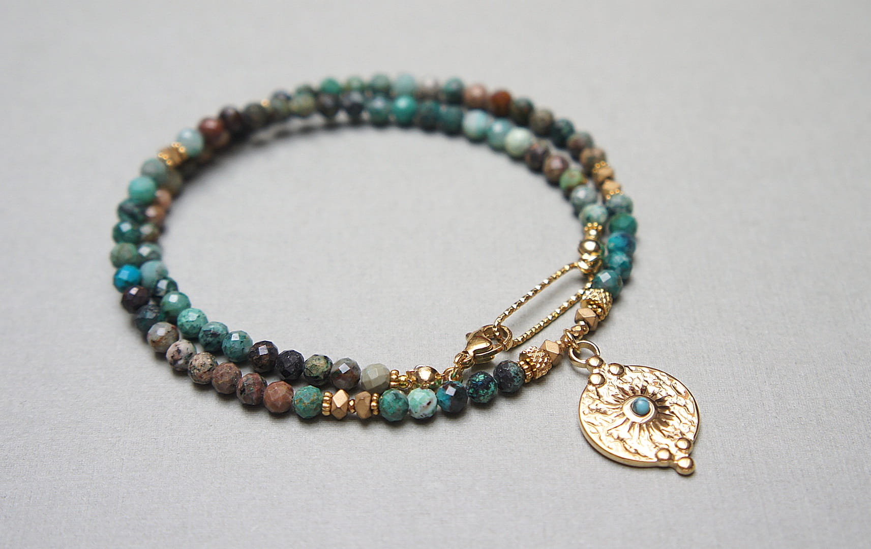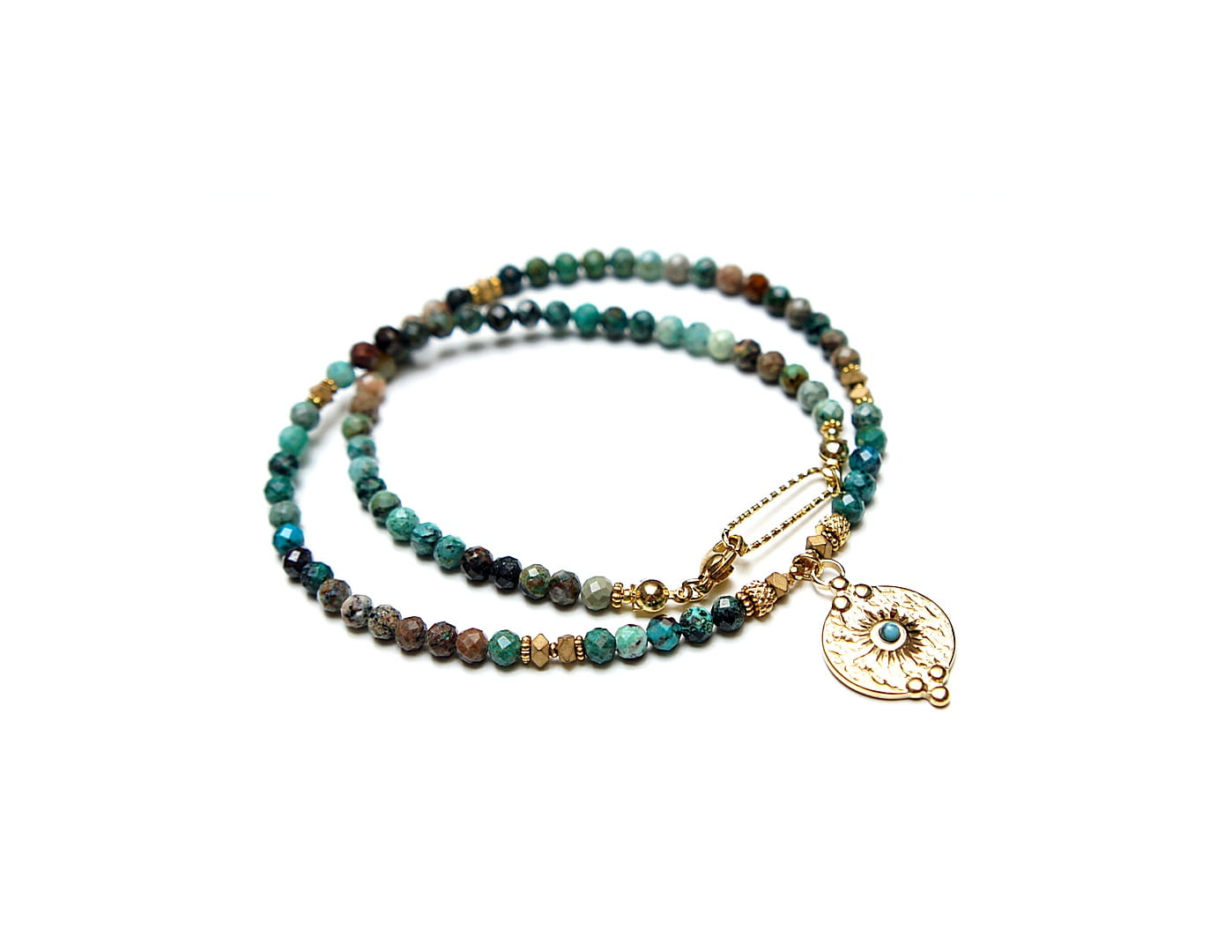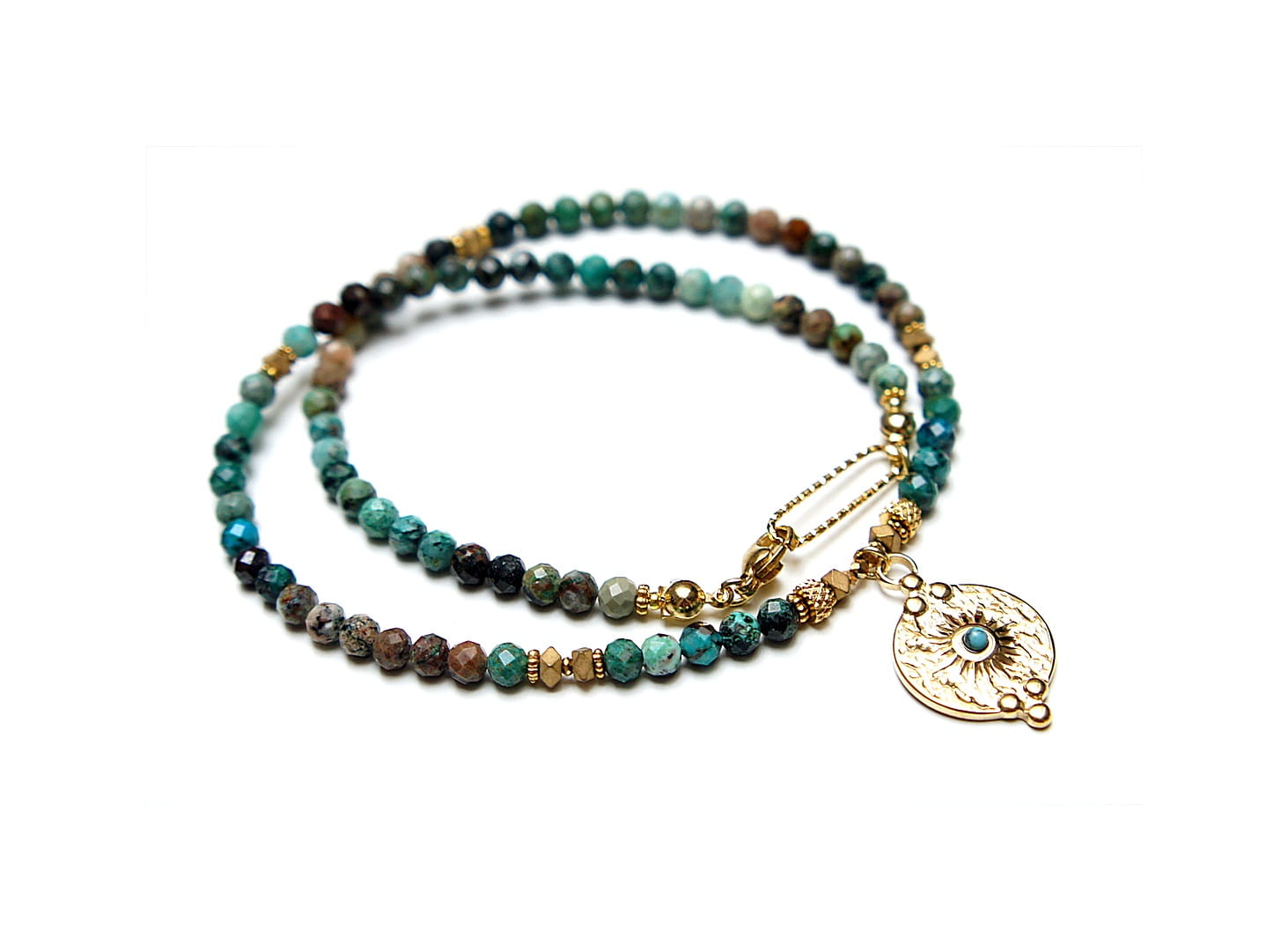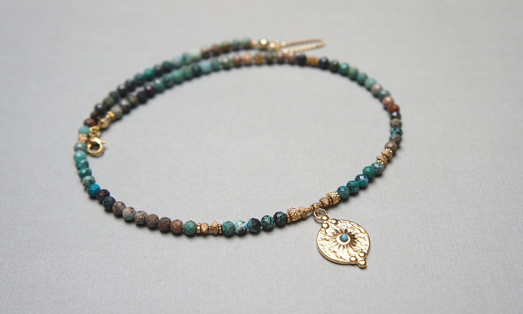 Krótki, delikatny naszyjnik wykonany w całości z pozłacanej stali szlachetnej oraz szlachetnych kamieni - fasetowanych, naturalnych turkusów [4mm], przekładek z hematytu [3 x 2mm i 1mm], hematytu fasetowanego [2mm] oraz zawieszki z naturalnym kamieniem. Naszyjnik o długości ok. 41cm.