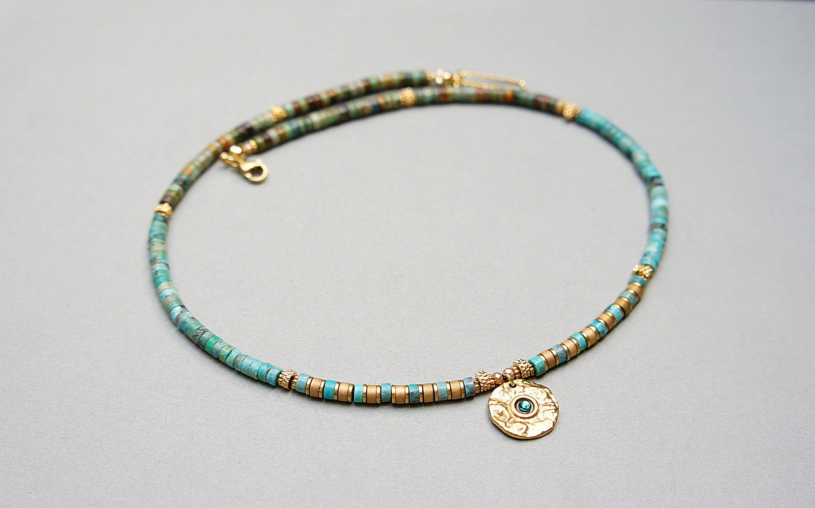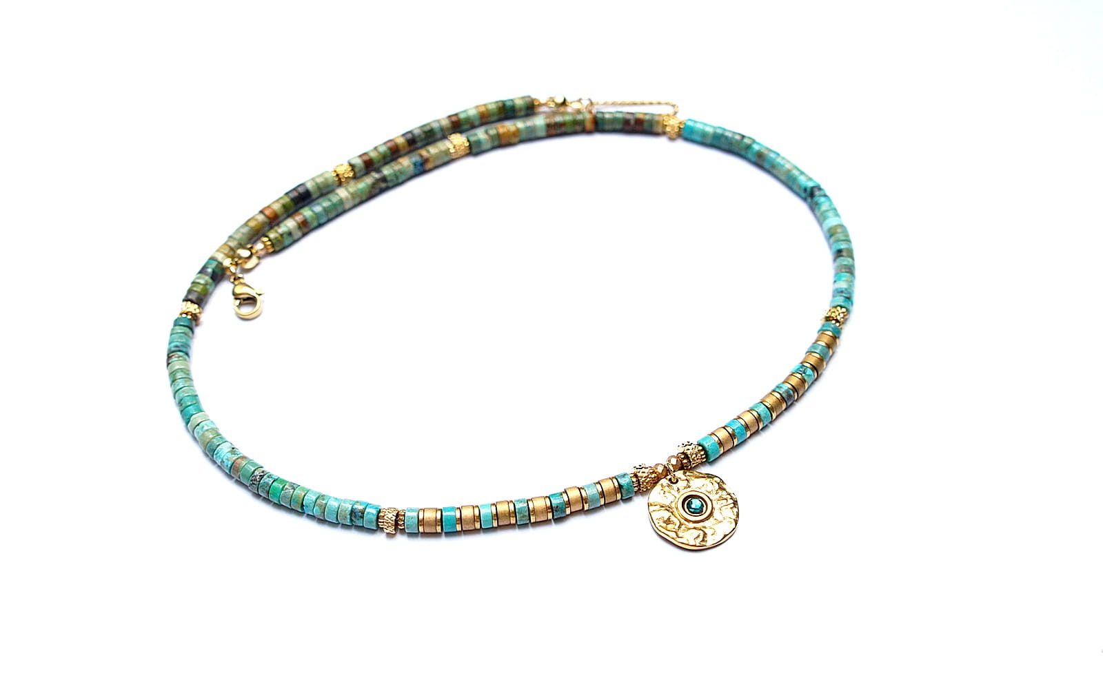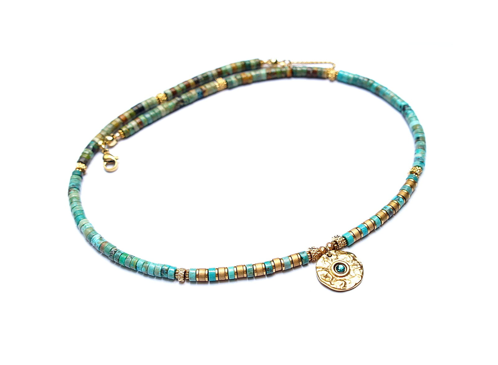 Krótki naszyjnik wykonany w całości z pozłacanej stali szlachetnej oraz kamieni - talarki naturalnych turkusów [4 x 2mm], talarki matowego hematytu [4 x 2mm], hematytu fasetowanego, platerowanego [2mm i 3mm] oraz zawieszki młotkowanej z osadzonym pośrodku kryształkiem Swarovski. Naszyjnik o długości ok. 45,5cm. Biżuteria ozdobnie zapakowana.
