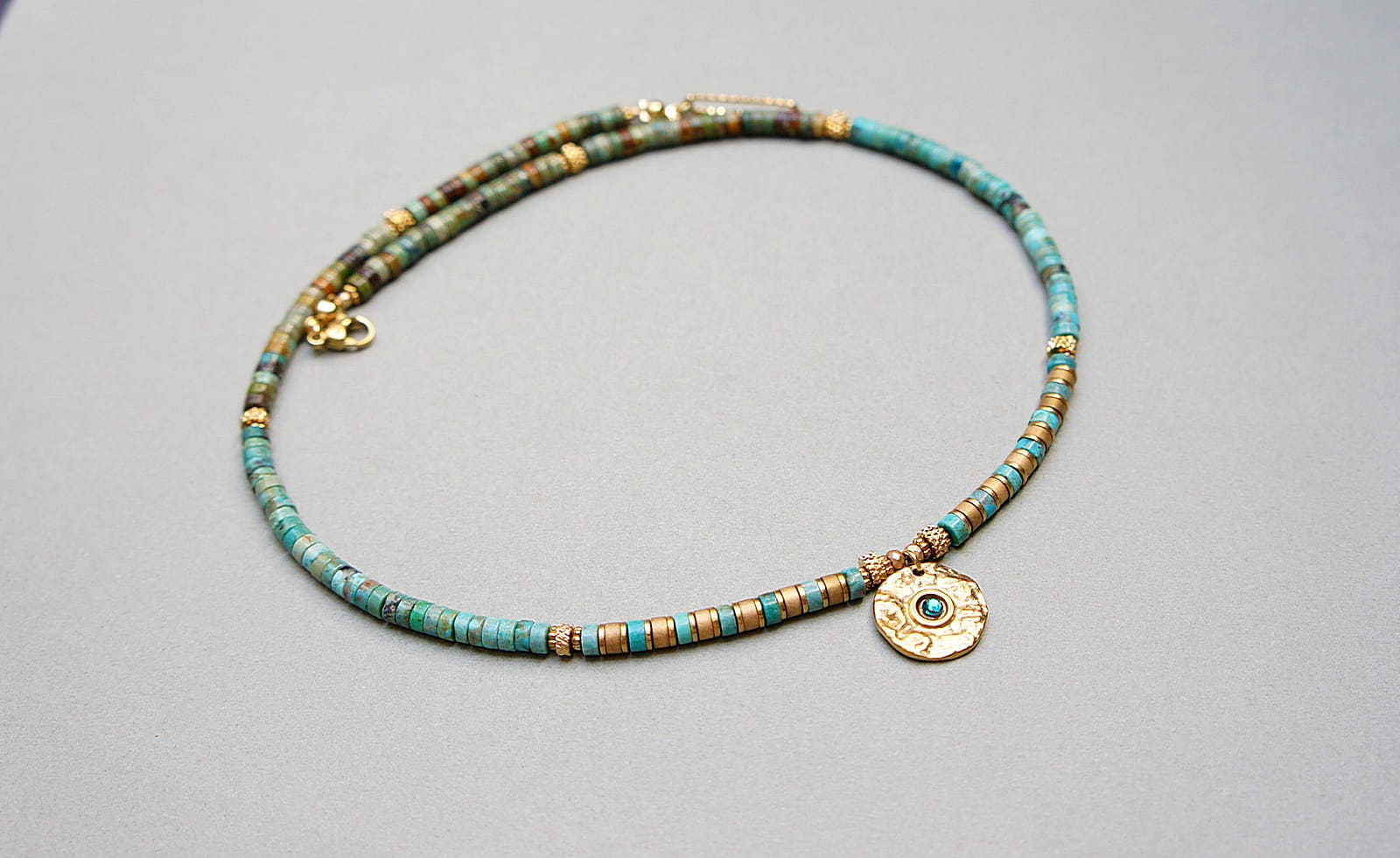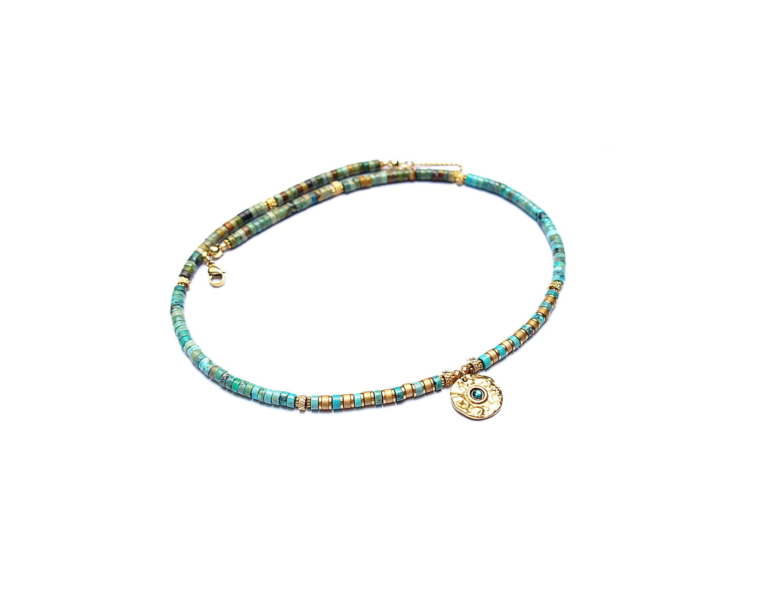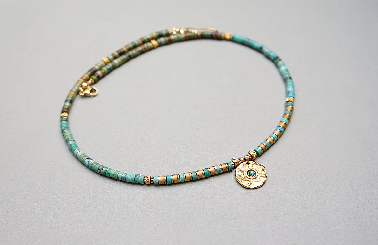 Krótki naszyjnik wykonany w całości z pozłacanej stali szlachetnej oraz kamieni - talarki naturalnych turkusów [4 x 2mm], talarki matowego hematytu [4 x 2mm], hematytu fasetowanego, platerowanego [2mm i 3mm] oraz zawieszki młotkowanej z osadzonym pośrodku kryształkiem Swarovski. Naszyjnik o długości ok. 45,5cm. Biżuteria ozdobnie zapakowana.