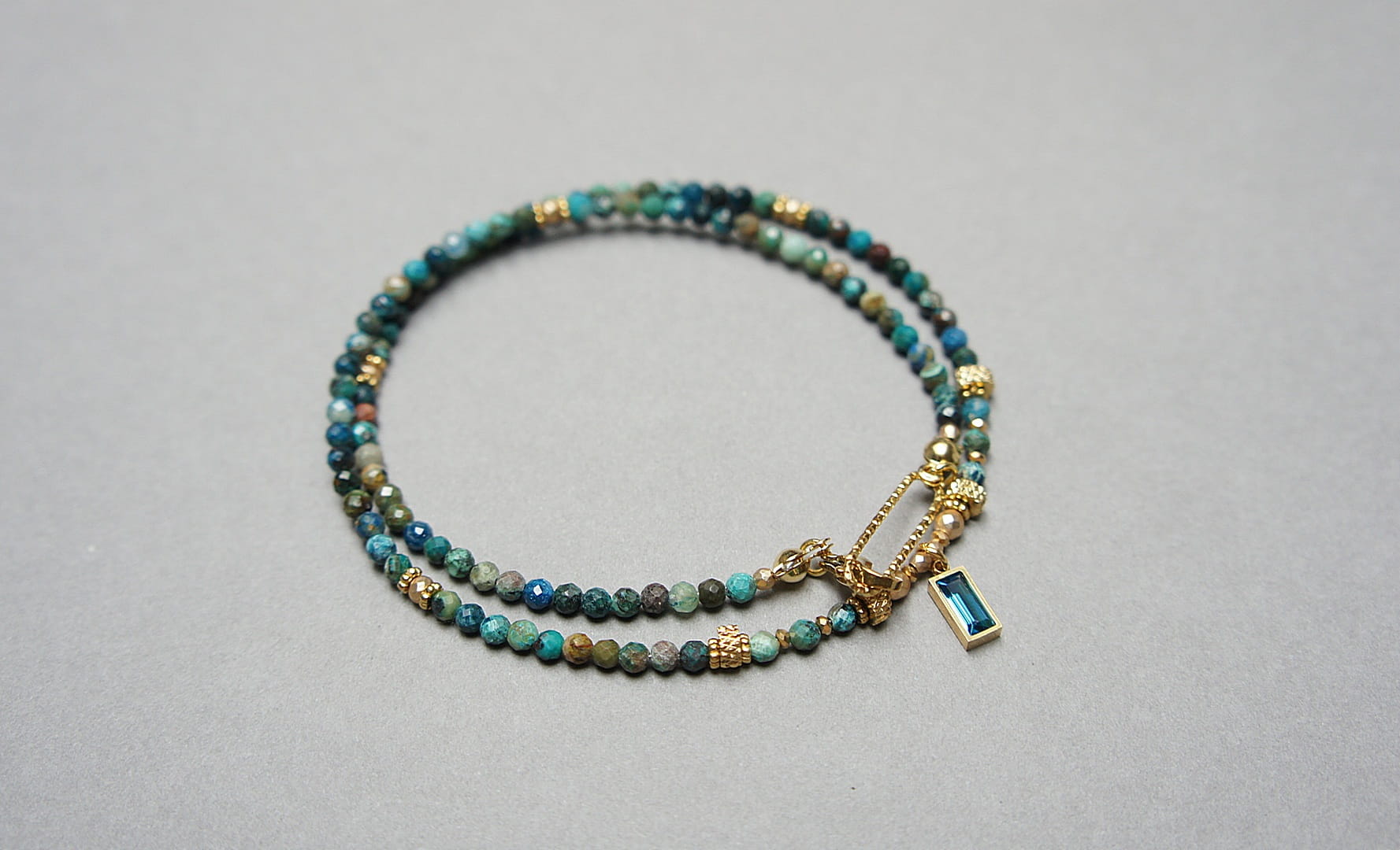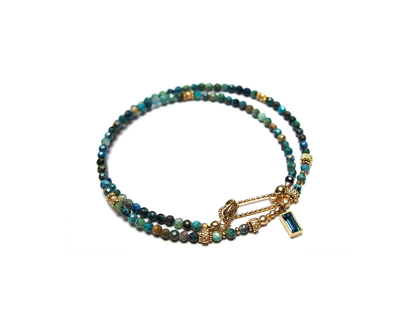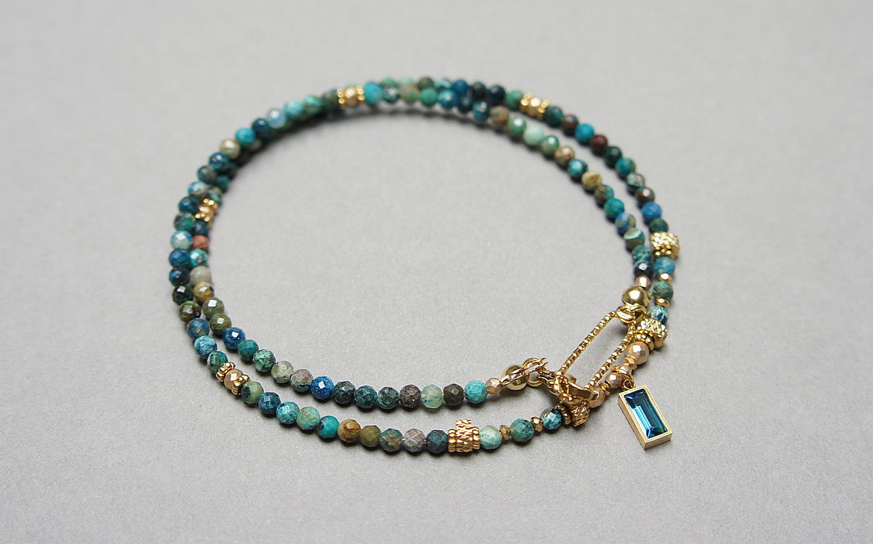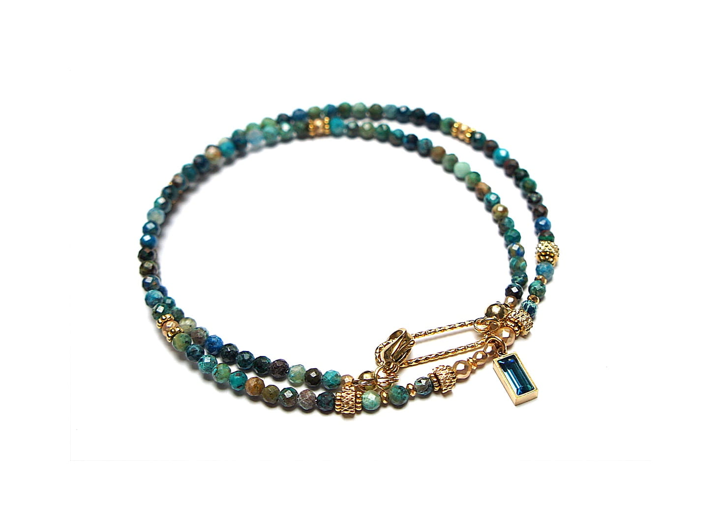 Krótki, delikatny naszyjnik wykonany w całości z pozłacanej stali szlachetnej oraz szlachetnych kamieni - kuleczki naturalnych turkusów [3mm], przekładek z hematytu [1mm], fasetowanych, platerowanych hematytów [2mm i 3mm] oraz zawieszki z cyrkonią w okuciu. Naszyjnik o długości ok. 42,5cm.