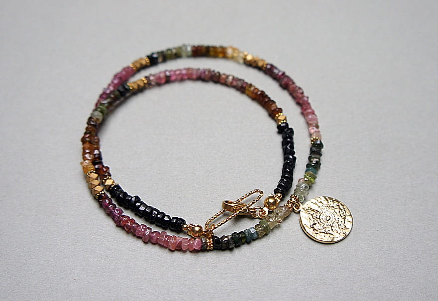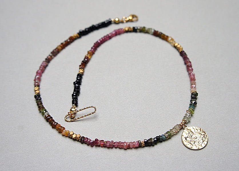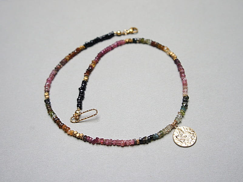 Krótki, delikatny naszyjnik wykonany w całości z pozłacanej stali szlachetnej oraz naturalnych, szlachetnych kamieni - nieregularnych talarków turmalinów [4 x 2mm], przekładek z hematytu [3 x 2mm]. Naszyjnik o długości ok. 42cm.