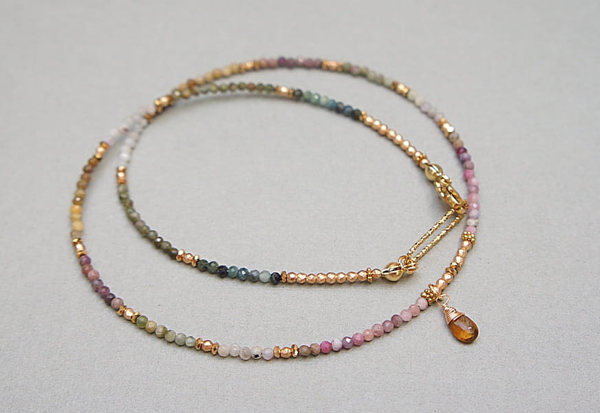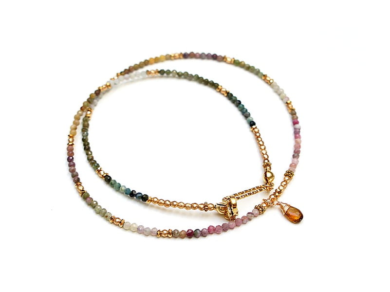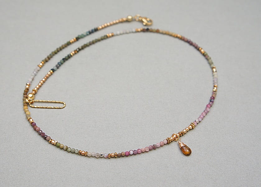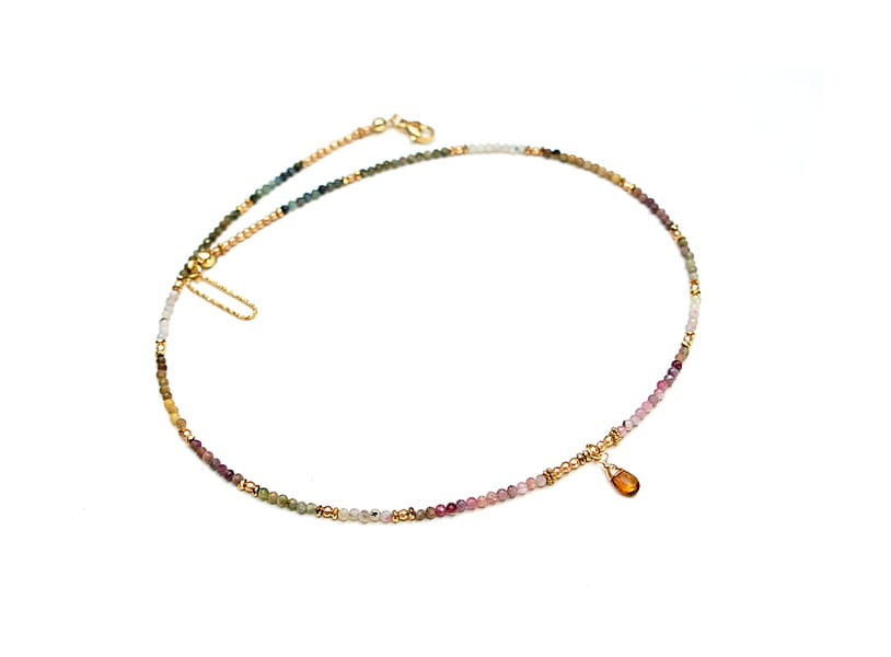 Krótki, delikatny naszyjnik wykonany w całości z pozłacanej stali szlachetnej oraz naturalnych, szlachetnych kamieni - fasetowanych turmalinów [2mm], hematytów fasetowanych [2mm], przekładek z hematytu [1mm] oraz zawieszki z naturalnym turmalinem w kolorze koniakowym. Naszyjnik o długości ok. 43,5cm.