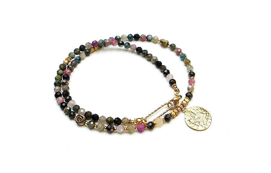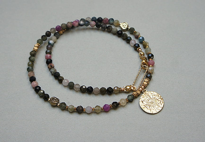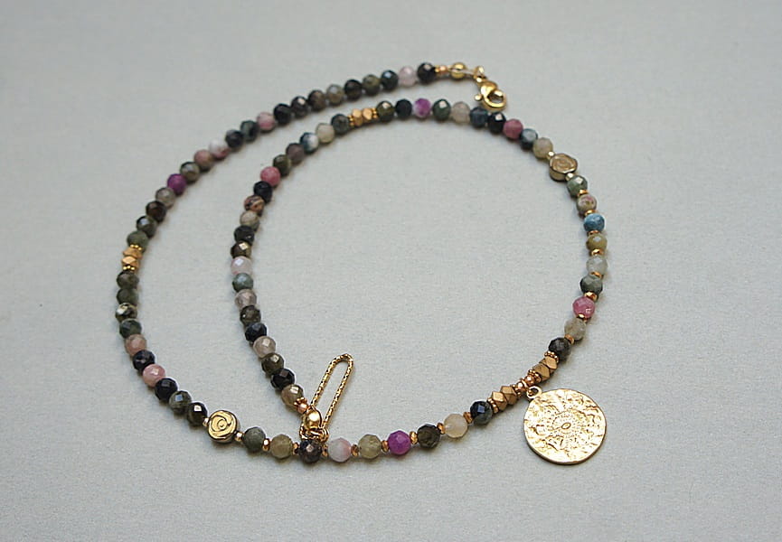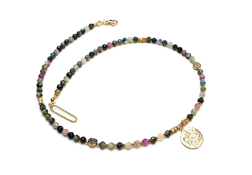 Krótki, delikatny naszyjnik wykonany w całości z pozłacanej stali szlachetnej oraz naturalnych, szlachetnych kamieni - fasetowanych turmalinów [4mm], przekładek z hematytu [1mm, 6mm oraz 3 x 2mm]. Naszyjnik o długości ok. 44,5cm.