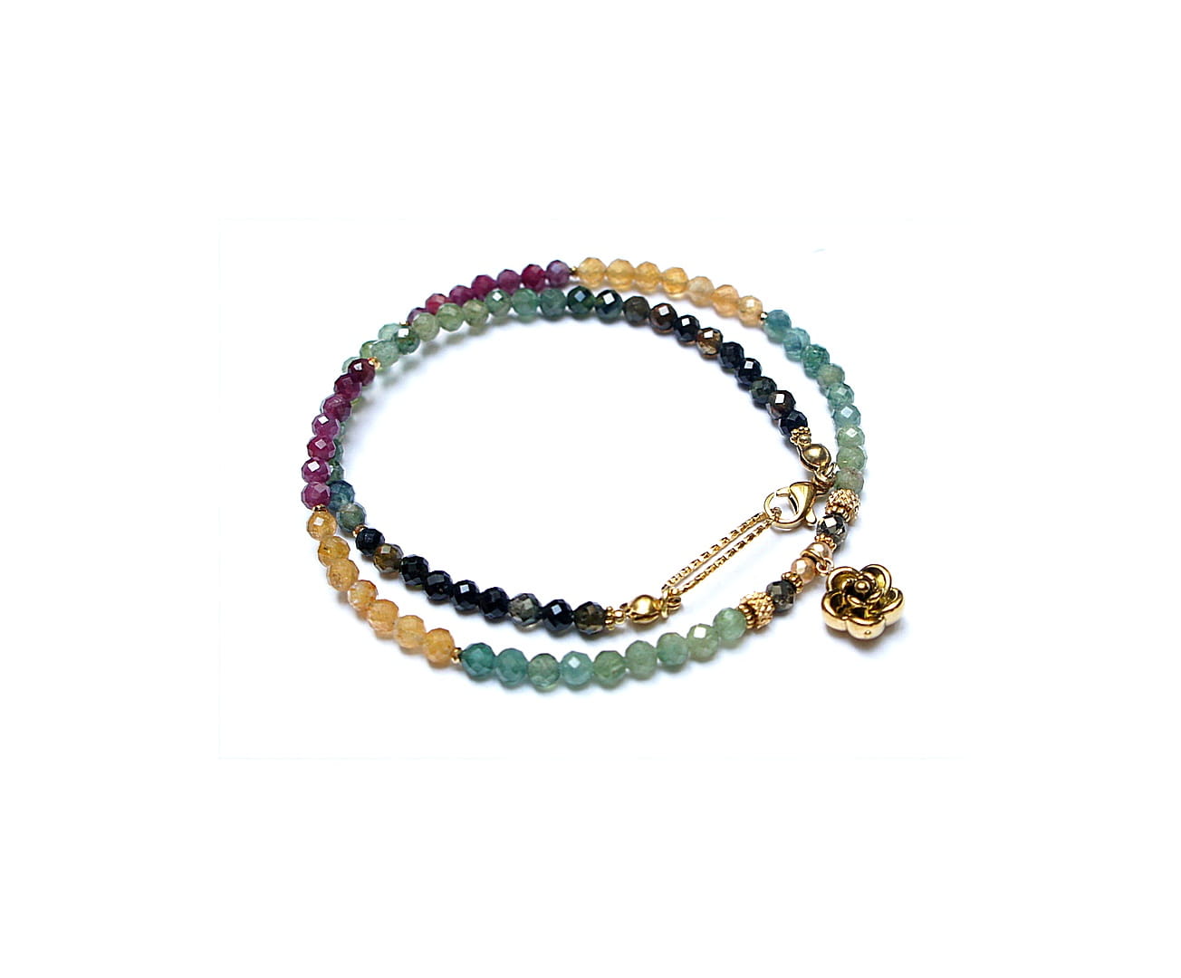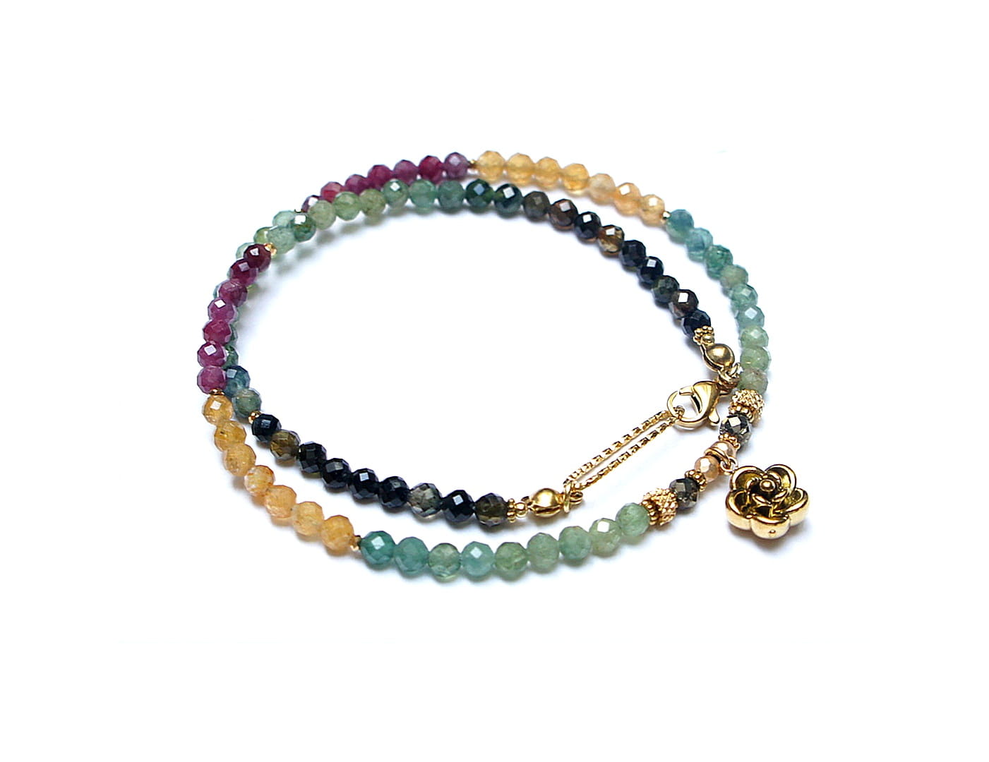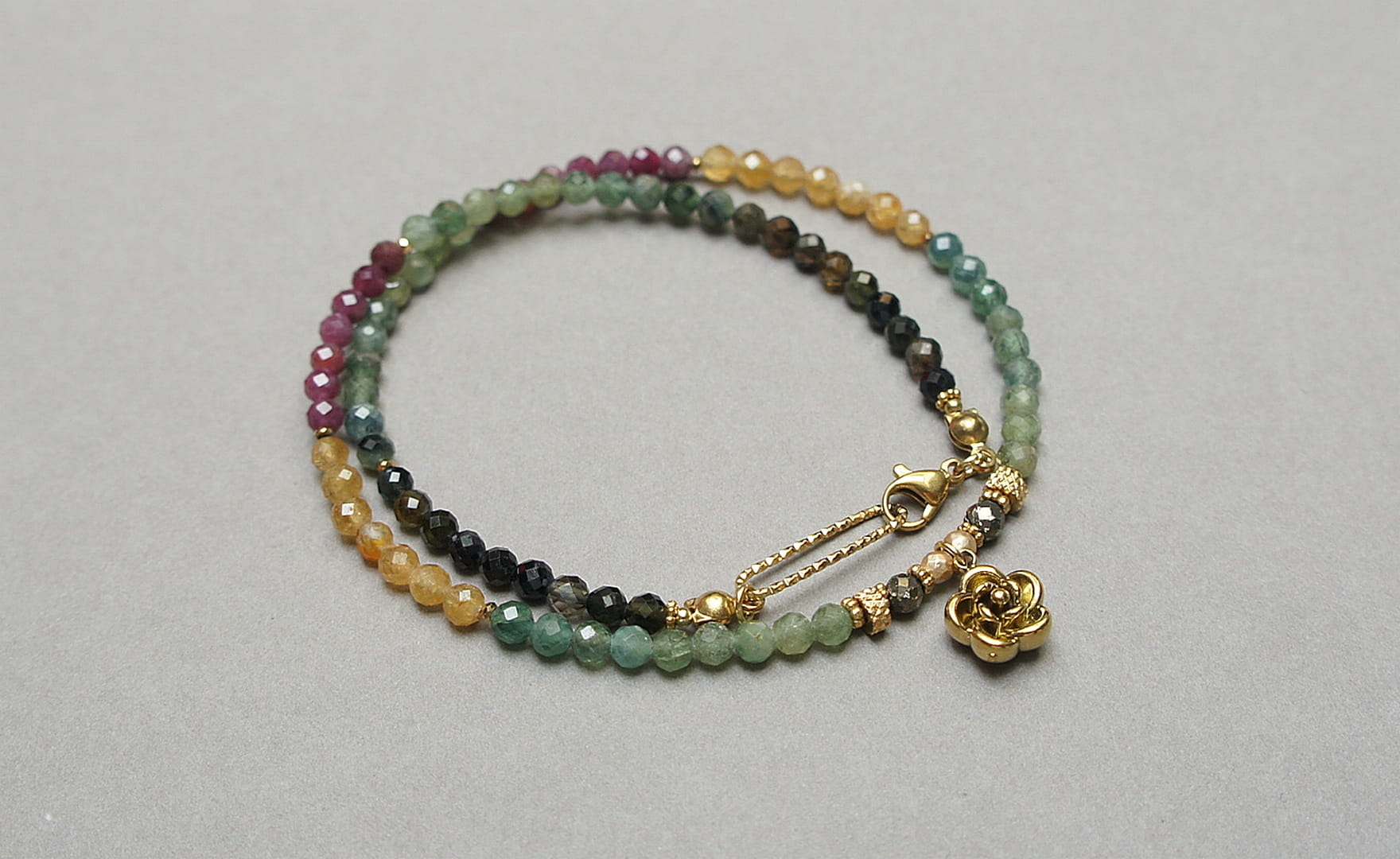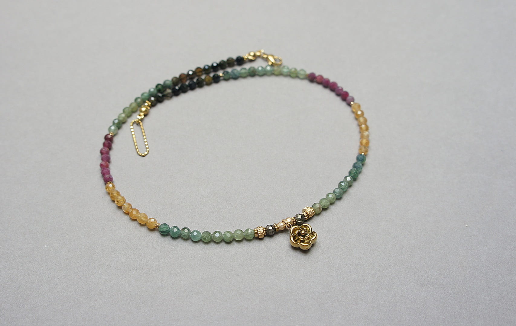 Krótki, delikatny naszyjnik wykonany w całości z pozłacanej stali szlachetnej oraz naturalnych, szlachetnych kamieni - fasetowanych turmalinów [4mm], fasetowanego pirytu o surowym wyglądzie [3,5mm], fasetowanego, platerowanego hematytu [3mm], przekładek z hematytu [1mm]. Naszyjnik o długości ok. 41cm.