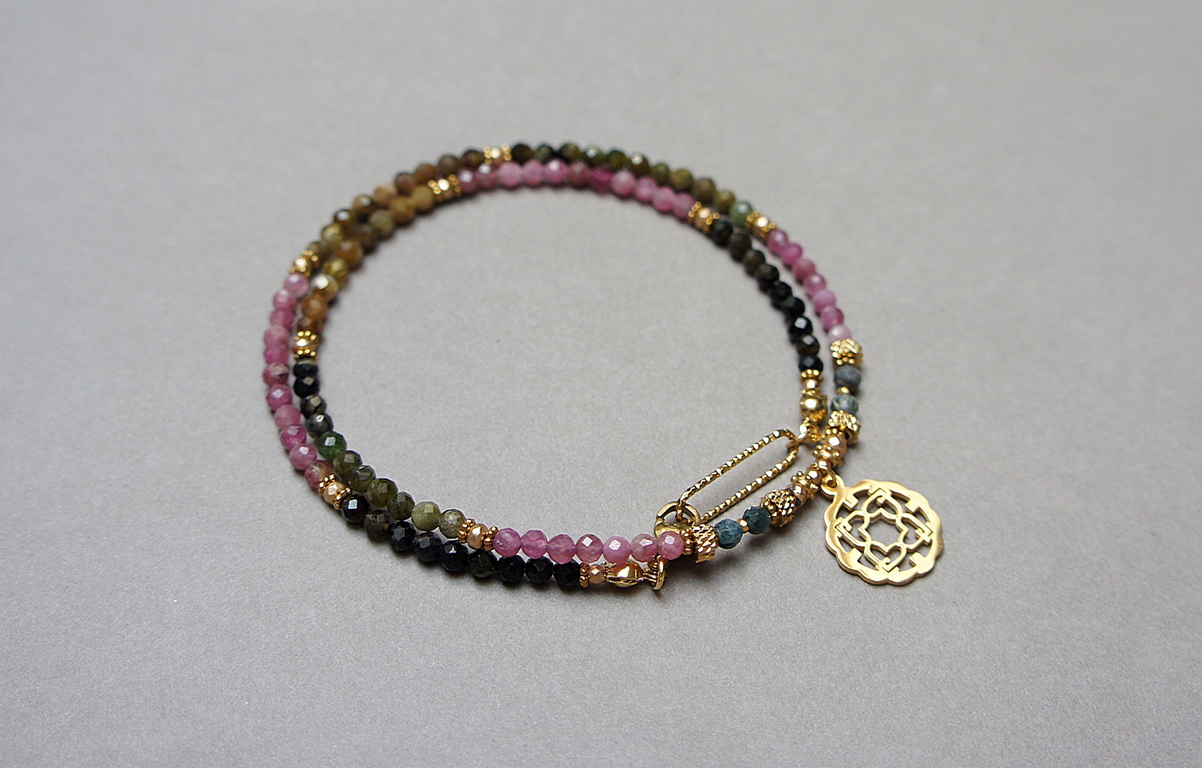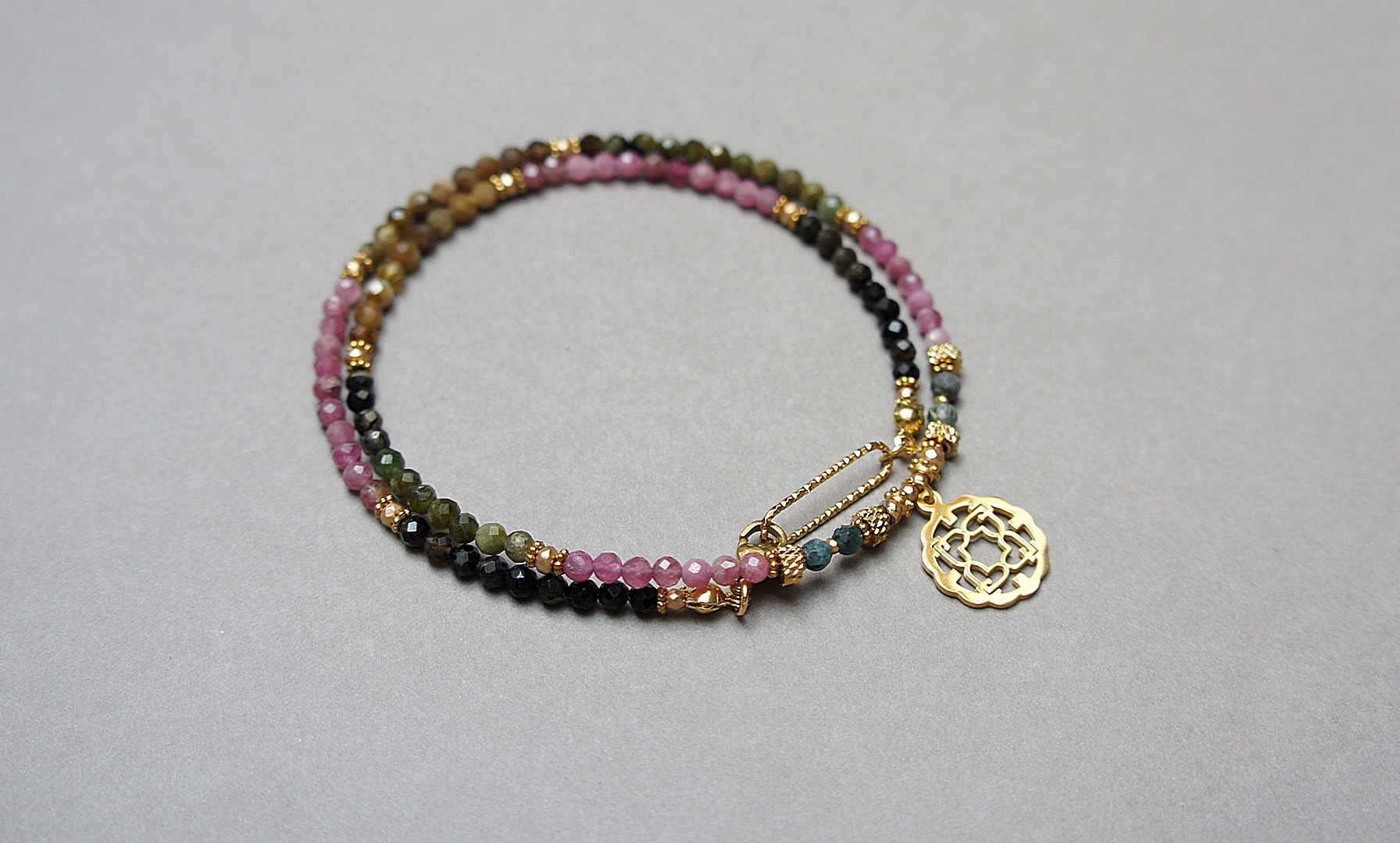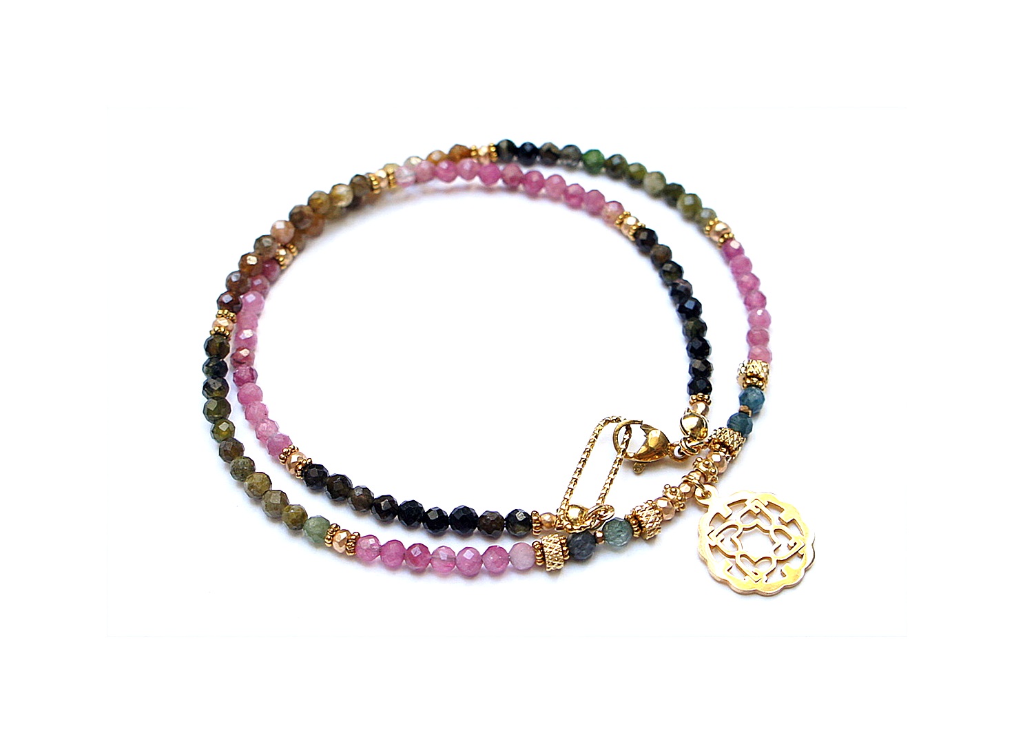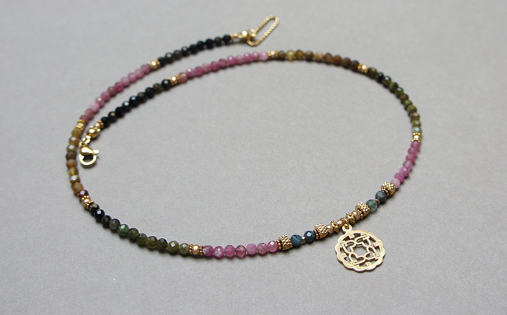 Krótki, delikatny naszyjnik wykonany w całości z pozłacanej stali szlachetnej oraz naturalnych, szlachetnych kamieni - fasetowanych turmalinów [3mm], fasetowanych, platerowanych hematytów [2mm i 3x2mm], przekładek z hematytu [1mm]. Naszyjnik o długości ok. 44cm.