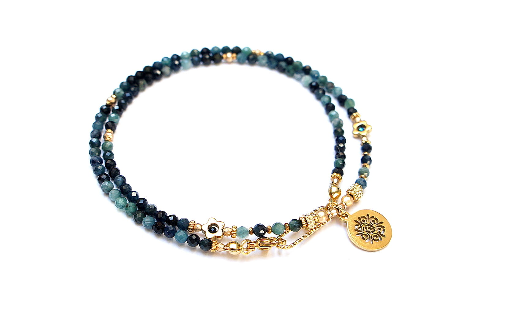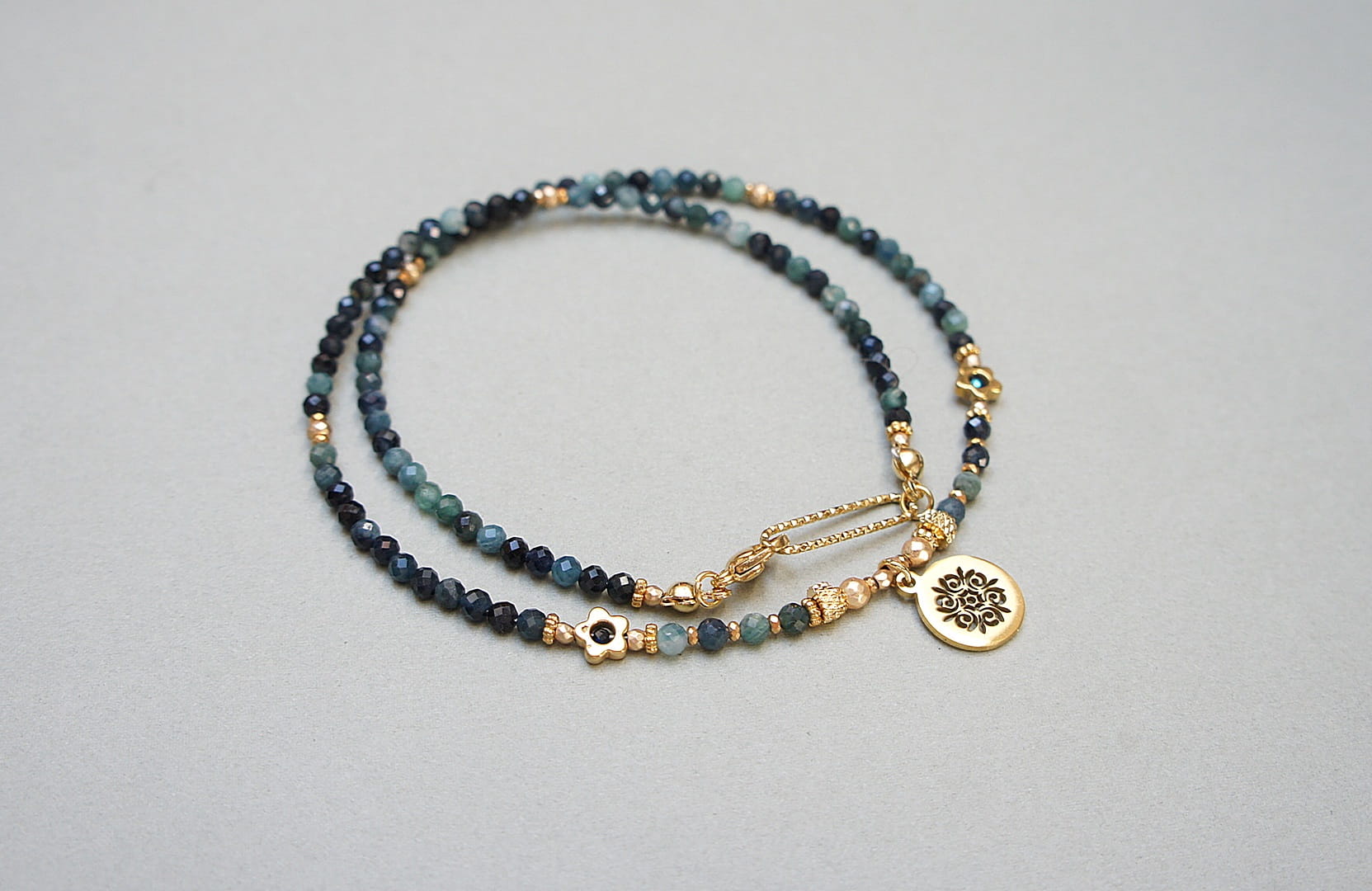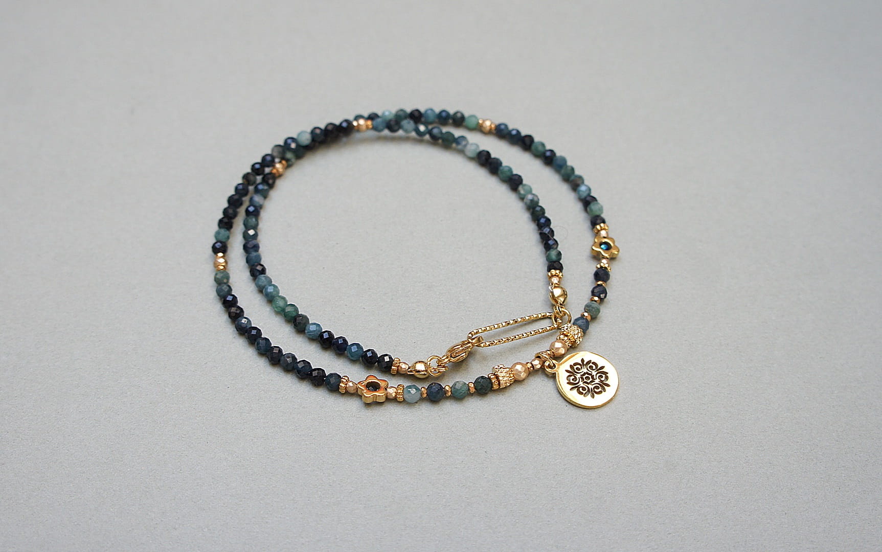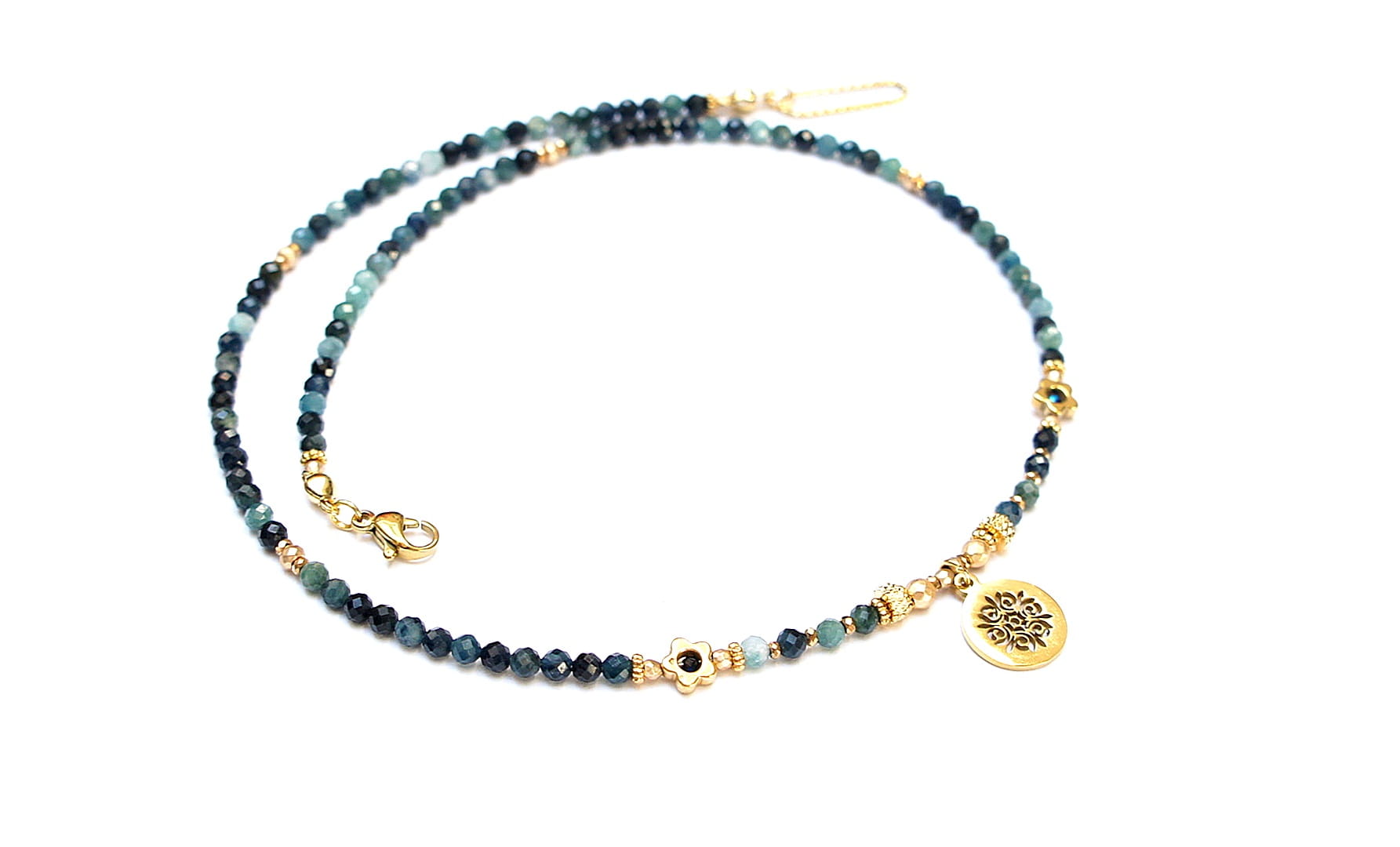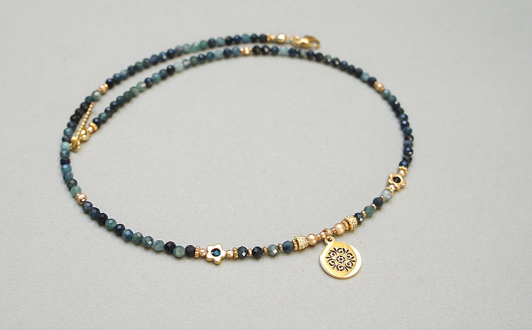 Krótki, delikatny naszyjnik wykonany w całości z pozłacanej stali szlachetnej oraz naturalnych, szlachetnych kamieni - niebieskich turmalinów [3mm], spinelu granatowego, platerowananego [1,5mm], hematytów fasetowanych, platerowanych [2mm i 3mm], przekładek z hematytu [1mm oraz kwiatki 6mm]. Naszyjnik o długości ok. 44cm.