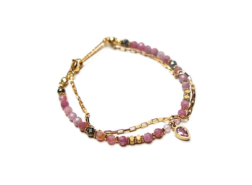 Delikatna bransoletka wykonana w całości ze stali szlachetnej pozłacanej, szlachetnych kamieni - turmalinów fasetowanych [3mm], pirytu fasetowanego o surowej strukturze [3mm], cyrkonii fasetowanych [2mm], przekładek z hematytu [1mm oraz 3 x 2 mm] oraz zawieszki z cyrkonią w okuciu. Bransoletka o długości 19cm. Biżuteria ozdobnie zapakowana.