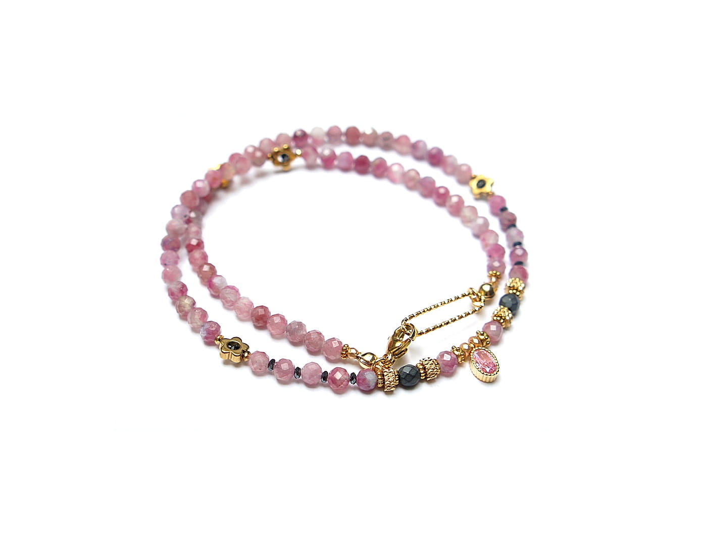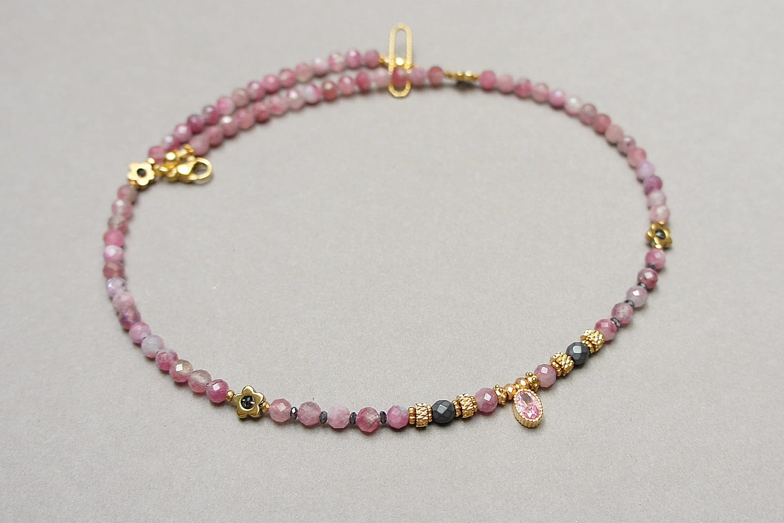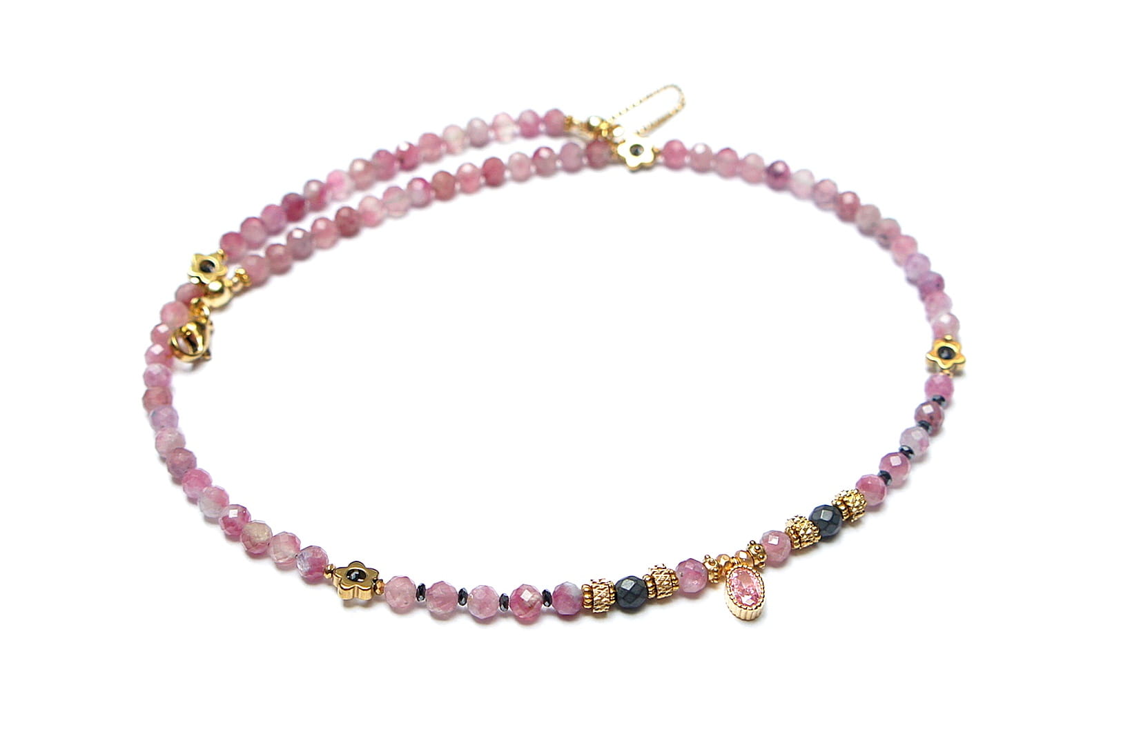 Krótki, delikatny naszyjnik wykonany w całości z pozłacanej stali szlachetnej oraz naturalnych, szlachetnych kamieni - fasetowanych, różowych turmalinów [ok. 3,5mm], przekładek z hematytu [1mm], hematytu fasetowanego, matowego [2mm, 3mm i 4mm] oraz zawieszki z cyrkonią w okuciu. Naszyjnik o długości ok. 42cm.