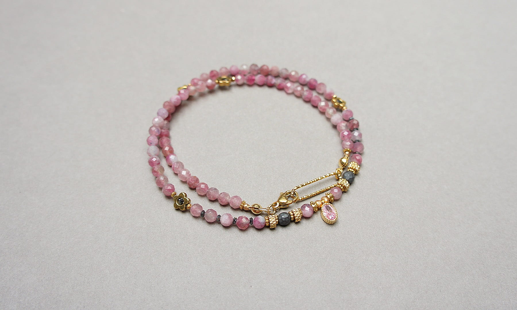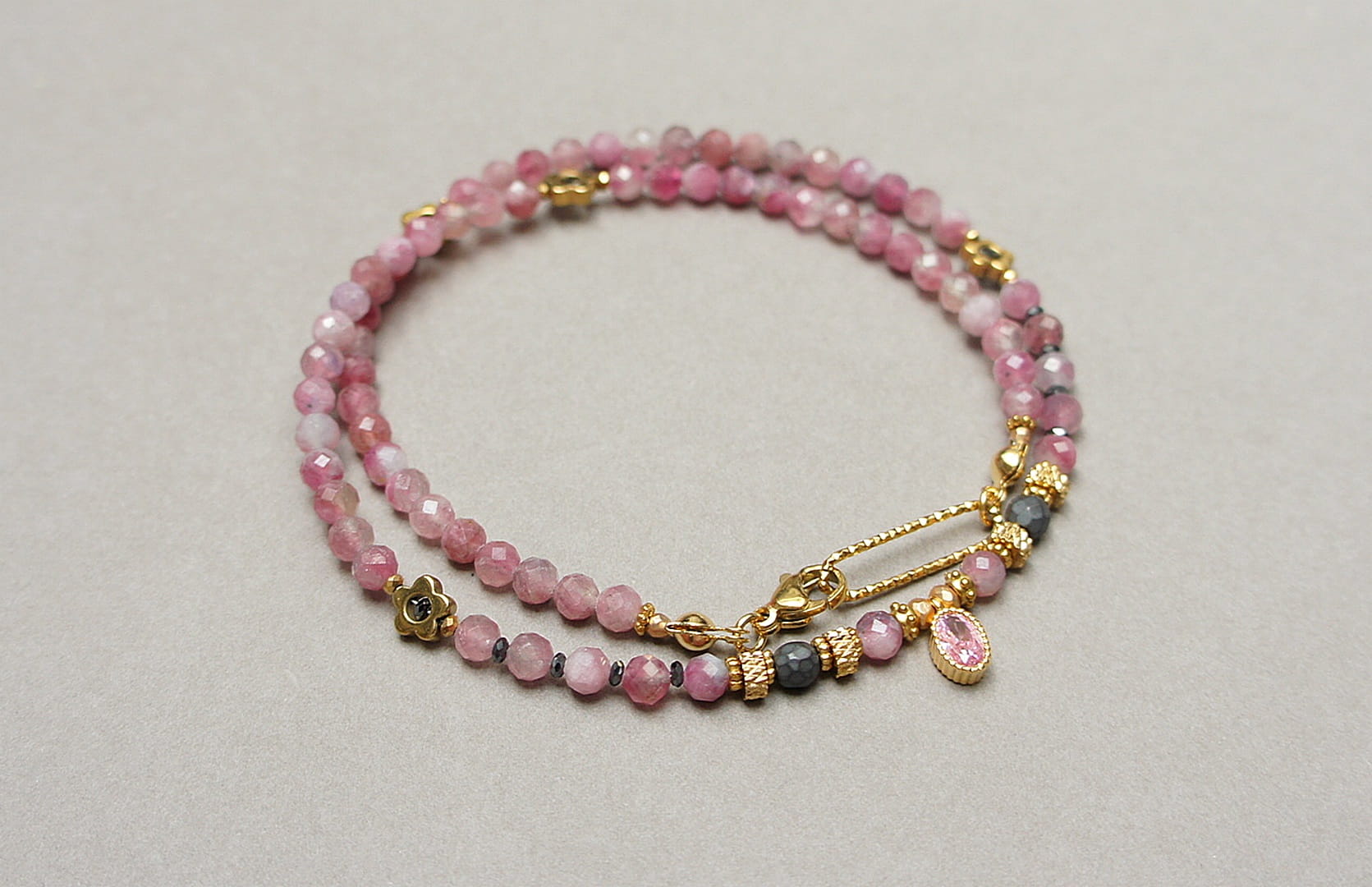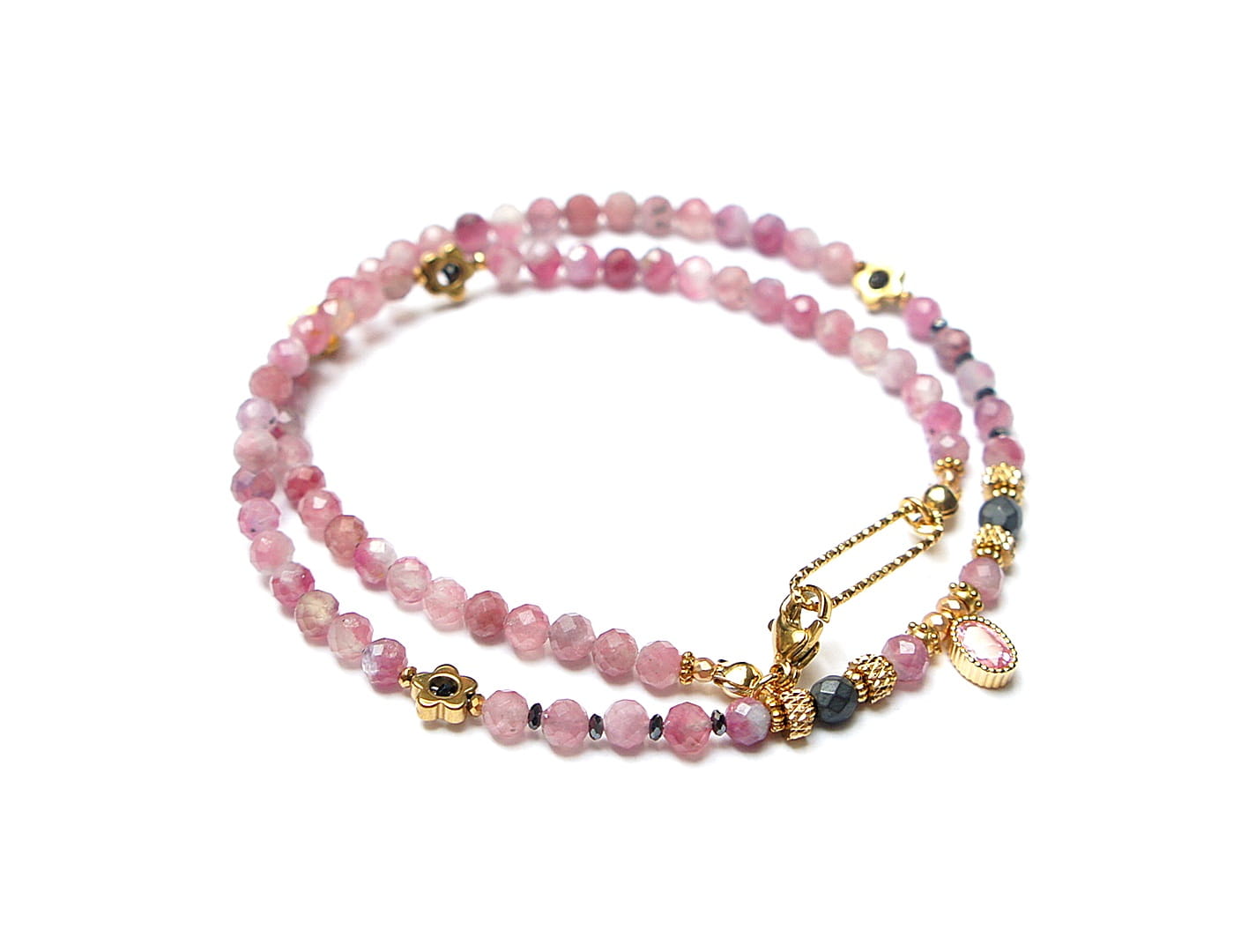 Krótki, delikatny naszyjnik wykonany w całości z pozłacanej stali szlachetnej oraz naturalnych, szlachetnych kamieni - fasetowanych, różowych turmalinów [ok. 3,5mm], przekładek z hematytu [1mm], hematytu fasetowanego, matowego [2mm, 3mm i 4mm] oraz zawieszki z cyrkonią w okuciu. Naszyjnik o długości ok. 42cm.