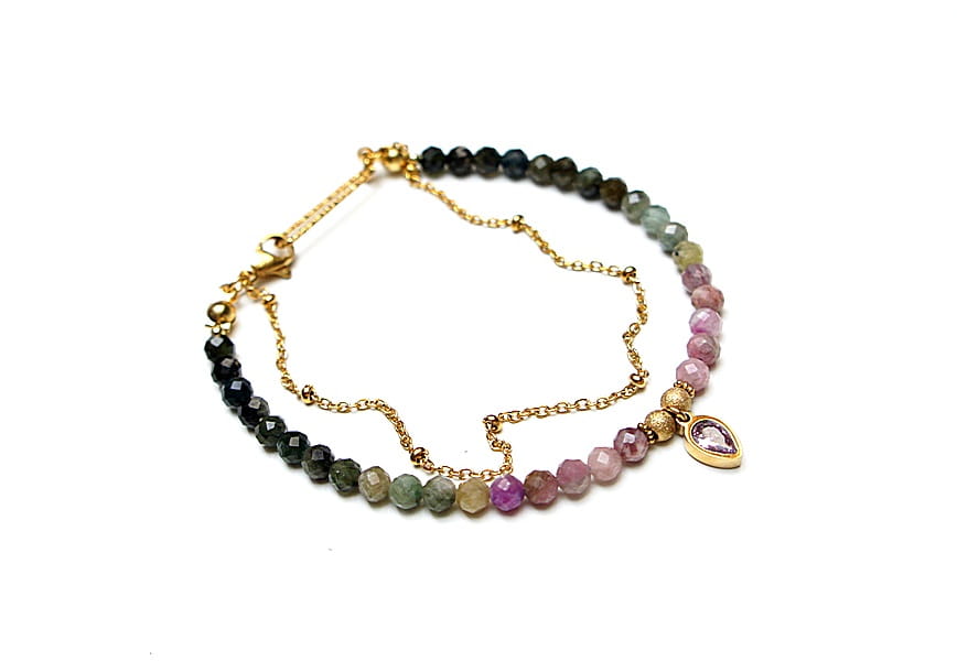 Delikatna bransoletka wykonana w całości ze stali szlachetnej pozłacanej, szlachetnych kamieni - turmalinów fasetowanych [3,5mm] oraz zawieszki z cyrkonią w okuciu. Bransoletka pasuje na nadgarstek 16 - 17cm. Biżuteria ozdobnie zapakowana.
