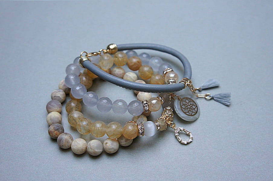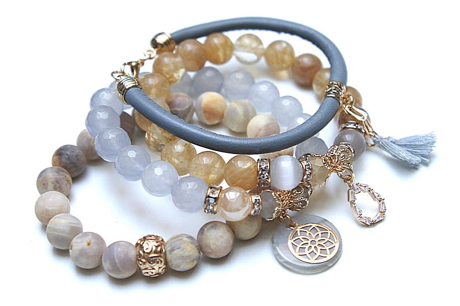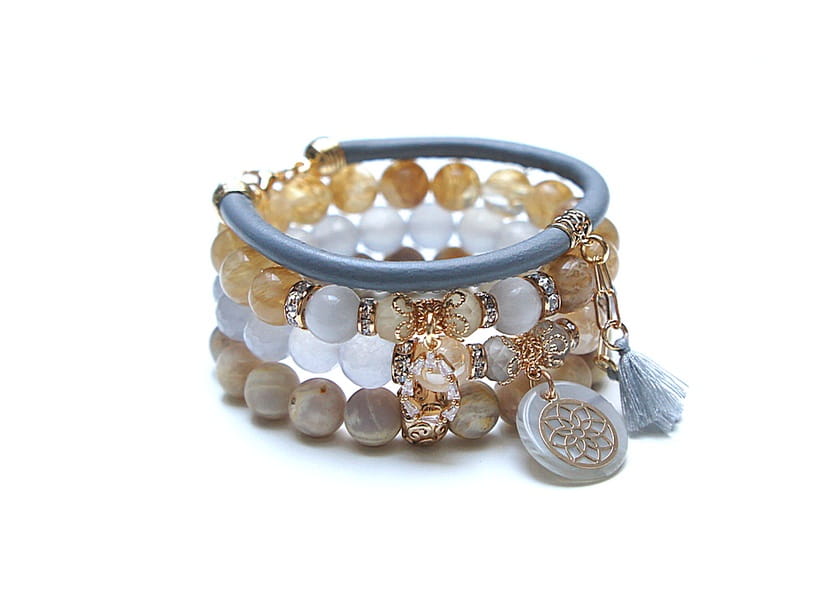Komplet czterech bransoletek wykonanych z naturalnych kamieni: jadeity fasetowane [10mm], kwarc kawowy [10mm], kamień słoneczny matowy [10mm], uleksyt [10mm], kuleczek z opalizującego szkła [10mm], zawieszki wysadzanej cyrkoniami, zawieszki z żywicy, kryształków fasetowanych [8mm], rzemienia z naturalnej skórki [śr. 5mm], chwostów oraz elementów metalowych w kolorze złota. Bransoletki pasują na nadgarstek 16 - 17cm. Biżuteria ozdobnie zapakowana.