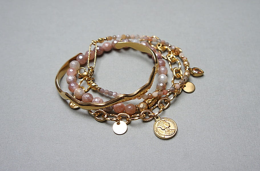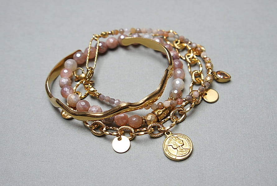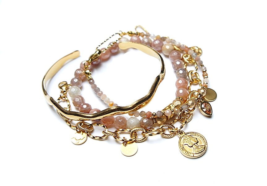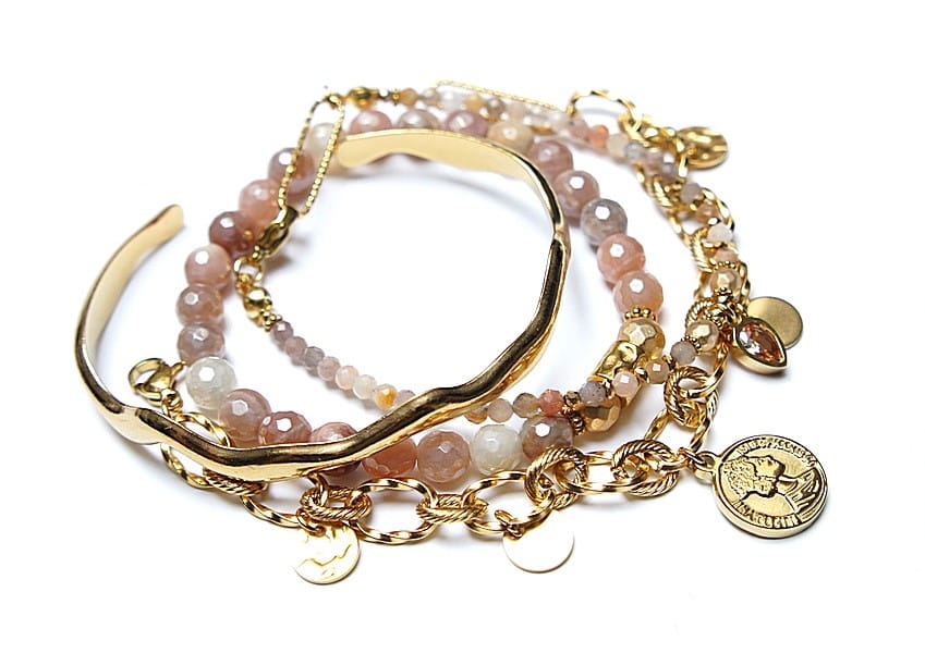 Zestaw czterech bransoletek wykonanych w całości z pozłacanej stali szlachetnej oraz naturalnych, szlachetnych kamieni - kamień słoneczny [2,5mm i 6mm], hematytu fasetowanego, platerowanego [5,5mm oraz 3mm], przekładek z hematytu [1x2mm], zawieszki z cyrkonią w okuciu. Bransoletki pasują na nadgarstek 15cm Biżuteria ozdobnie zapakowana.