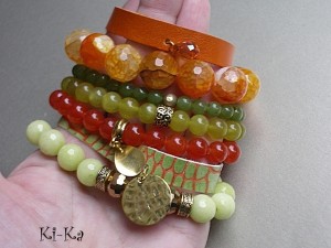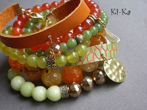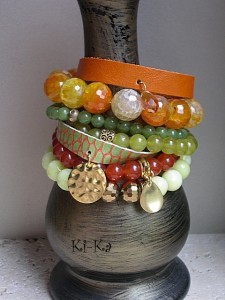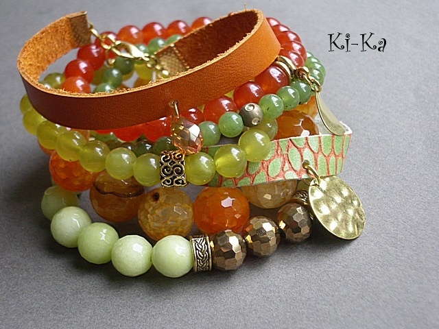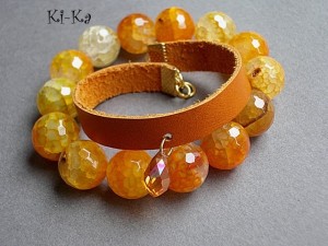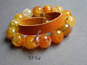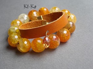 Komplet dwóch bransoletek wykonanych z naturalnej skóry [szer. 10mm], fasetowanych kul agatów o niejednolitym wybarwieniu w kolorze soczystej pomarańczy [14mm] oraz elementów w kolorze złota. Pasują na nadgarstek 16 - 17cm. Biżuteria ozdobnie zapakowana. Bransoletki mogą stanowić komplet z innymi bransoletkami dostępnymi w naszej galerii.