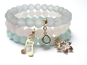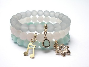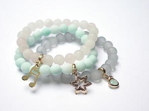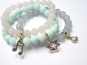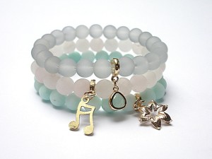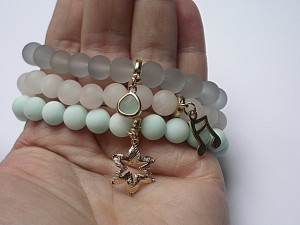 Komplet trzech bransoletek wykonanych z naturalnych kamieni - matowe jadeity [8mm], matowy kwarc różowy [8mm], matowego szkła [8mm], oraz elementów metalowych w kolorze tzw.różowego złota. Pasują na nadgarstek 15,5-16,5cm . Biżuteria ozdobnie zapakowana