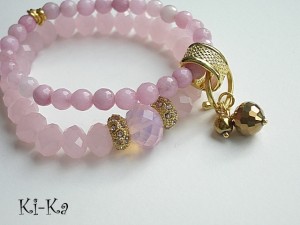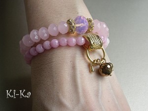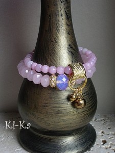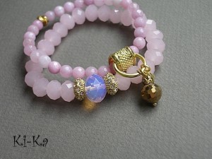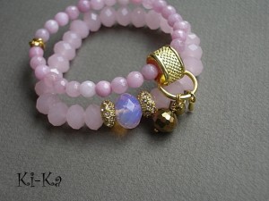 Komplet dwóch bransoletek w pastelowych kolorach wykonanych z kuleczek fasetowanego jadeitu klasy A+ [6mm], fasetowanych, szklanych koralików [luxury; 12mm i 10mm], oponki opalitu [16mm], kuleczki złotego hematytu [6mm] oraz metalowych elementów w kolorze złota . Całość na gumce jubilerskiej. Pasują na nadgarstek 14-16cm. Biżuteria ozdobnie zapakowana.