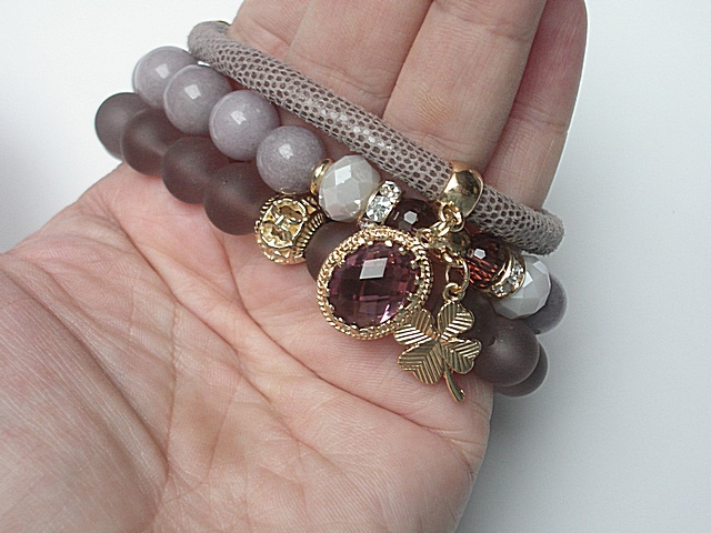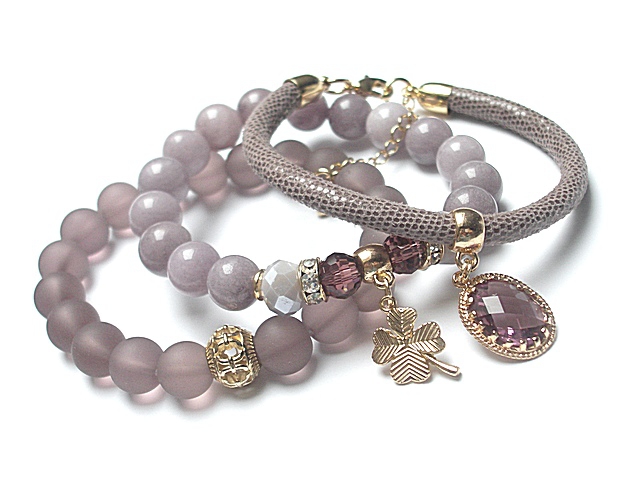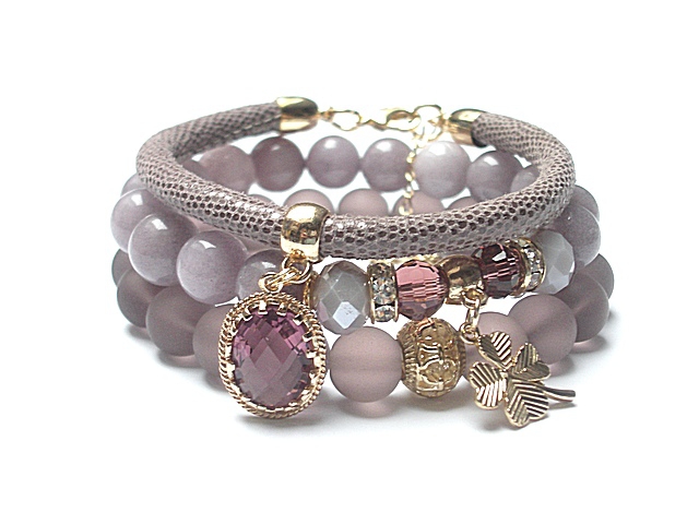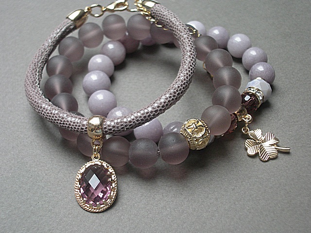 Komplet trzech bransoletek wykonanych z naturalnych kamieni: jadeity [10mm], kryształków [10mm i 8mm], szklanych matowych kuleczek [10mm], rzemienia z naturalnej skóry cielęcej o wężowym wzorze [śr. 6mm], zawieszki w okuciu oraz elementów metalowych w kolorze różowego złota. Bransoletki pasują na nadgarstek 16-17cm. Biżuteria ozdobnie zapakowana. Projekt autorski. Naśladownictwo zabronione. Praca datowana.