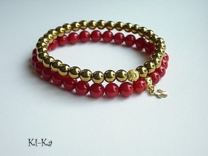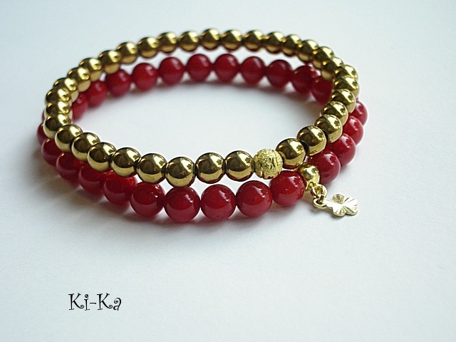 Komplet dwóch bransoletek wykonanych z naturalnych minerałów -złoty hematyt [6mm] ,marmur [6mm] oraz elementów w kolorze złotym . Pasują na nadgarstek 15- 16,5cm. Biżuteria ozdobnie zapakowana.