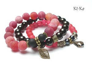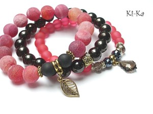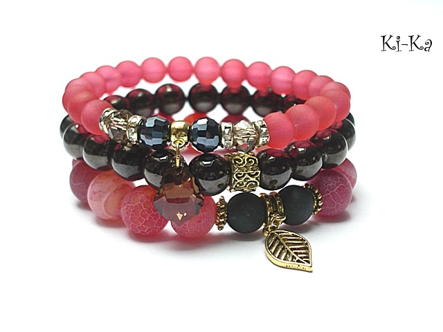 PROJEKTY AUTORSKIE .Komplet trzech bransoletek wykonanych z naturalnych kamieni - agaty trawione [12mm], matowe, kuleczki black stone[10mm] ,szklane perłowe kuleczki w kolorze ciemnej czekolady [10mm] ,szklanych matowych kuleczek [8mm] ,kryształki [8mm] ,zawieszka kryształek Svarovskieo oraz elementów w kolorze złota. Bransoletka na gumce silikonowej. Pasuje na nadgarstek 15,5-16,5cm. Biżuteria ozdobnie zapakowana