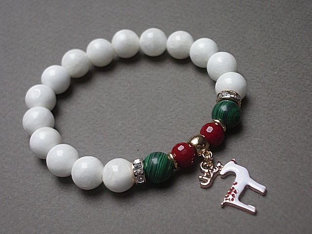 PROJEKTY AUTORSKIE. WŁASNOŚĆ KI-KA. KOPIOWANIE ZABRONIONE. Bransoletka wykonana z naturalnych kamieni - jadeity[10mm], malachit rekonstruowany [10mm], kryształków fasetowanych [8mm] oraz elementów metalowych w kolorze tzw. różowego złota. Bransoletka na gumce silikonowej. Pasuje na nadgarstek 16-17cm. Biżuteria ozdobnie zapakowana. Możliwość dopasowania bransoletki do nadgarstka - wcześniej prosimy o kontakt
