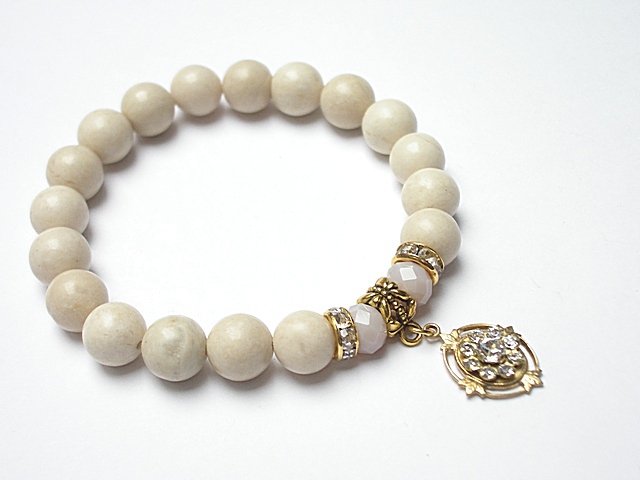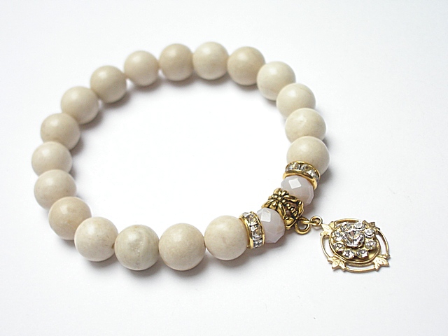 PROJEKTY AUTORSKIE .WŁASNOŚĆ KI-KA. Bransoletka wykonana z naturalnych kamieni - kule marmuru [10mm] kryształków fasetowanych [8mm] ,przekładek z cyrkoniami,zawieszką Swarovski elements [crystal] oraz elementów w kolorze złota. Bransoletka na gumce silikonowej. Pasuje na nadgarstek 16-17cm. Biżuteria ozdobnie zapakowana. Możliwość dopasowania bransoletki do nadgarstka - wcześniej prosimy o kontakt.